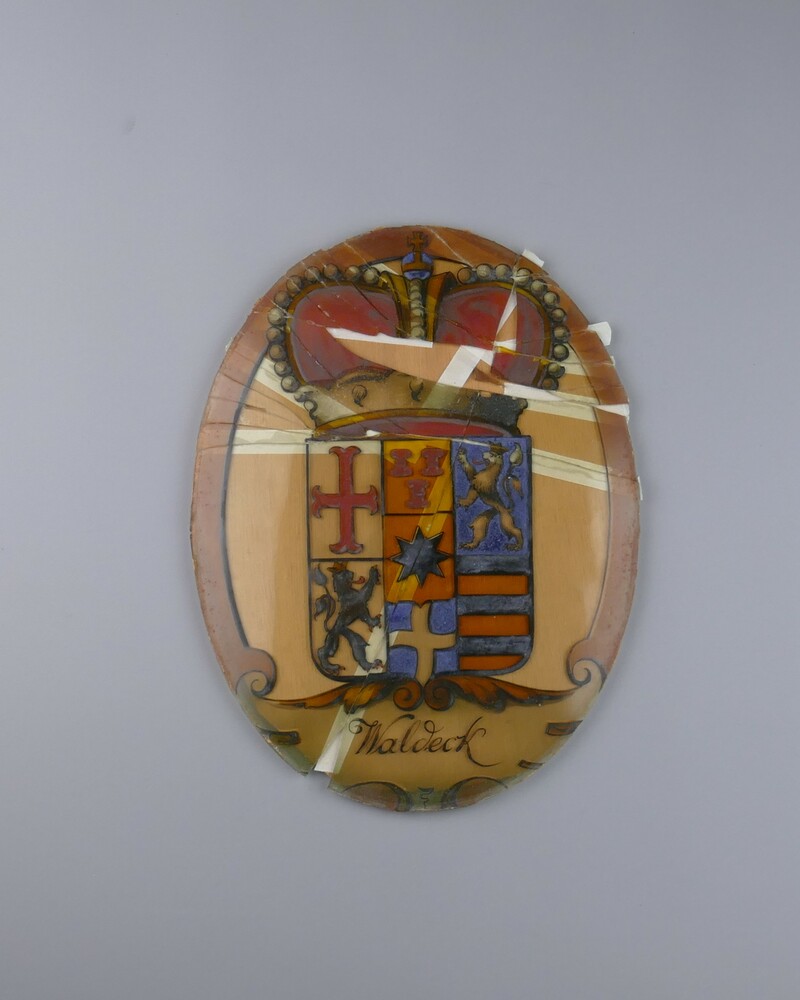 Medaillon van gebrandschilderd glas voorstellende he...