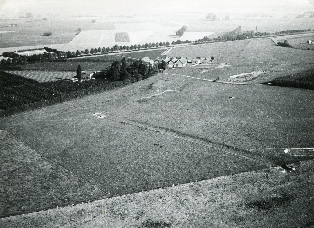 Zwart-wit luchtfoto van de Eltenseweg te Lobith ca. ...