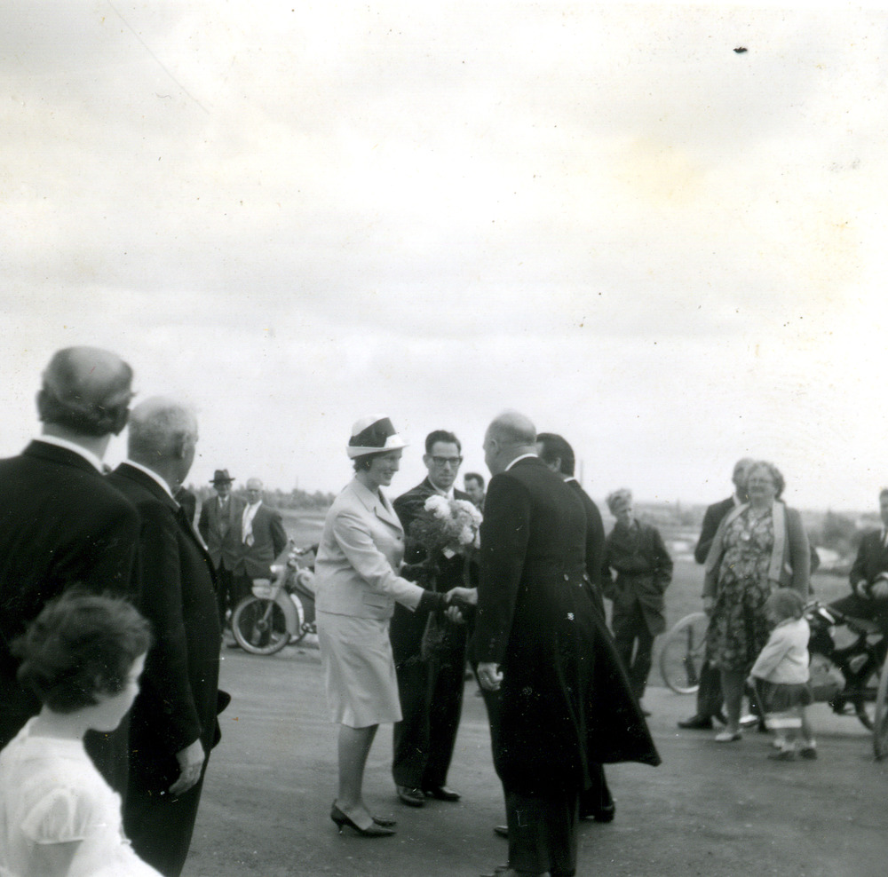 Zwart-wit foto van de opening van de huishoudschool ...