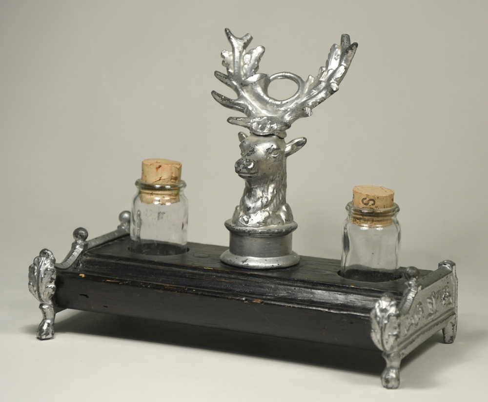 Inktstel van hout, metaal en glas bestaande uit een ...
