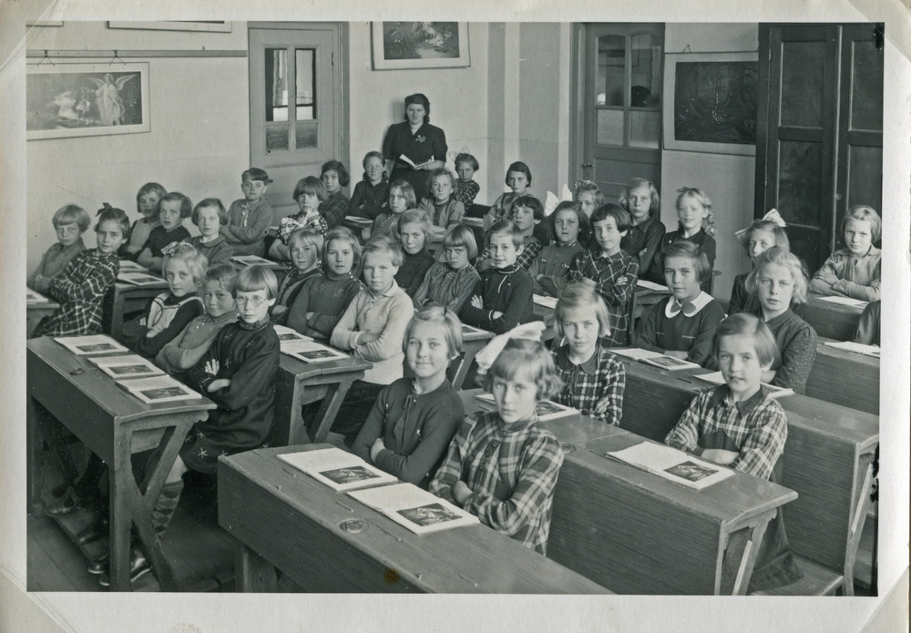 Zwart-wit foto genomen in een klas van de meisjessch...