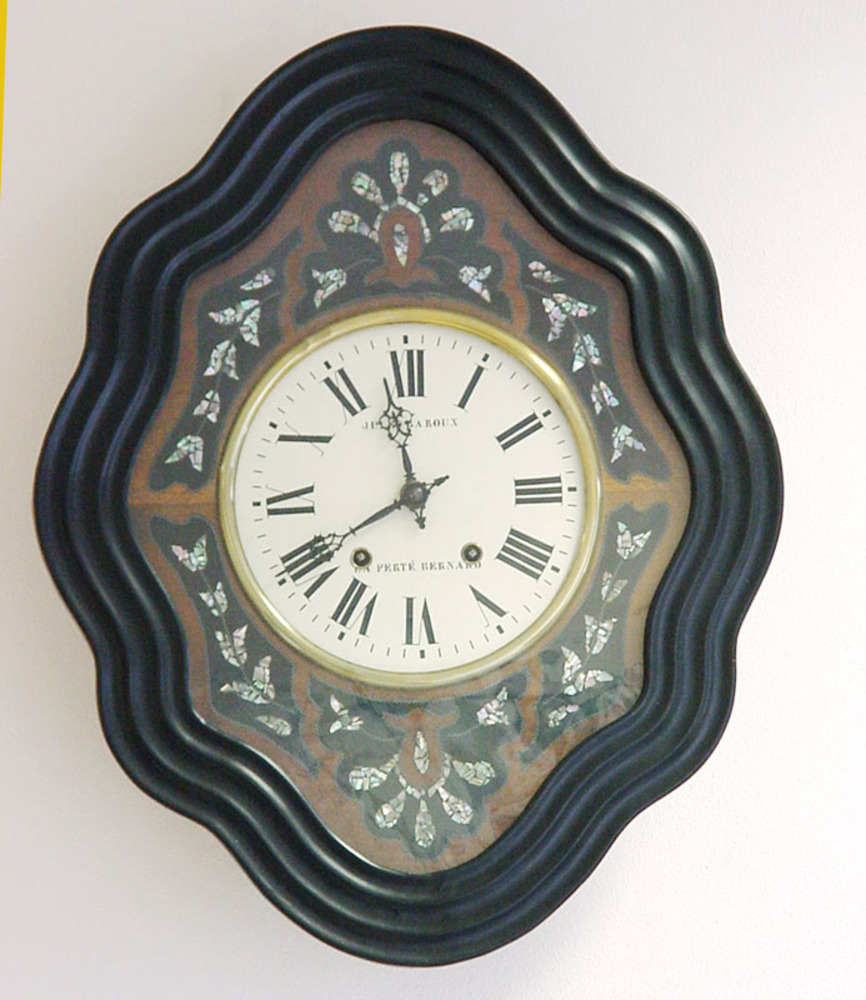 Wandklok van hout, messing, parelmoer en glas door J...