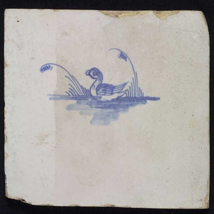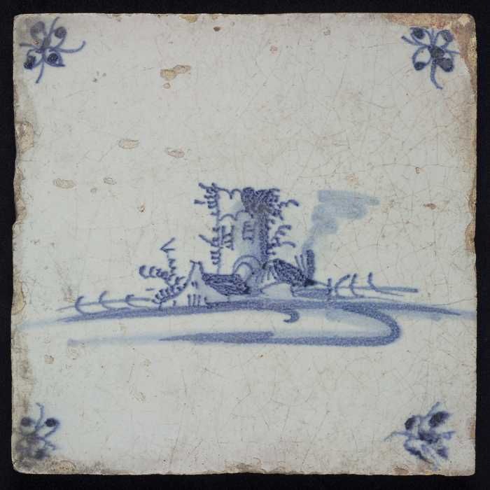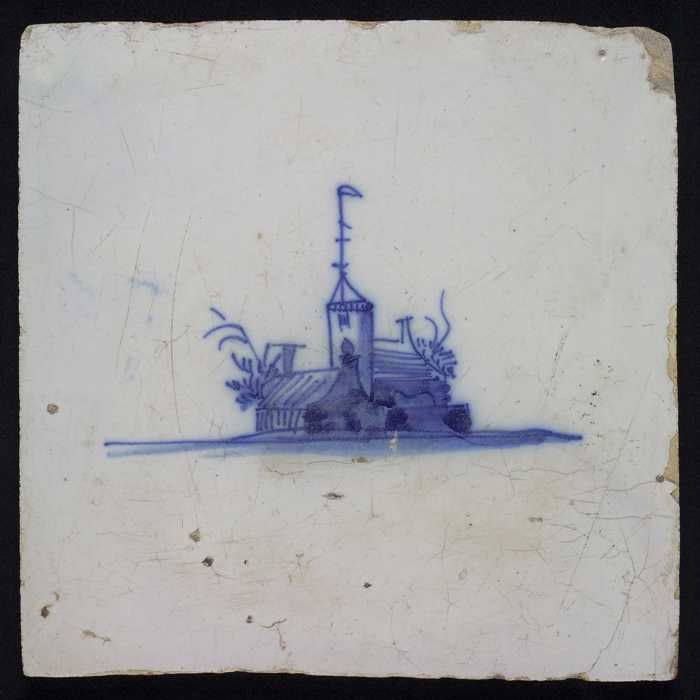 Tafereeltegel, blauw, huis met toren, hoekmotief spin