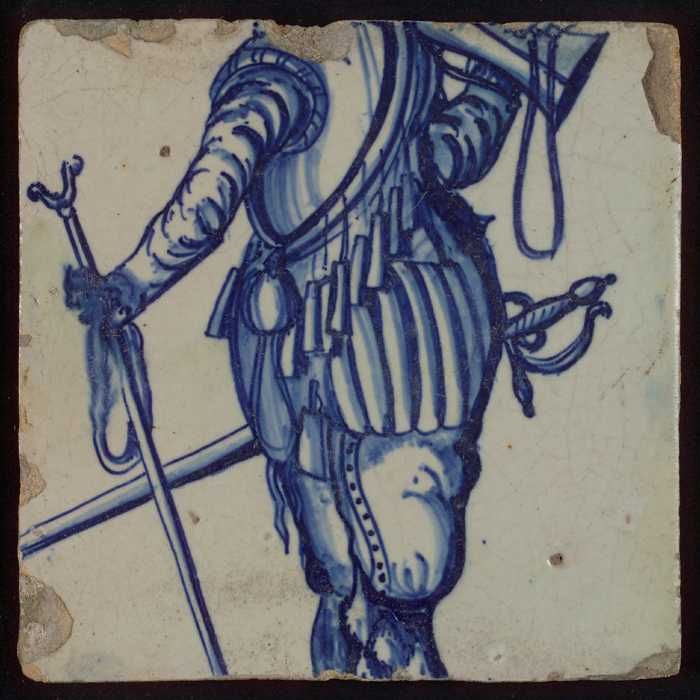 Tafereeltegel, blauw, toren met huizen, hoekmotief spin