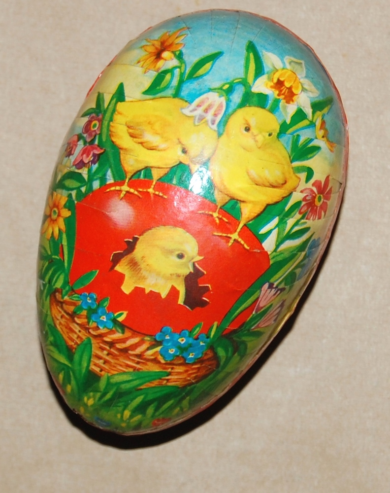 Twee delig paas-ei van karton beplakt met een afbeel...