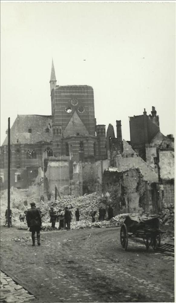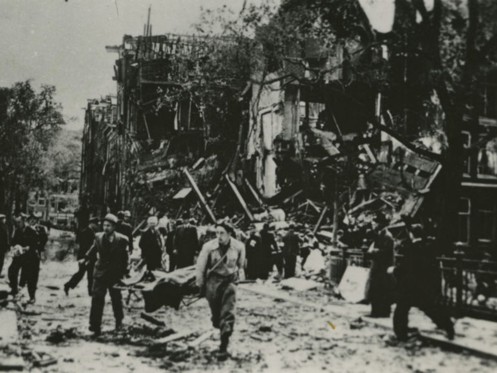 Foto van puinhoop van huis na bominslag met ervoor b...