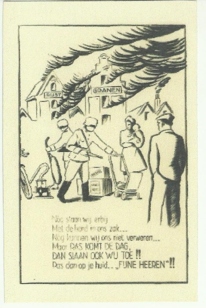 rijen huizen met er achter rook. Tekst: "Brandend R'...
