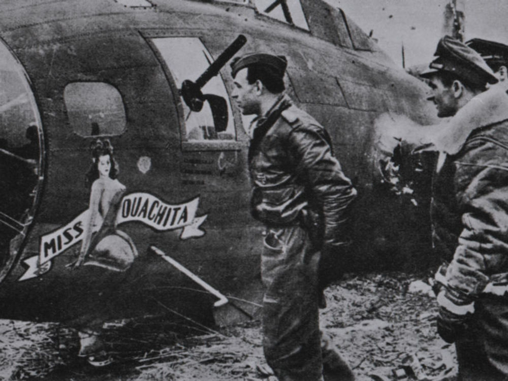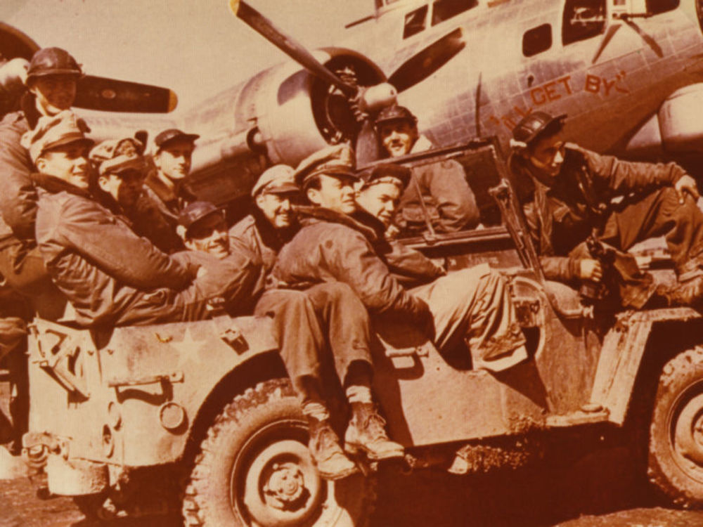 Foto van negen mannen in Amerikaanse vliegerkledij i...