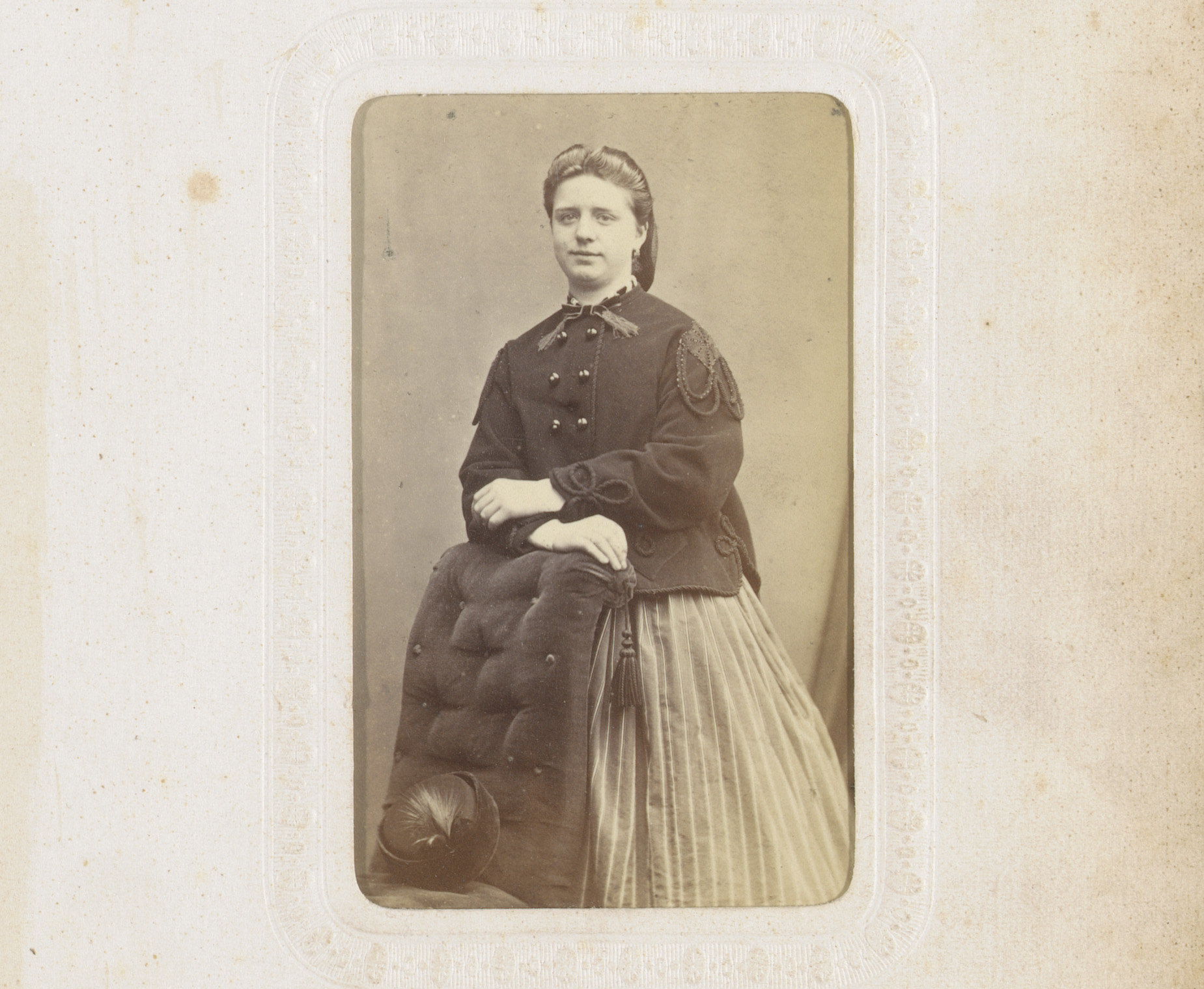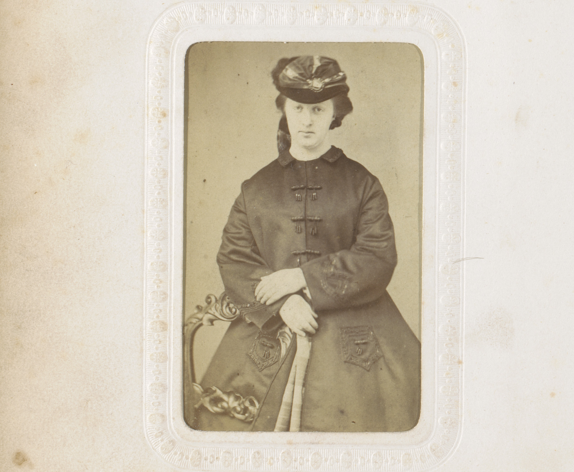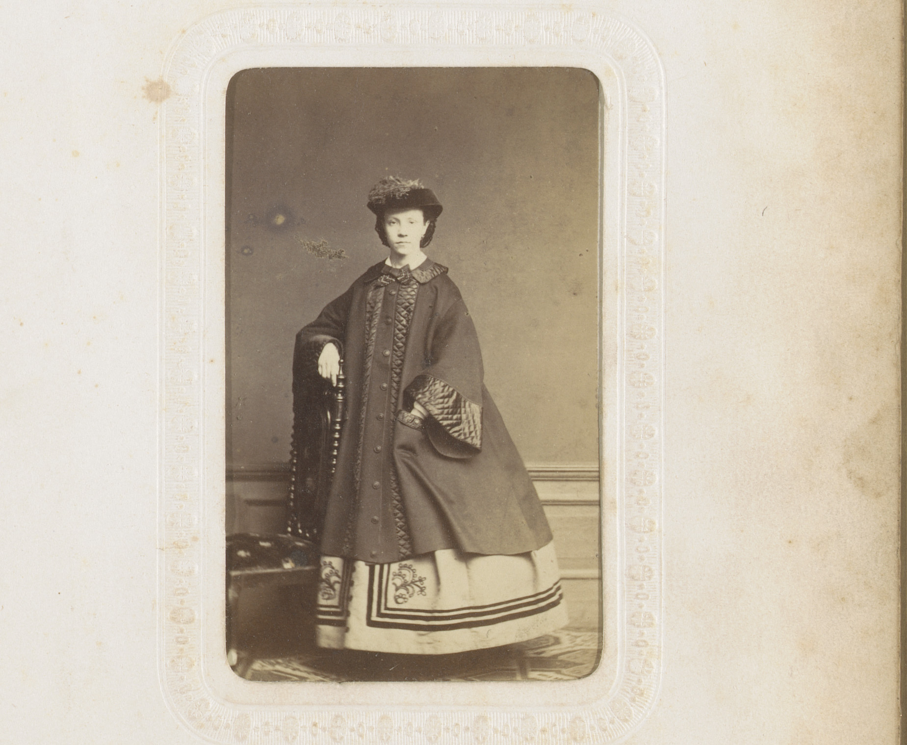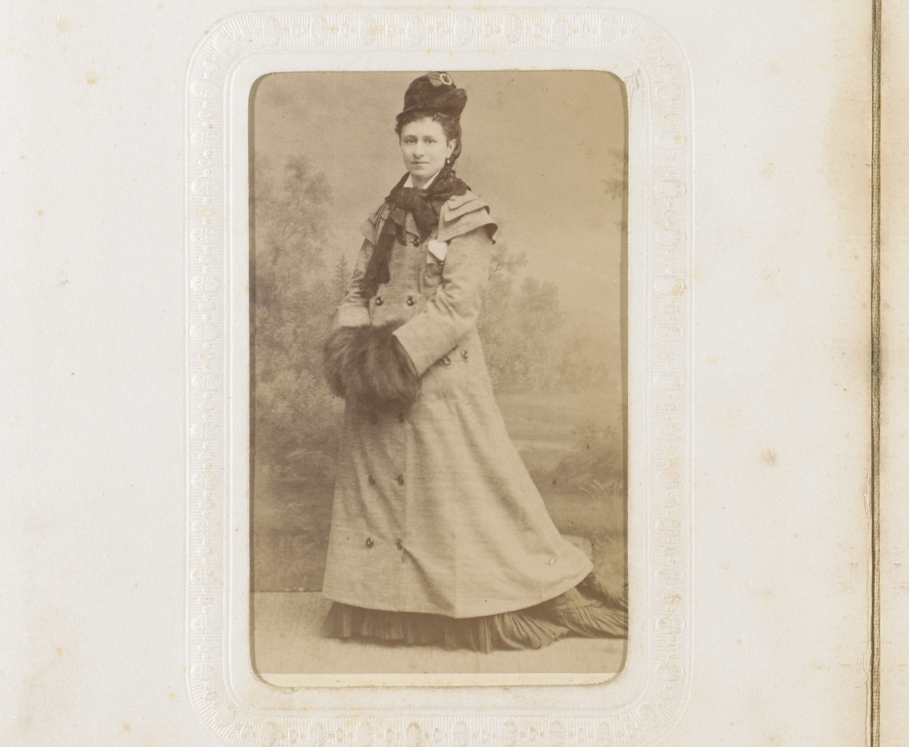 Portret van een staande vrouw met mantel, hoed en mof