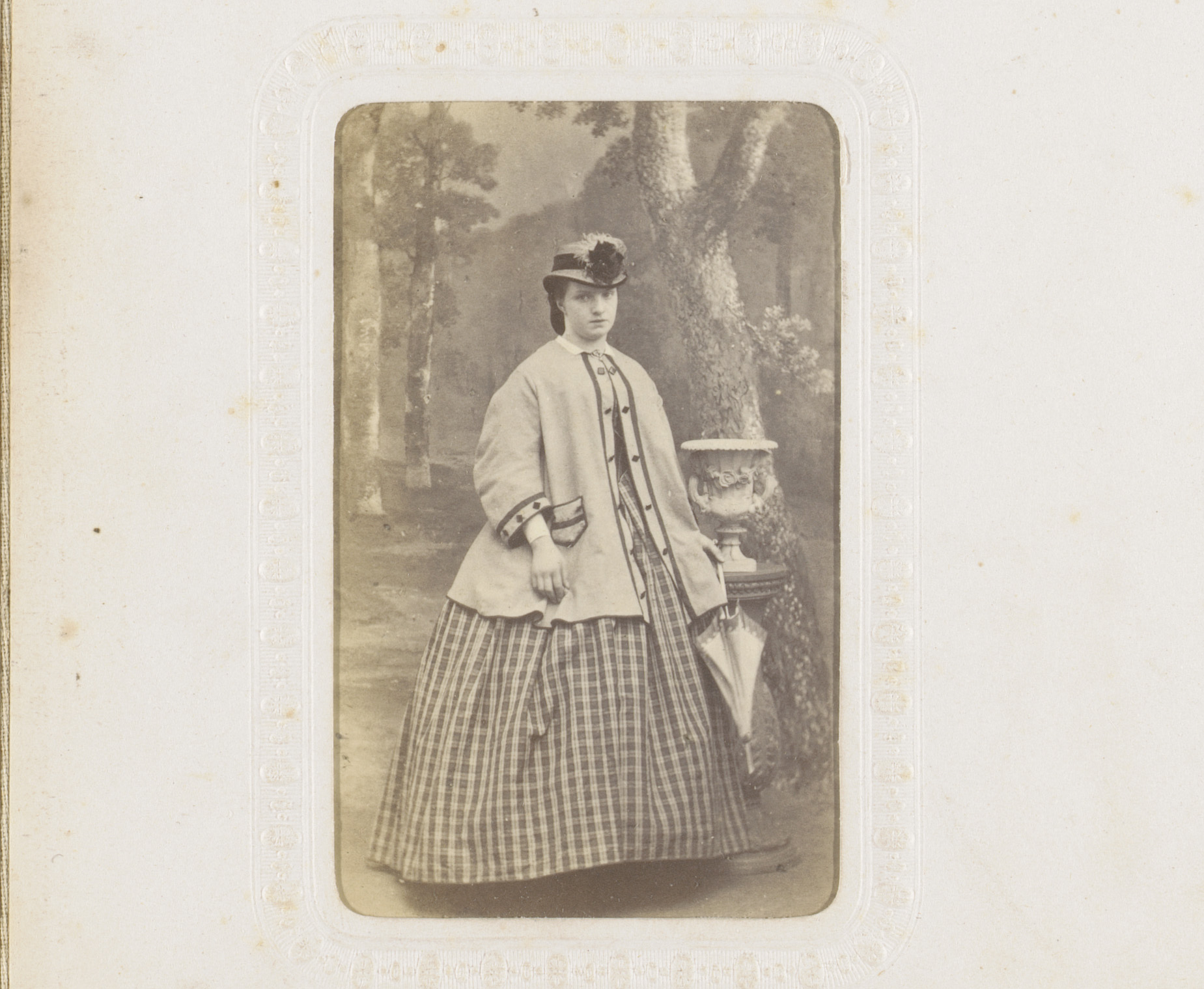 Portret van een vrouw met hoed, mantel en paraplu, s...
