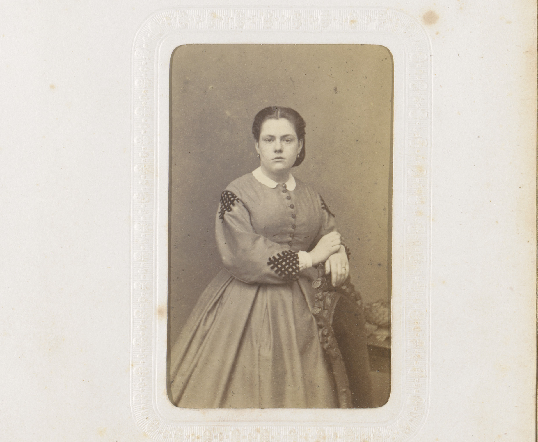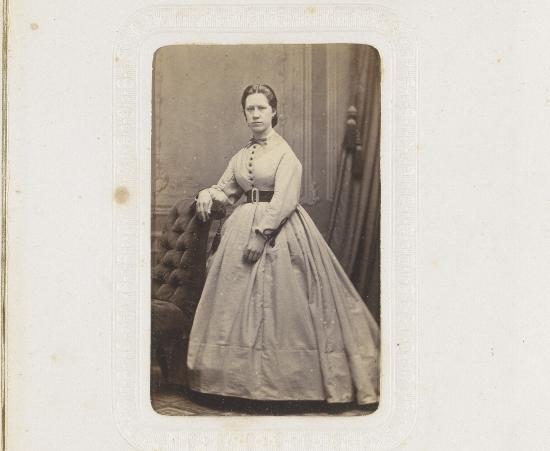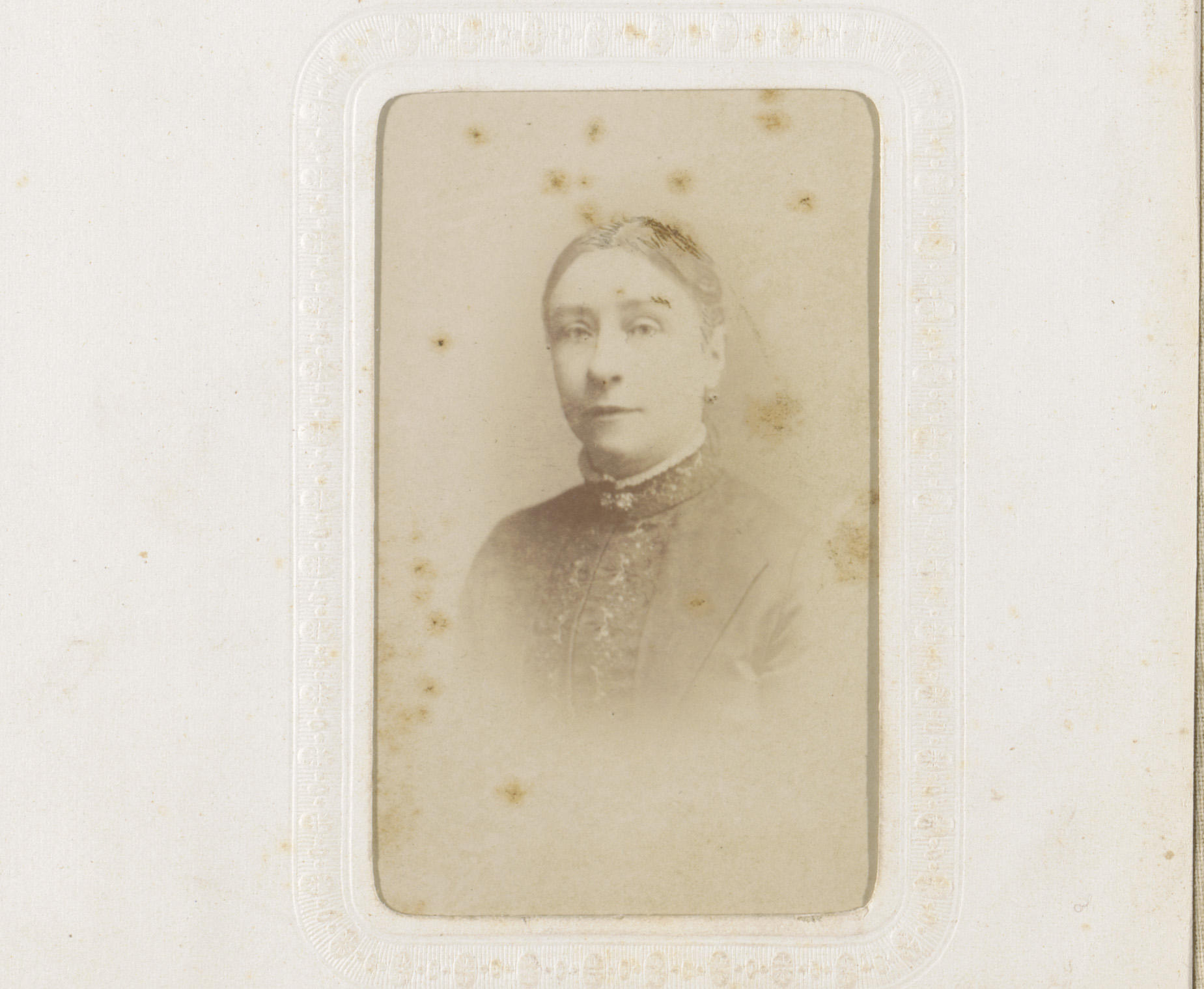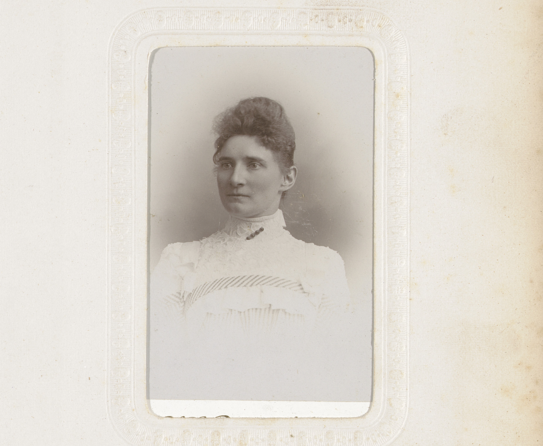 Portret van een vrouw in hooggesloten witte jurk
