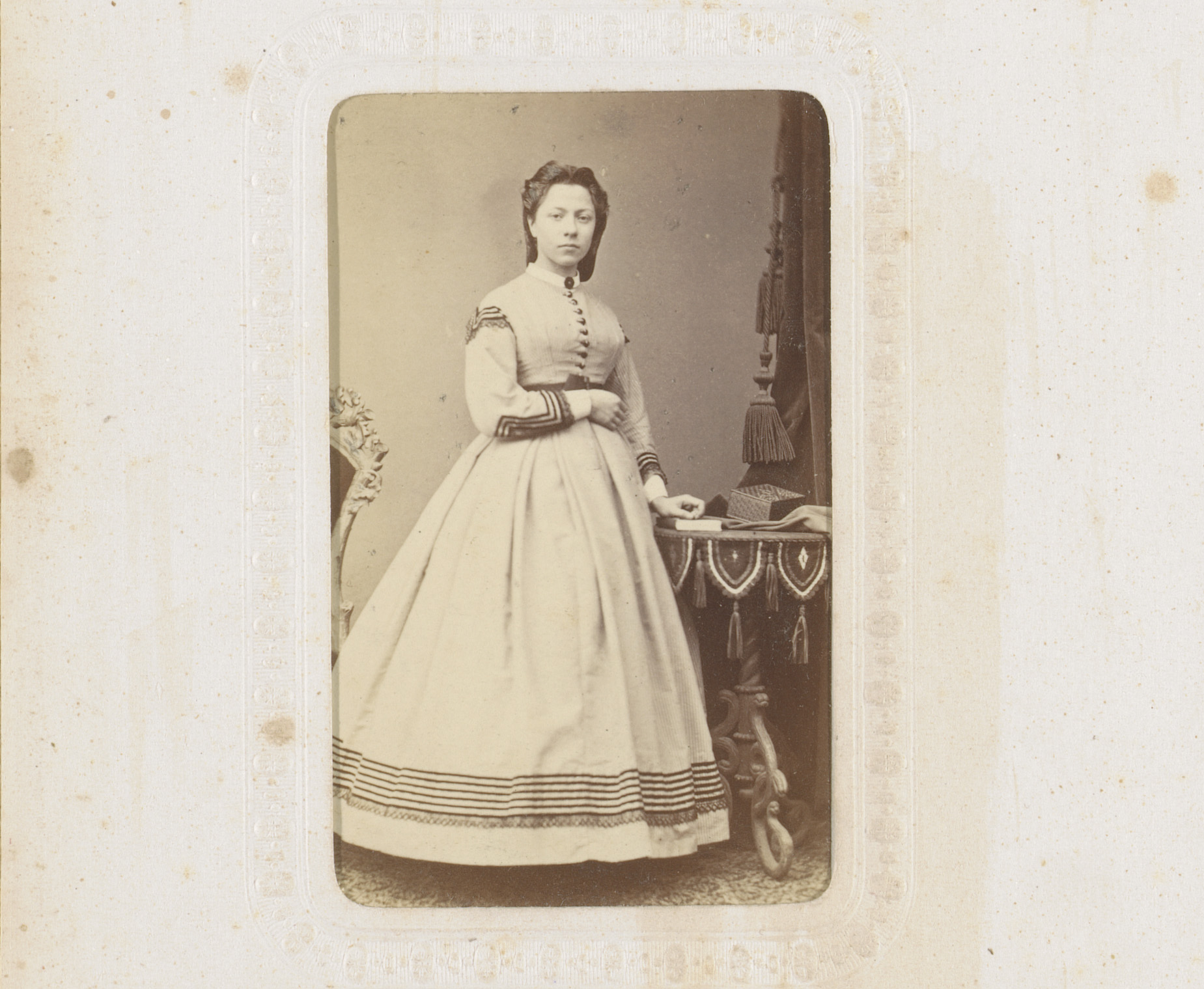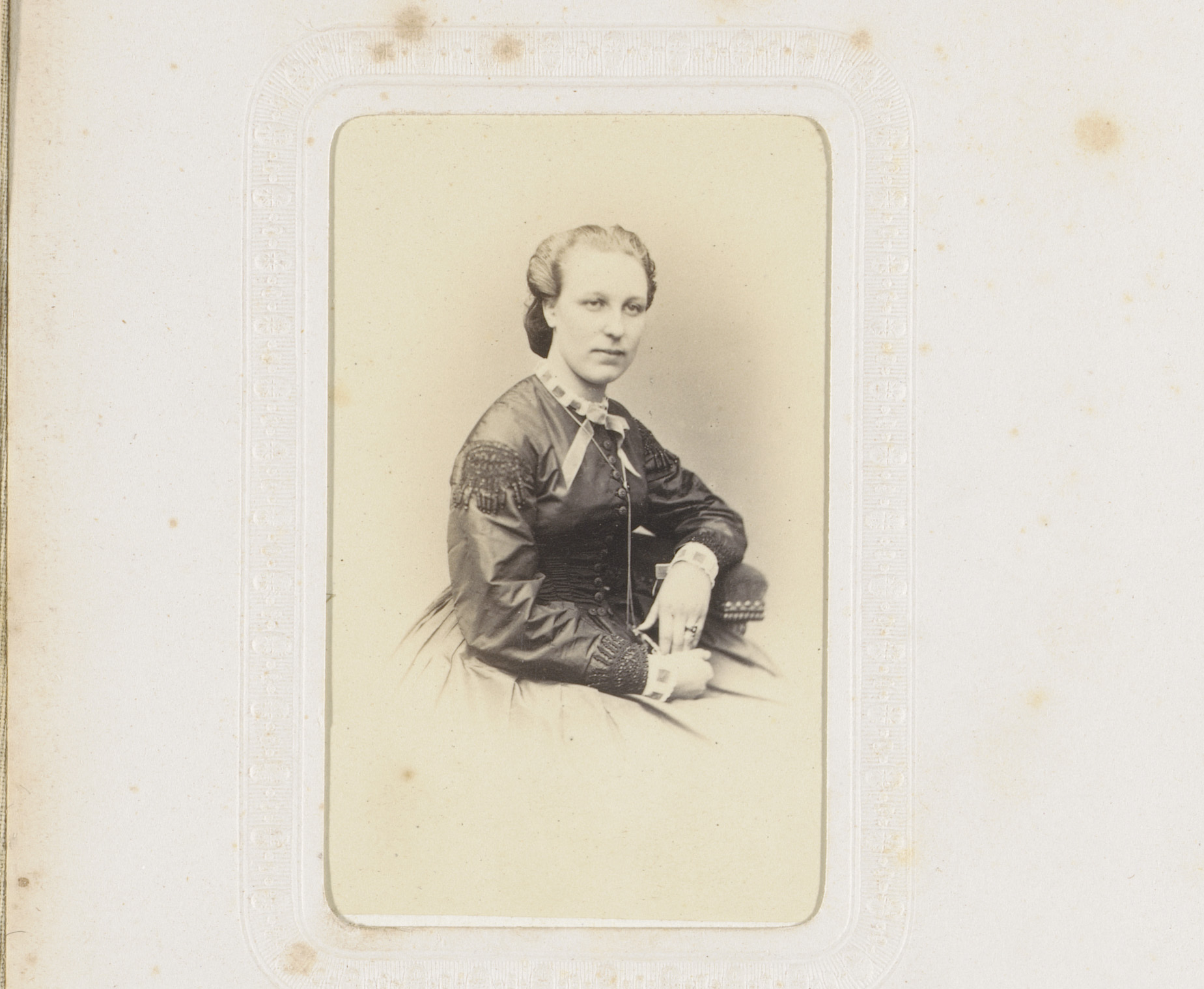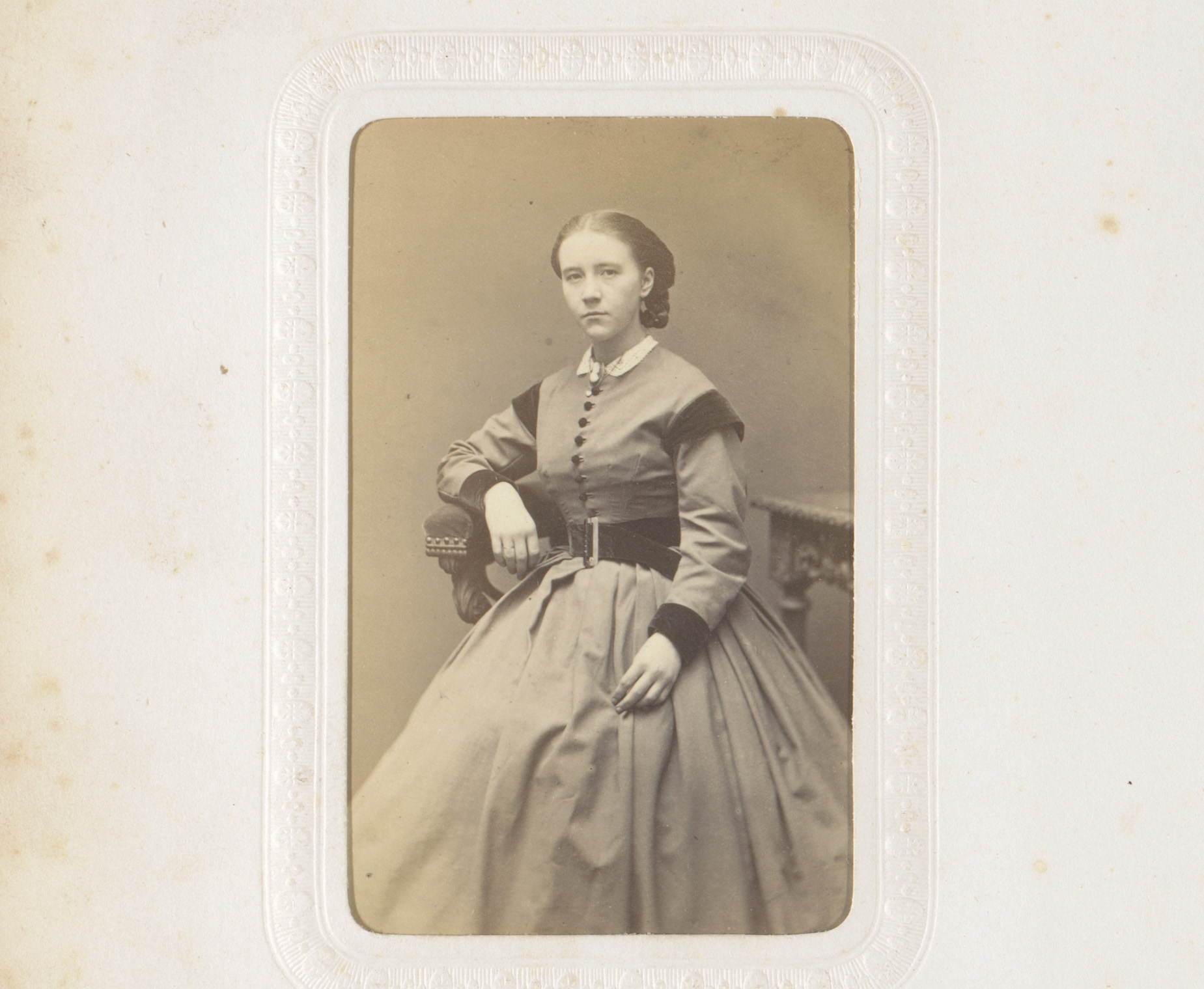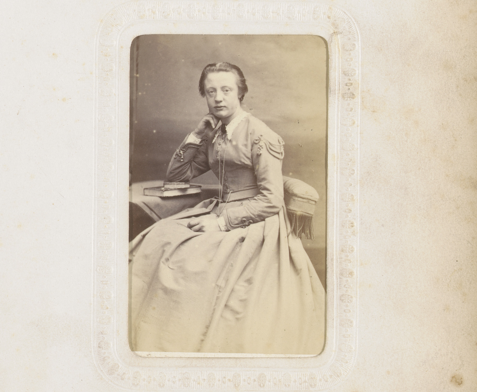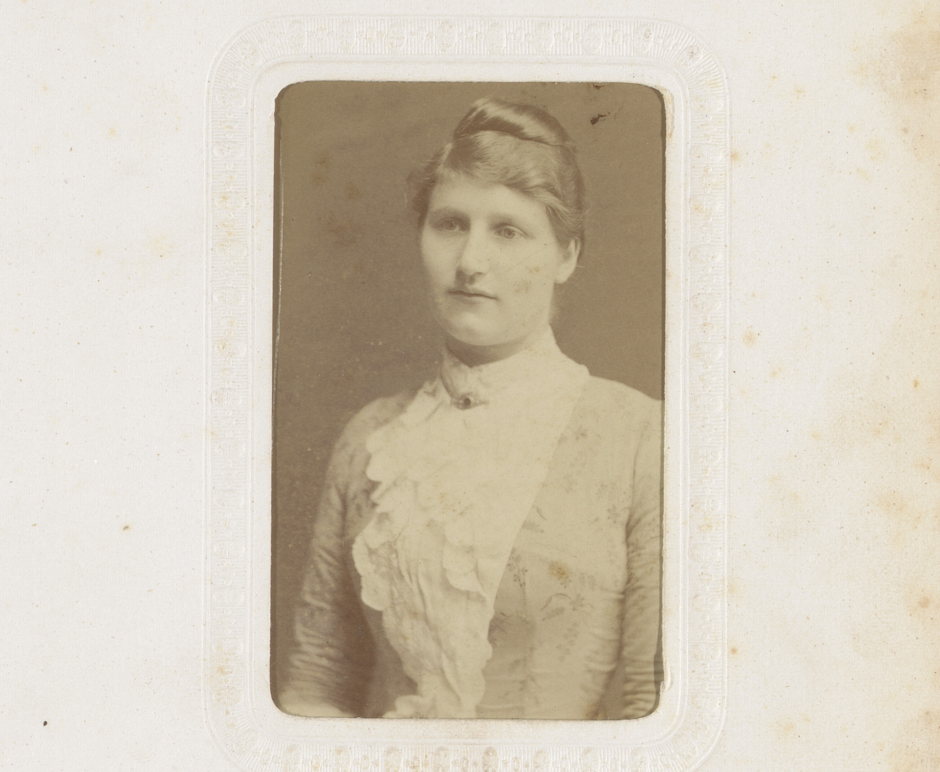 Portret van een vrouw in hooggesloten witte jurk