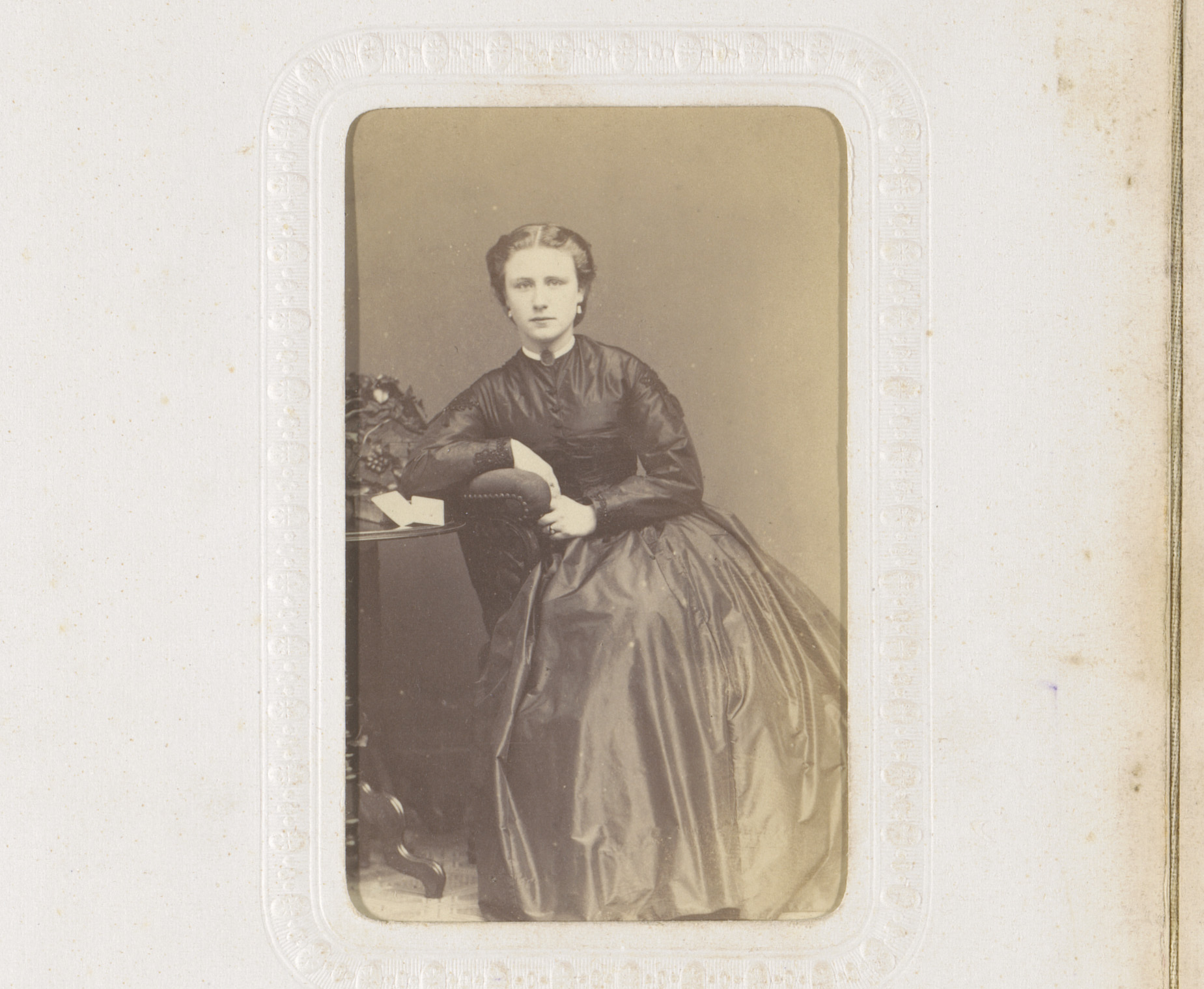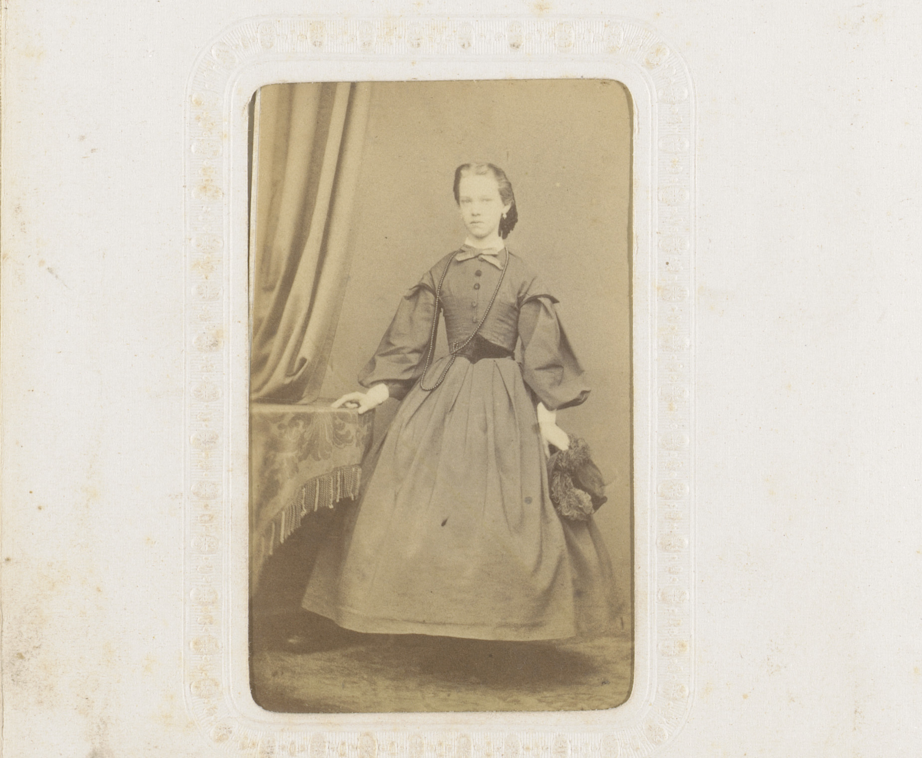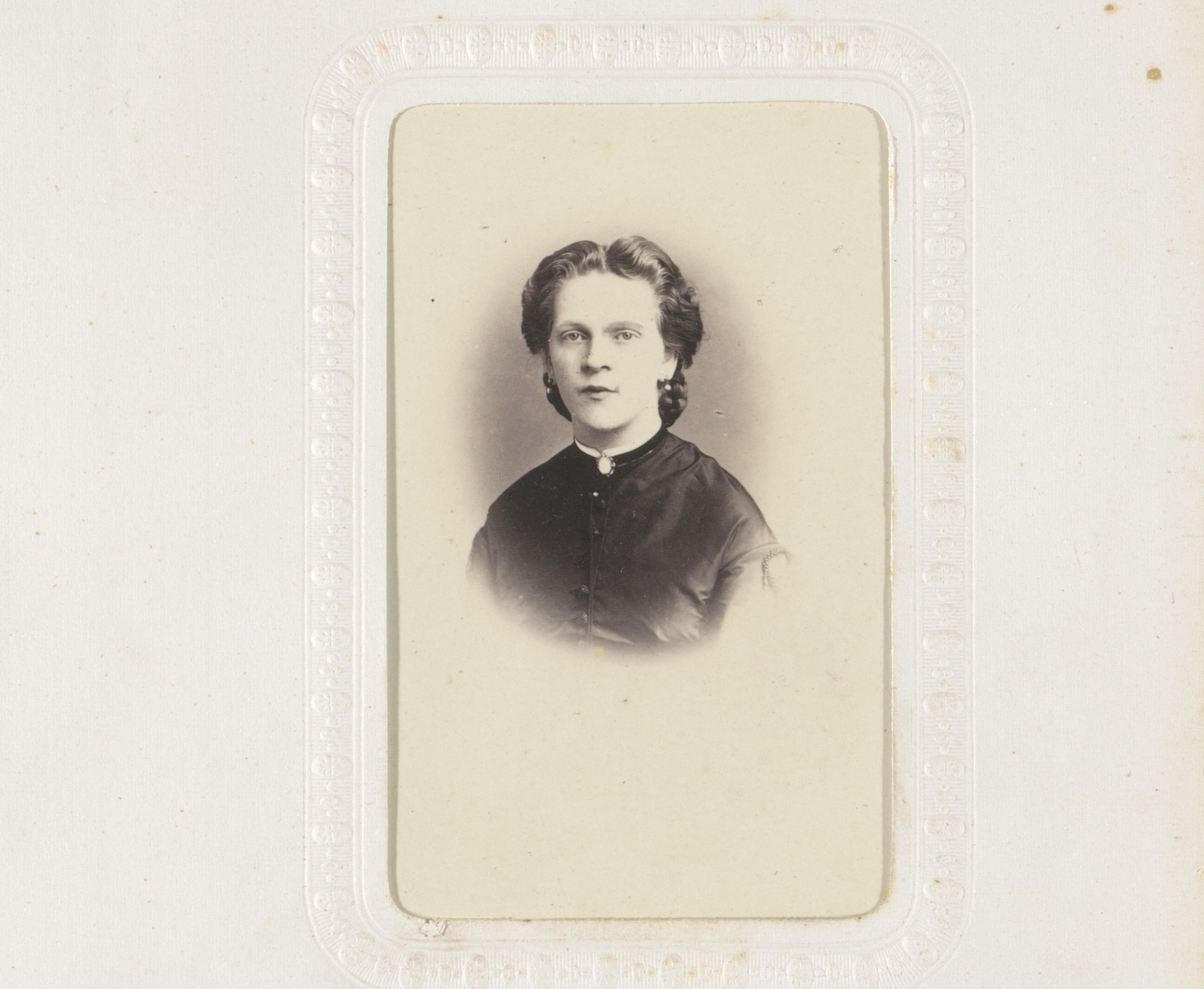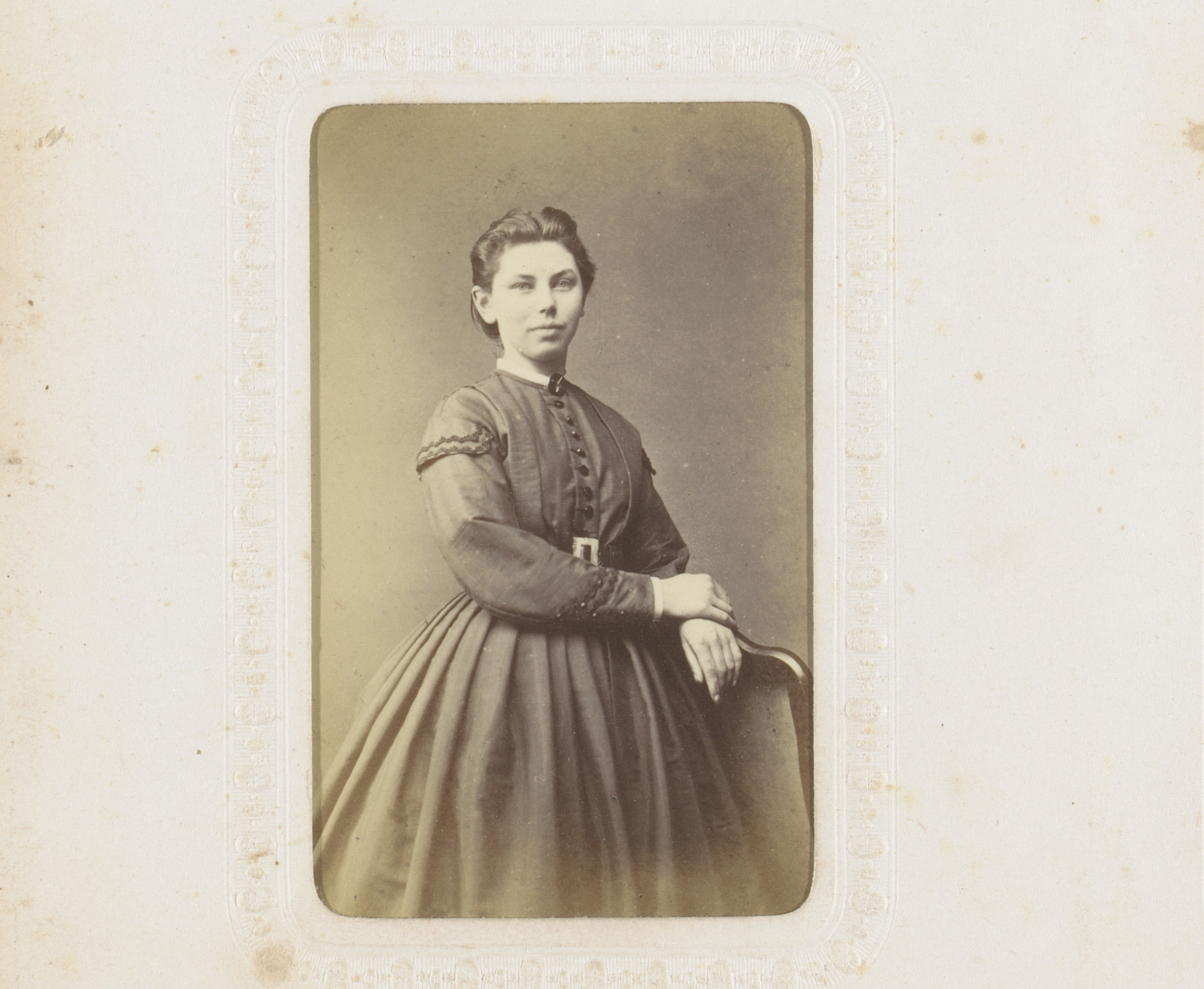 Portret van een vrouw in hooggesloten witte jurk