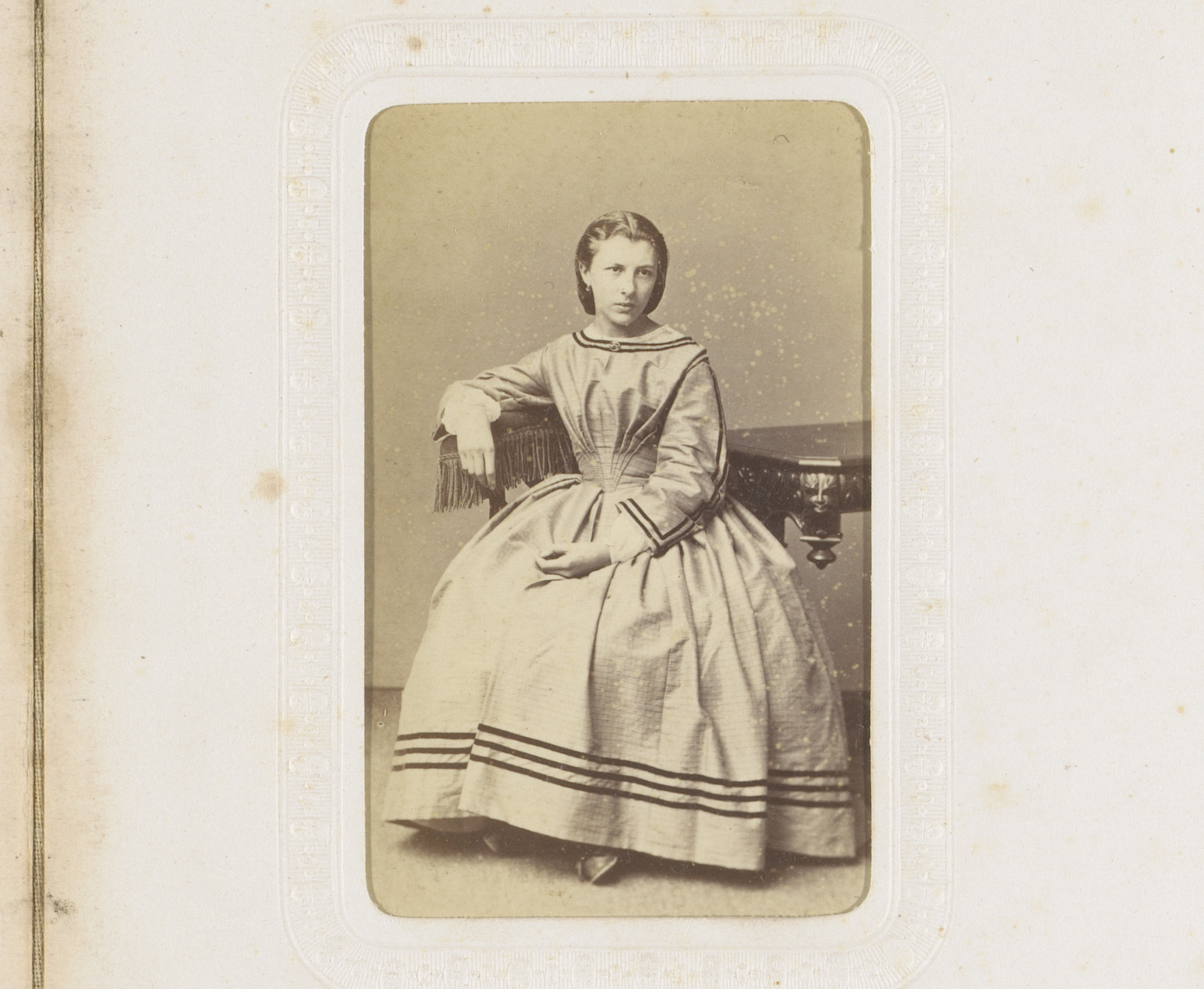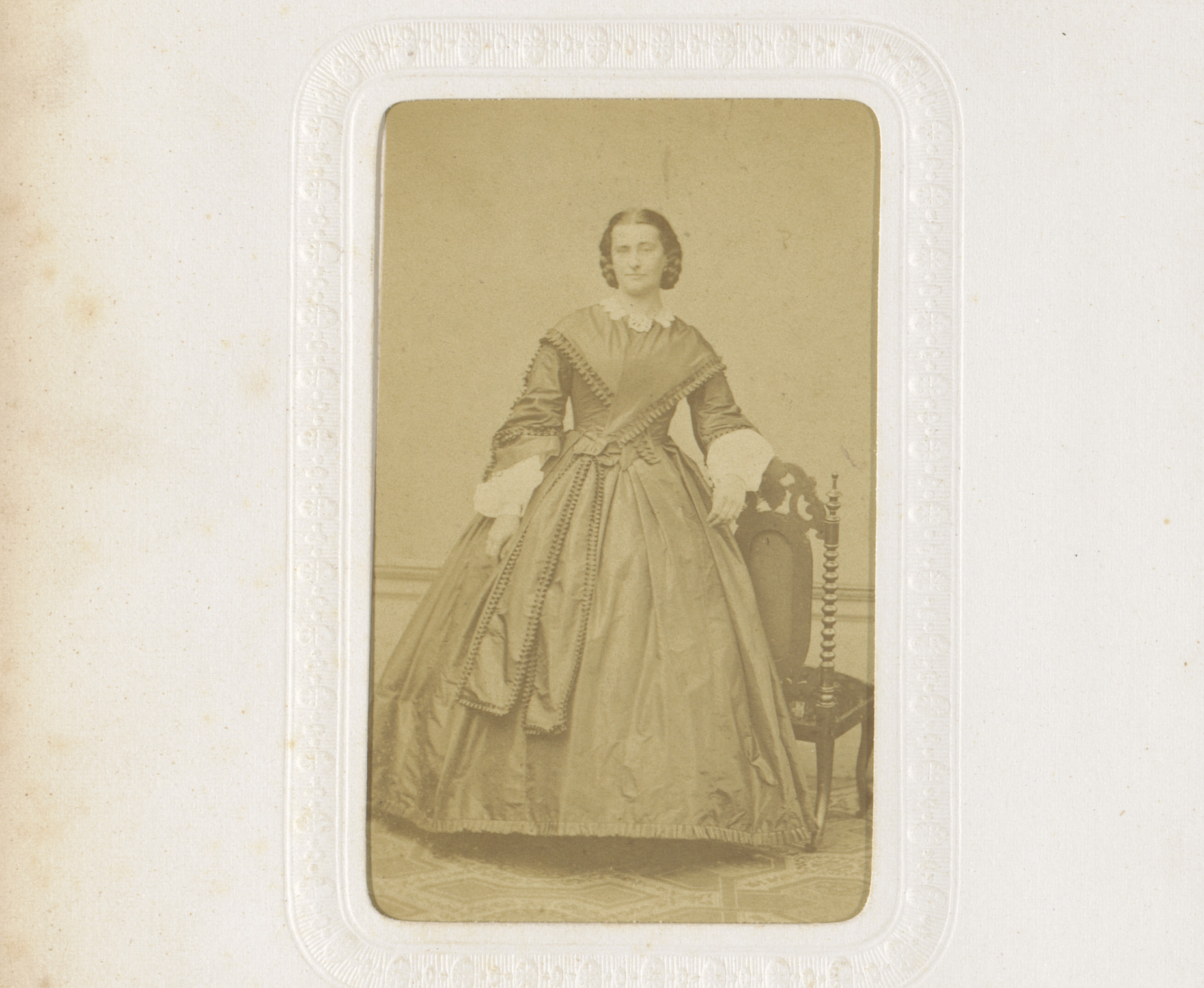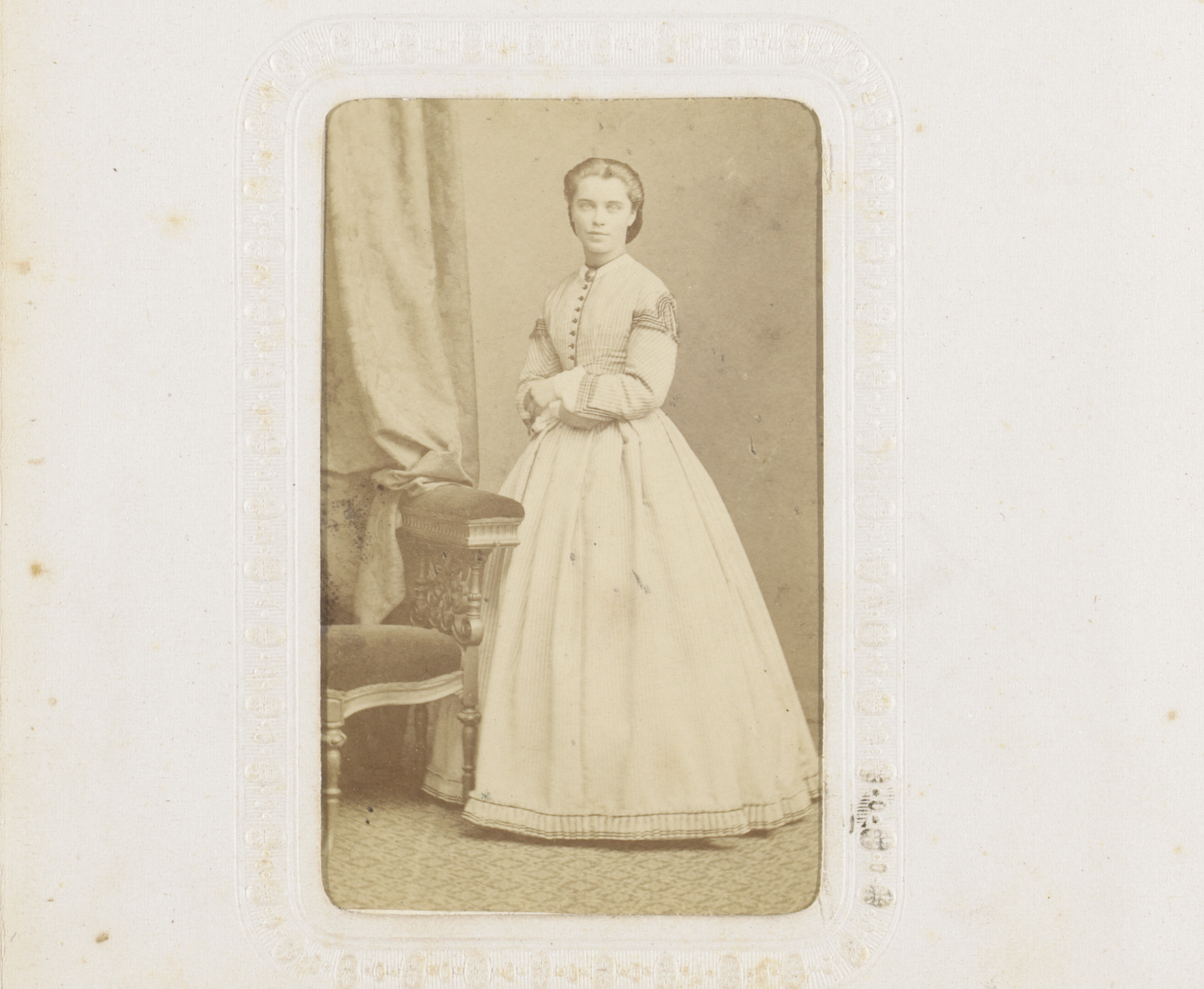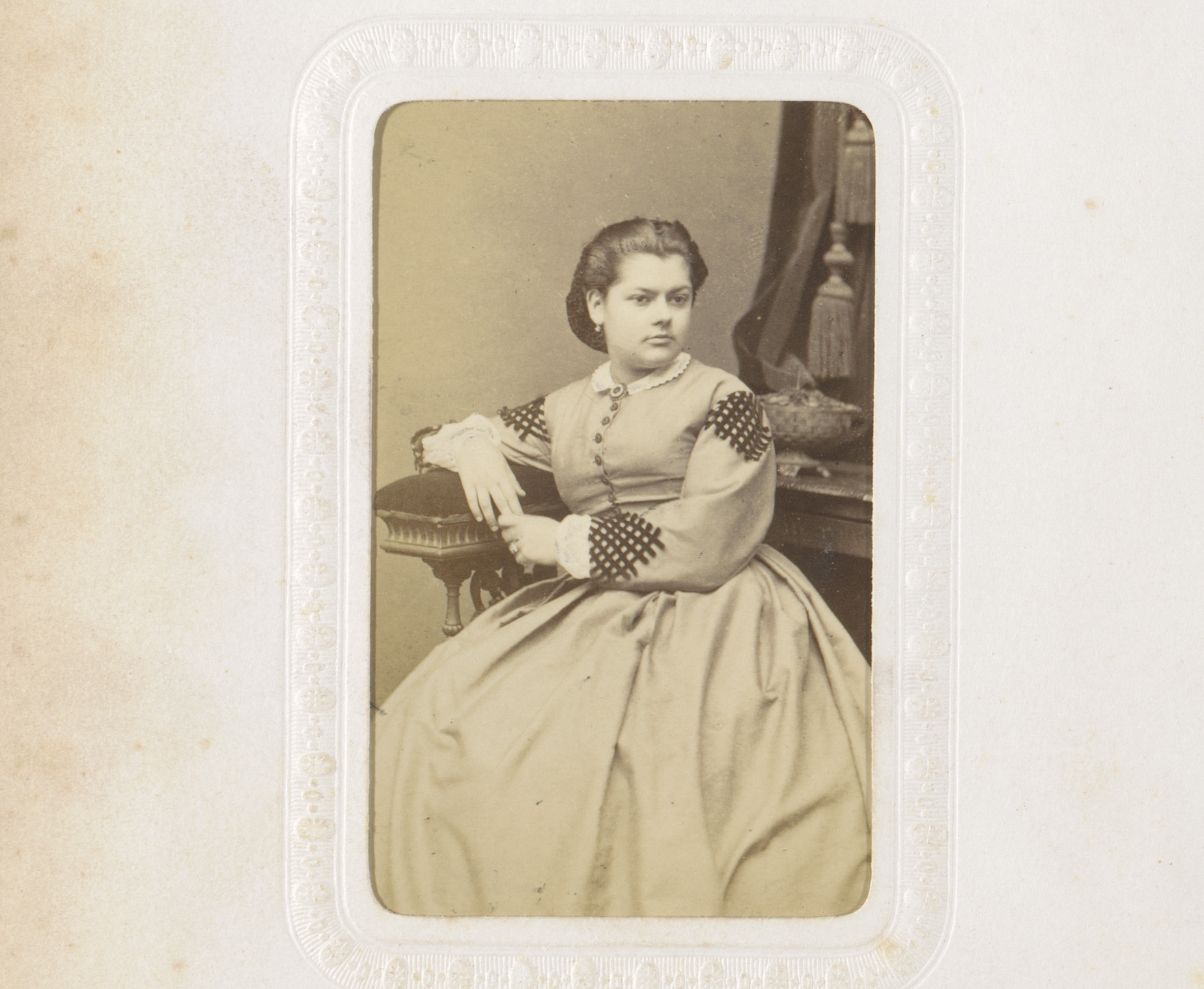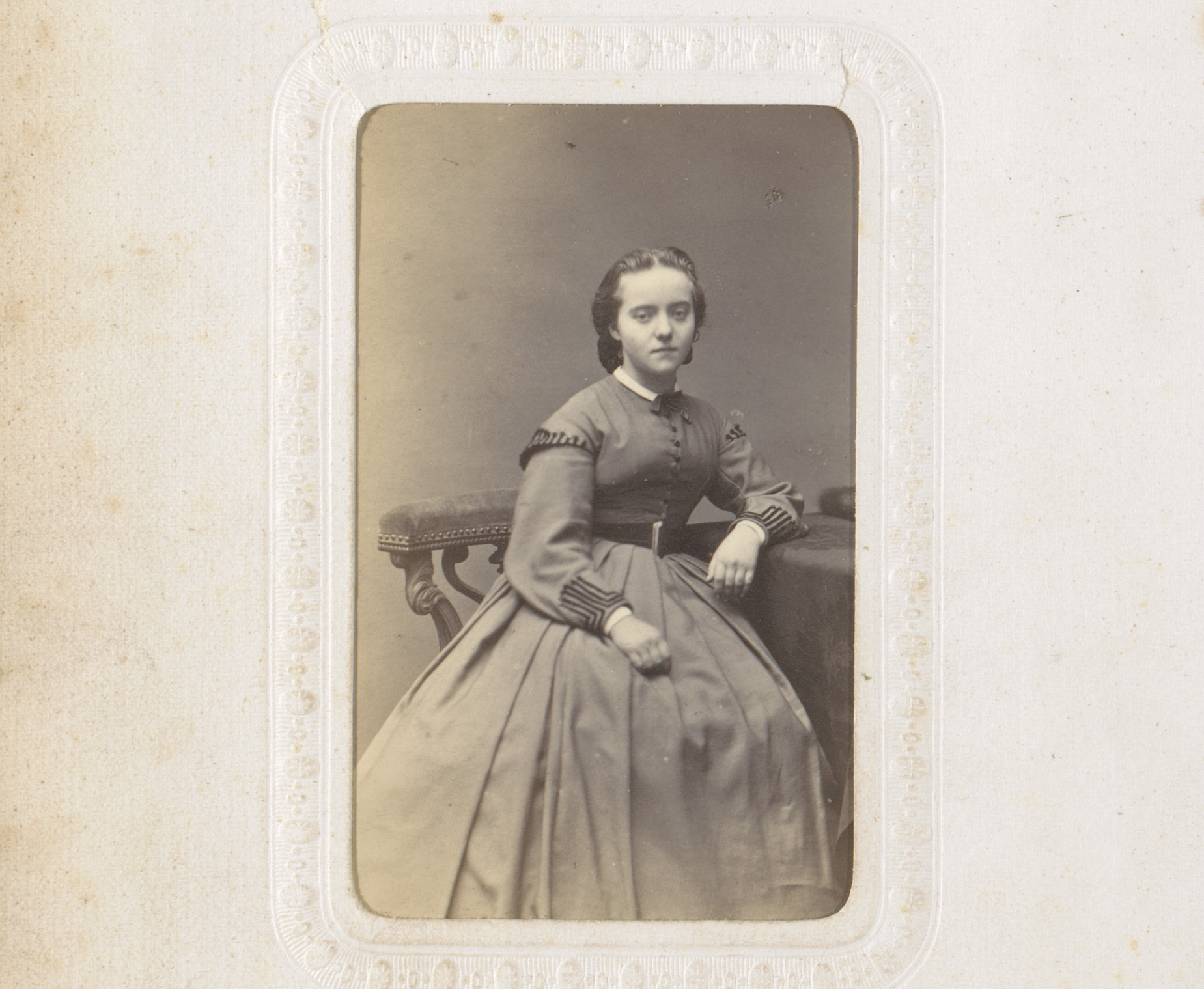 Portret van een vrouw in hooggesloten witte jurk