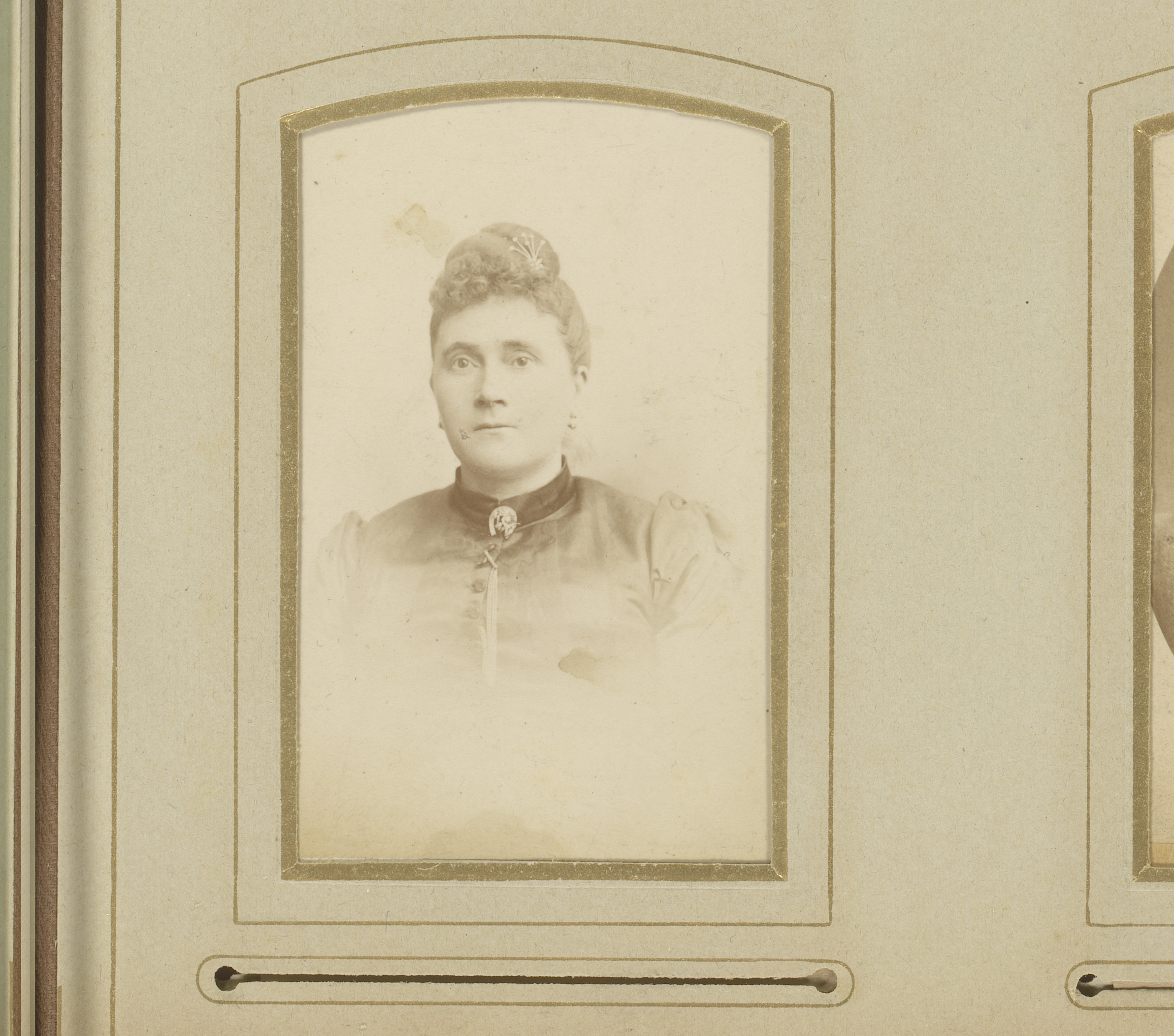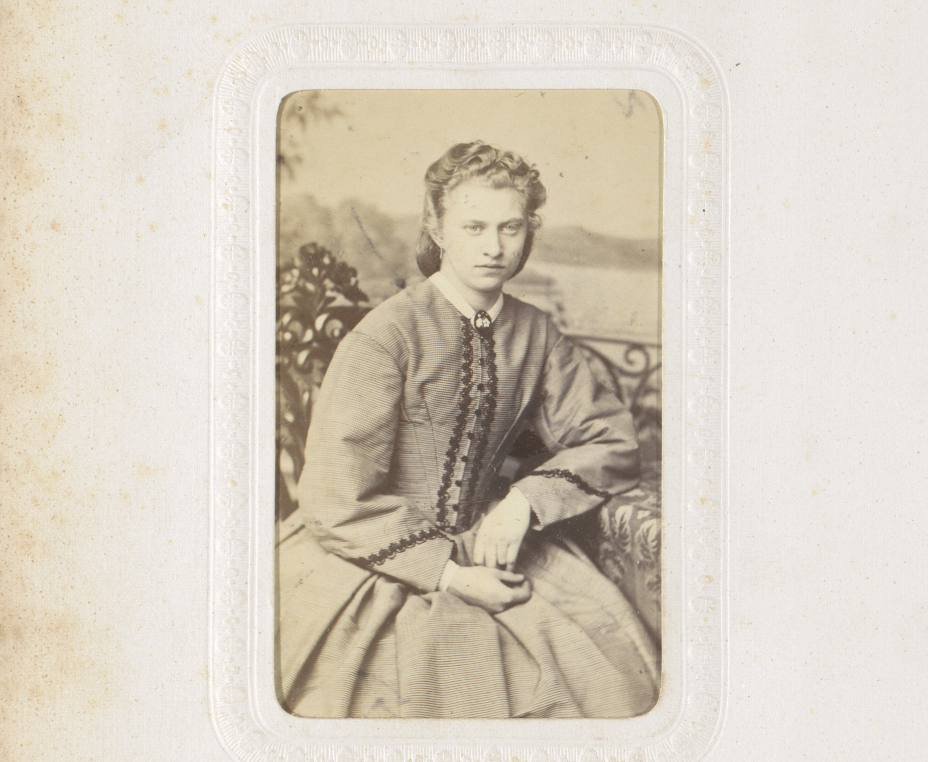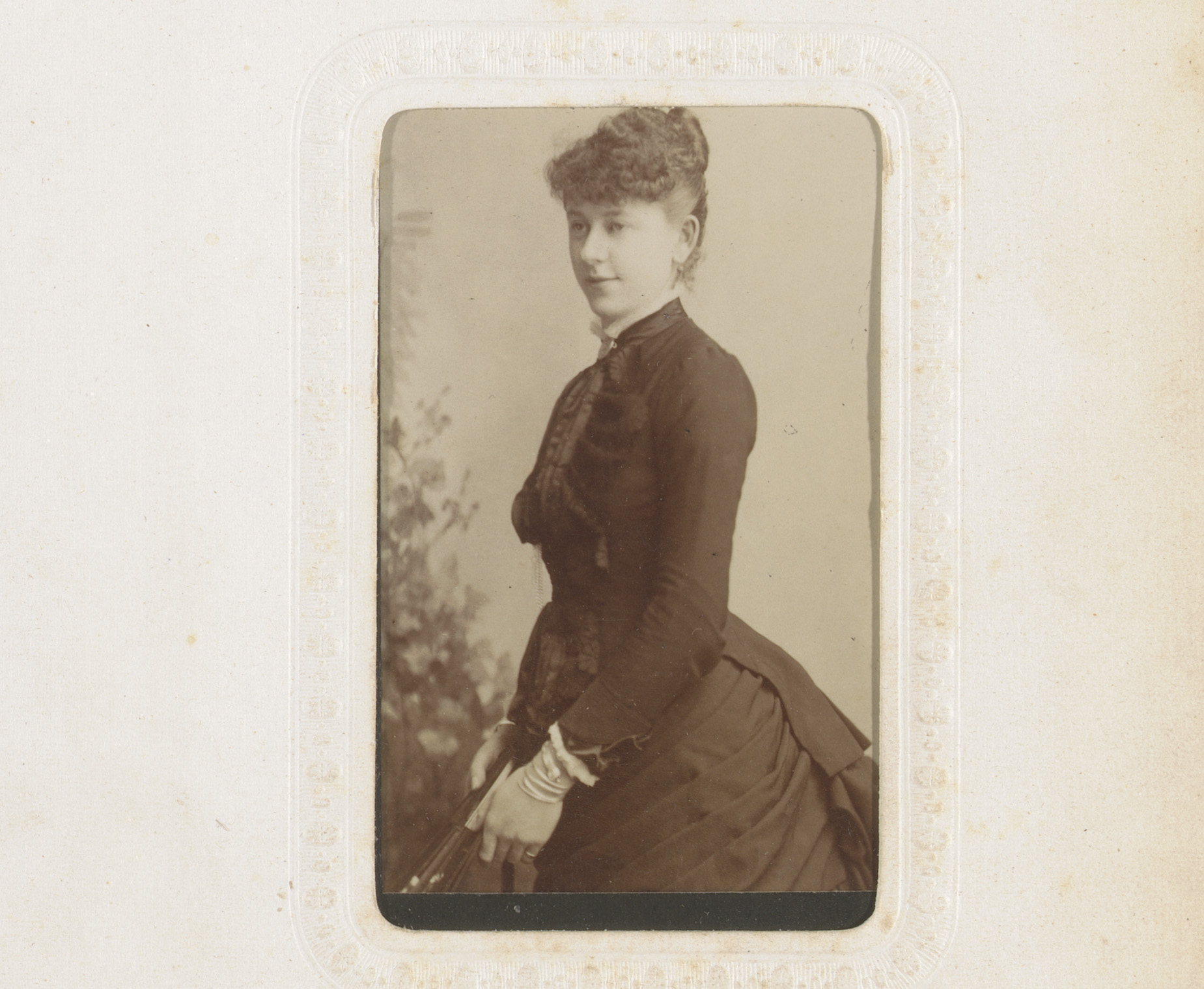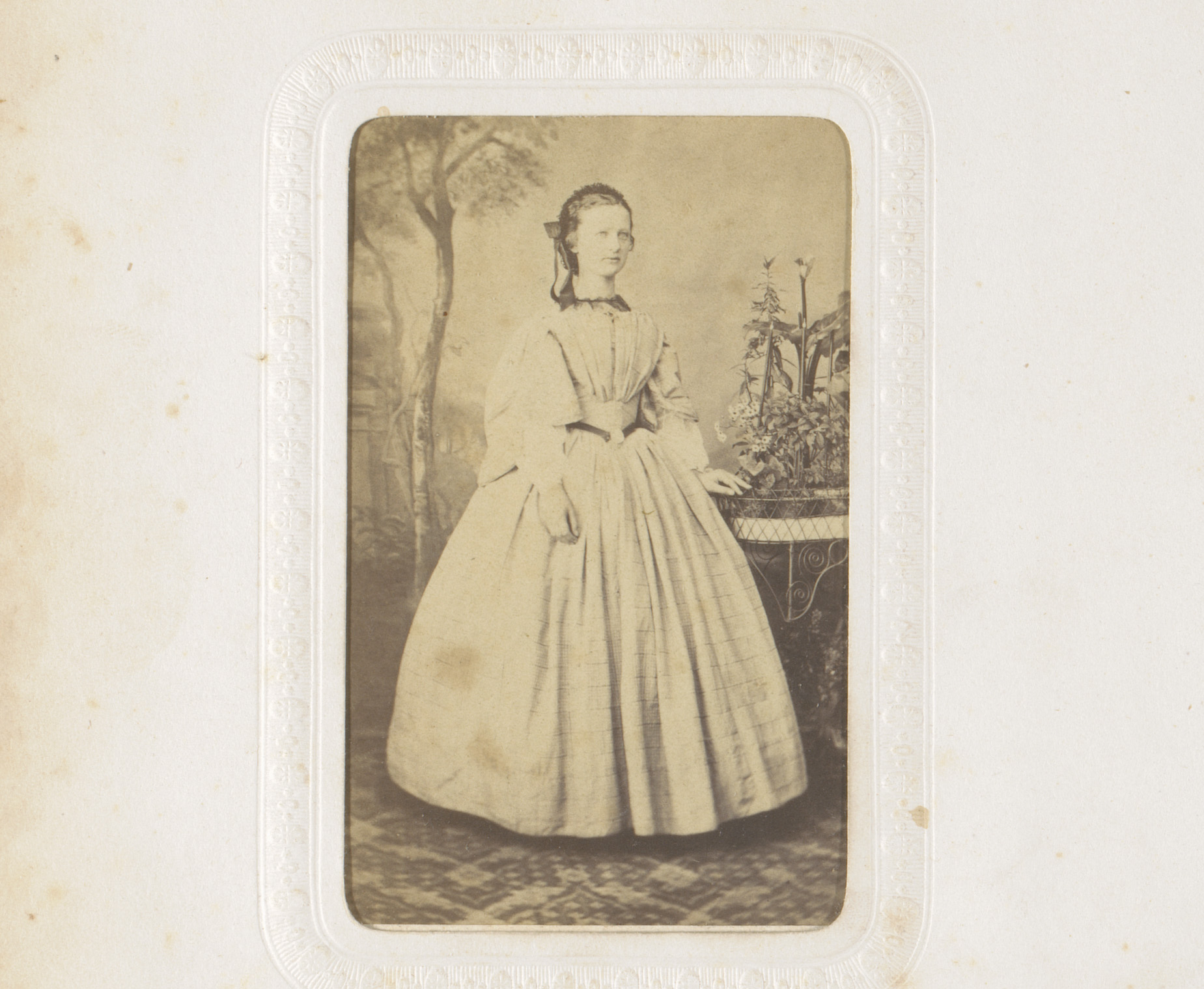 Portret van een vrouw in hooggesloten witte jurk