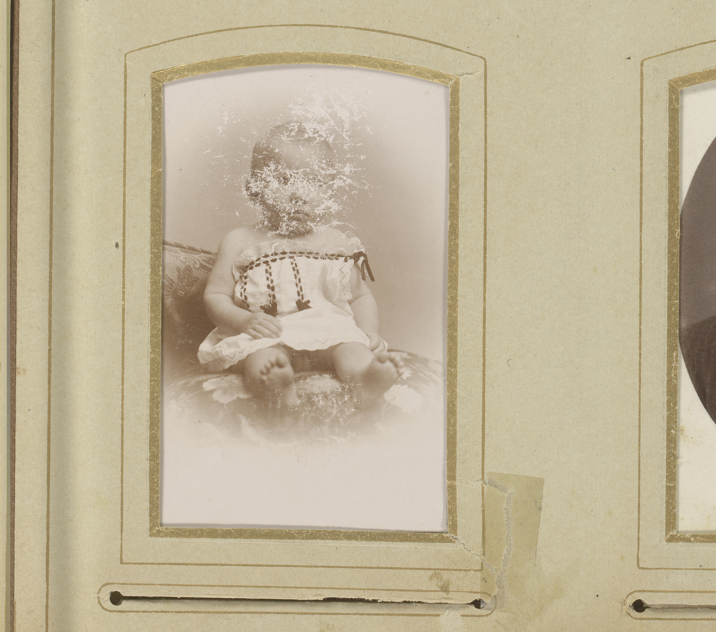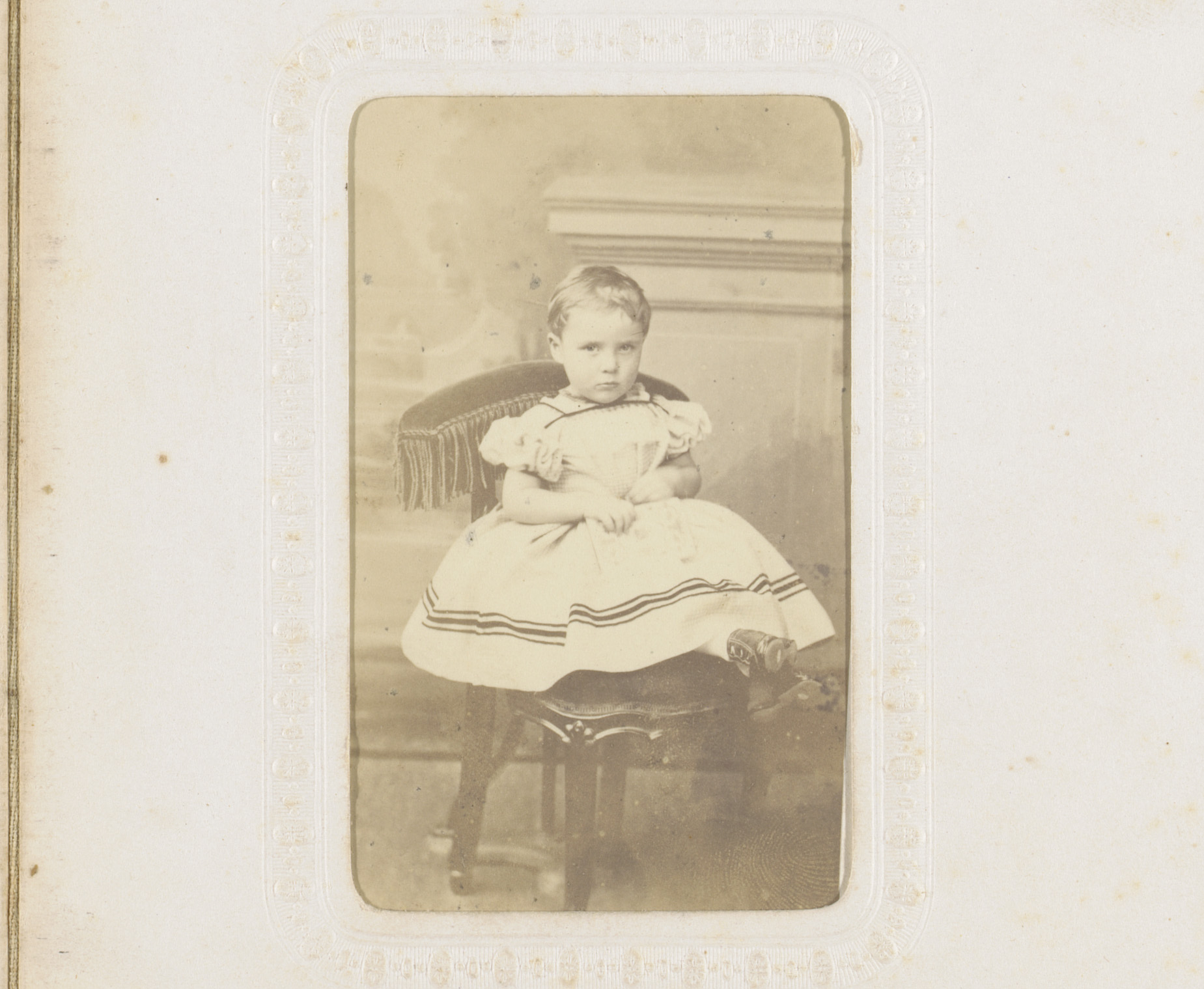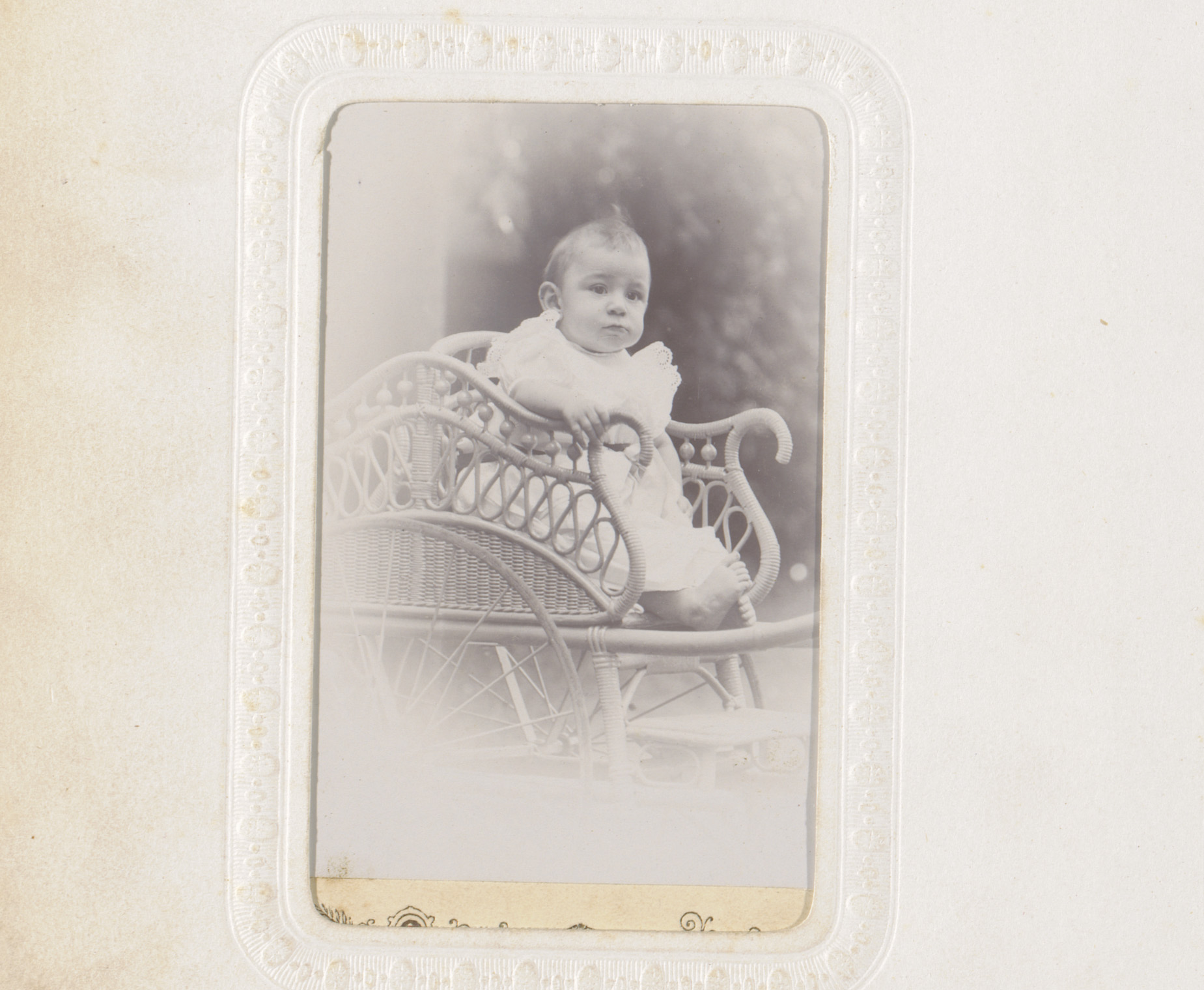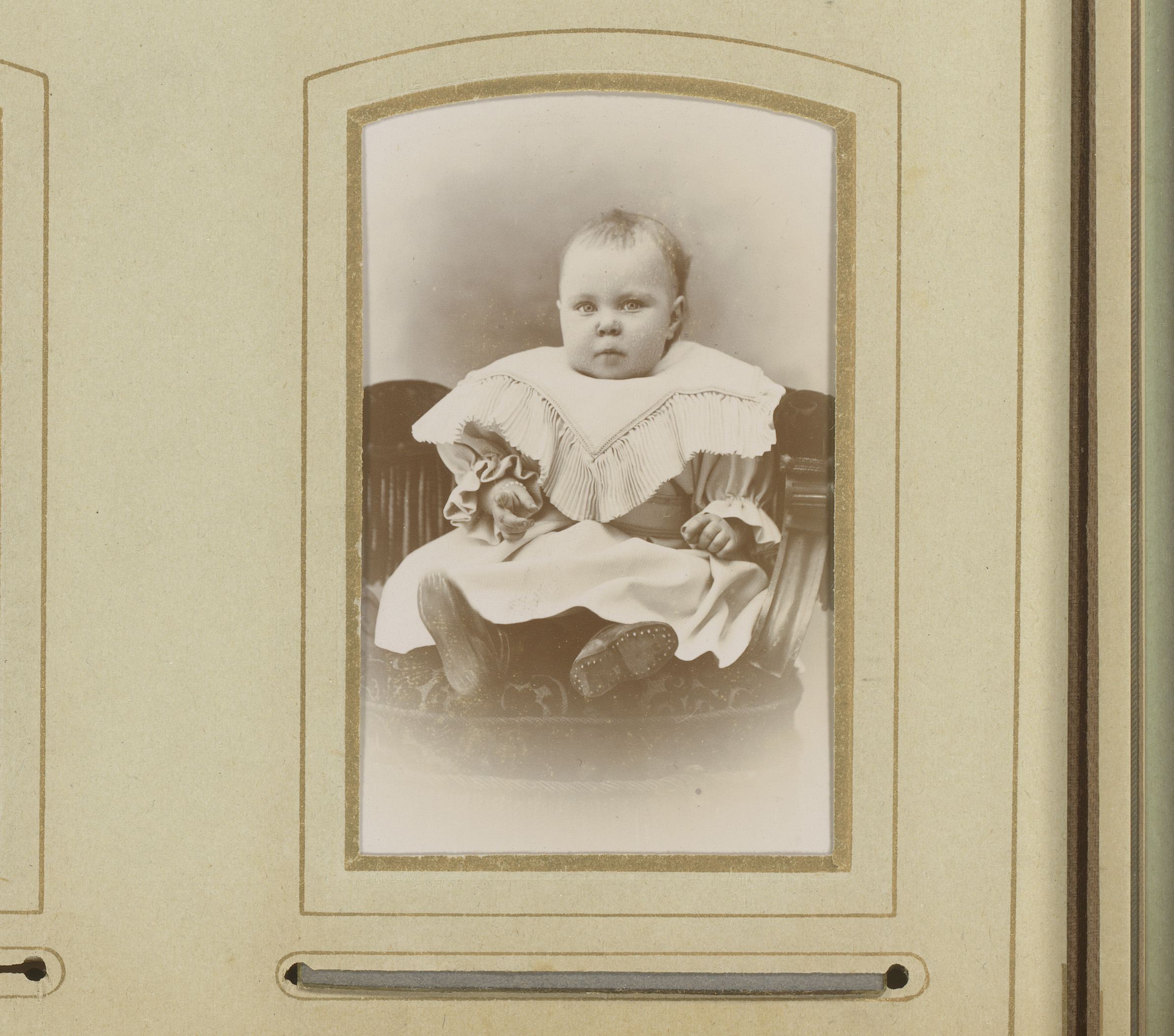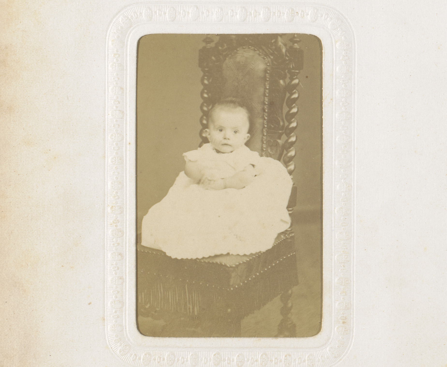Portret van een baby in doopjurk, zittend op een stoel