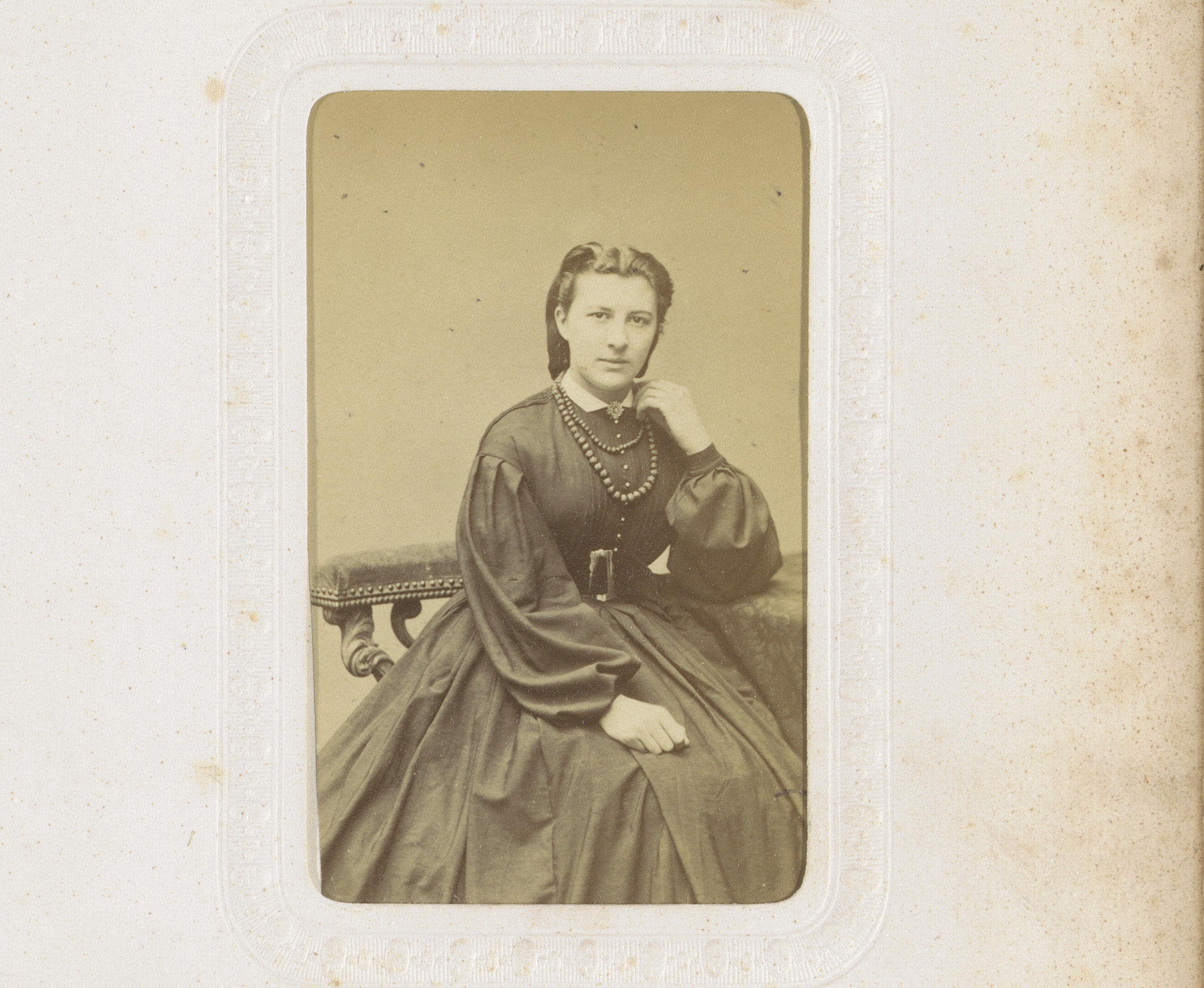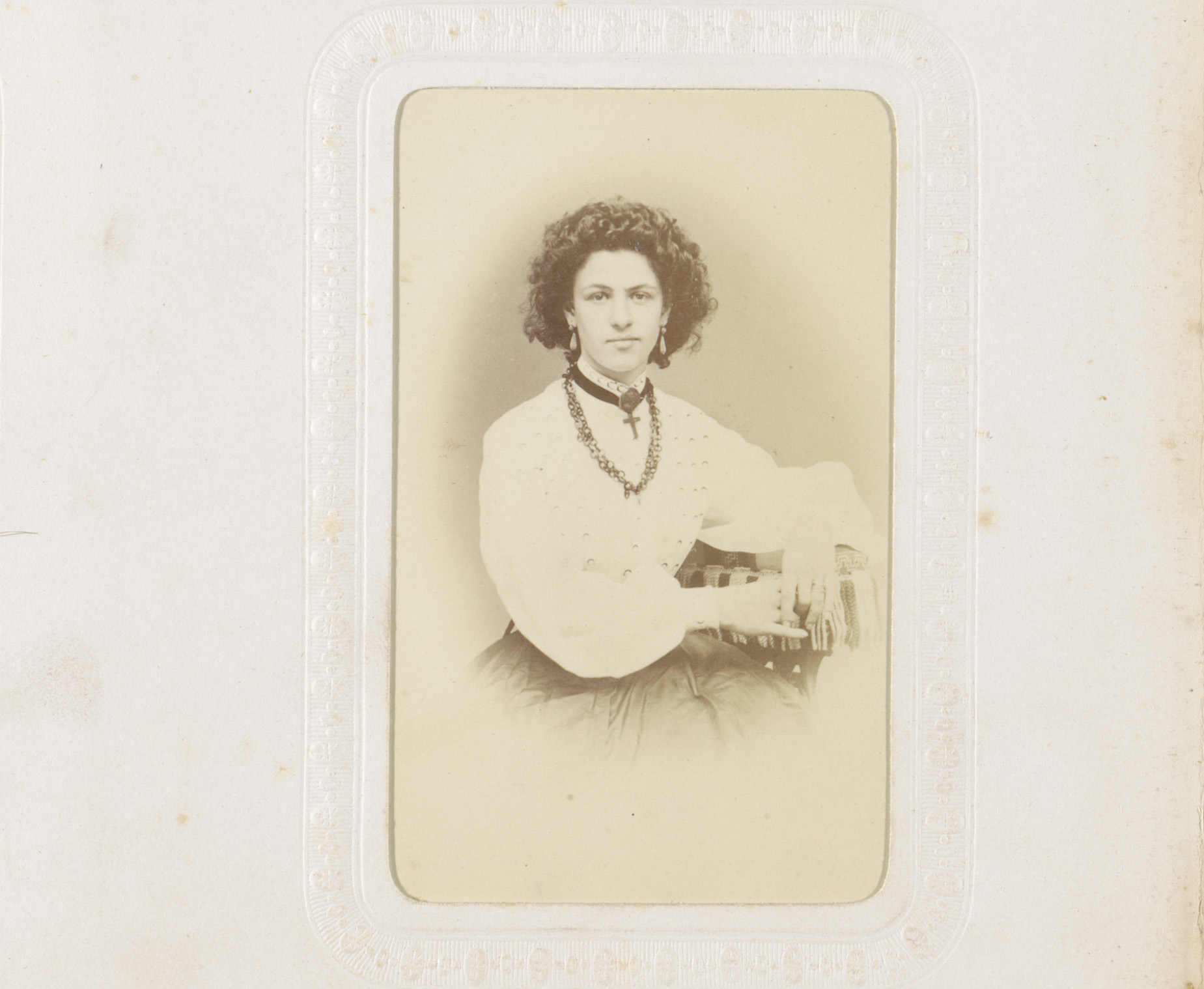 Portret van een zittende jonge vrouw met halskettingen