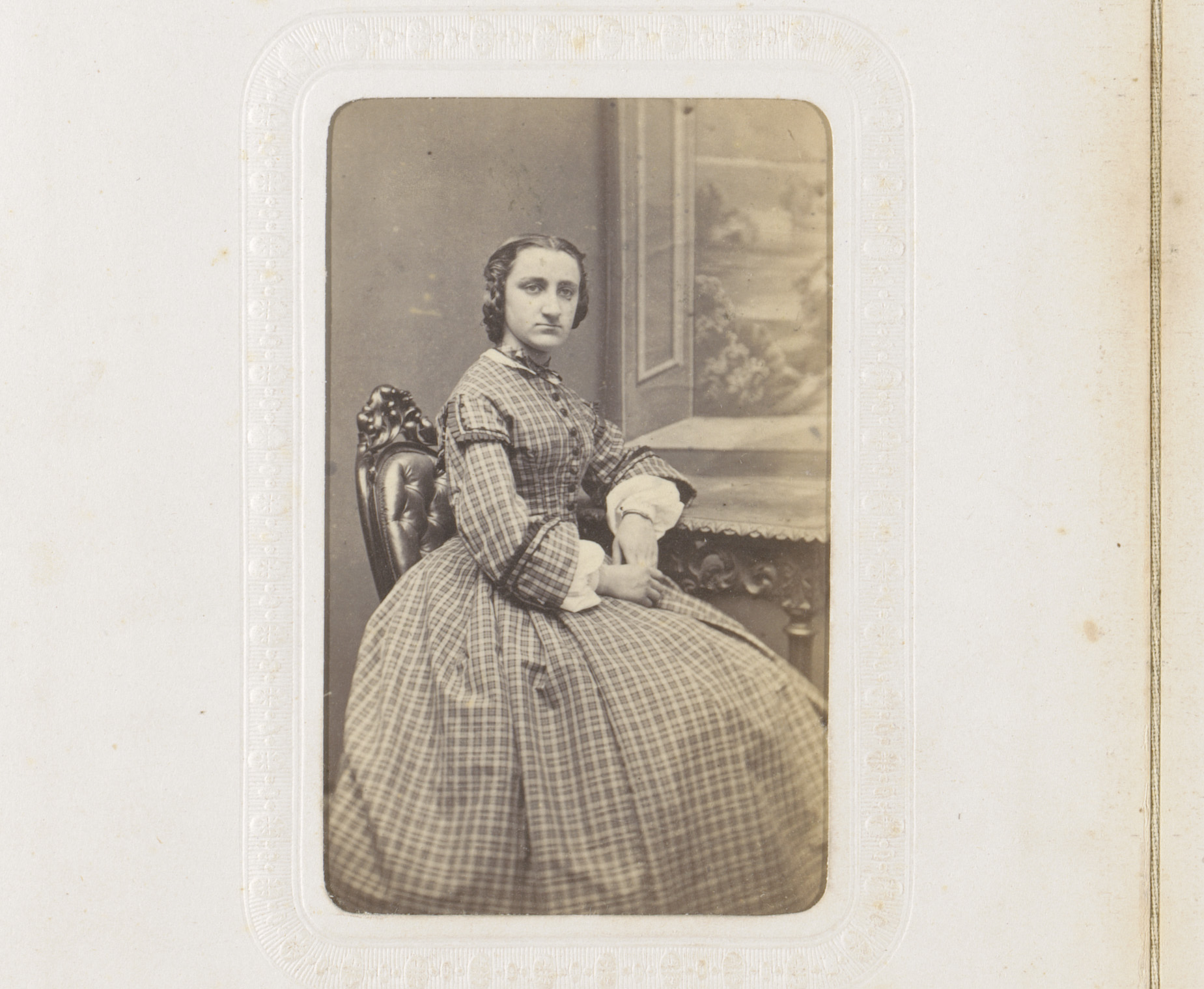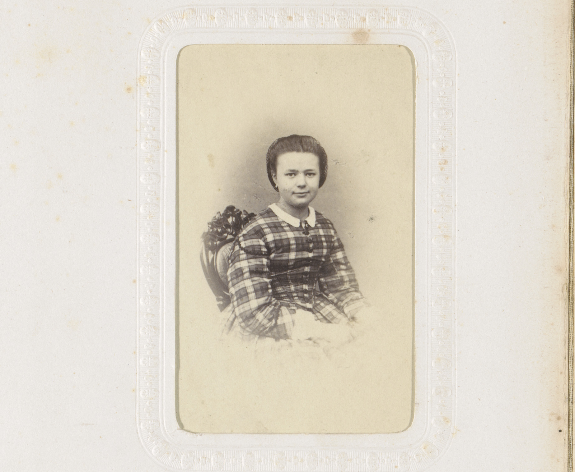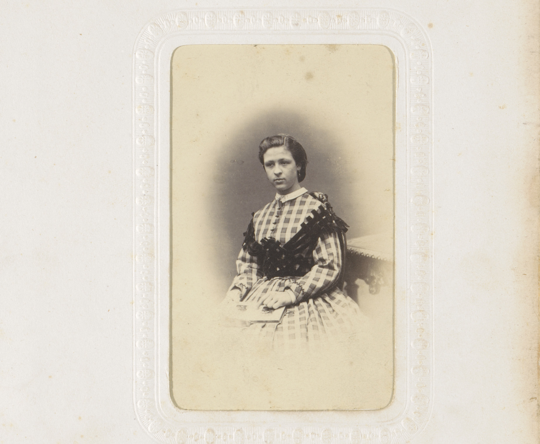Portret van een zittende jonge vrouw in geblokte jur...