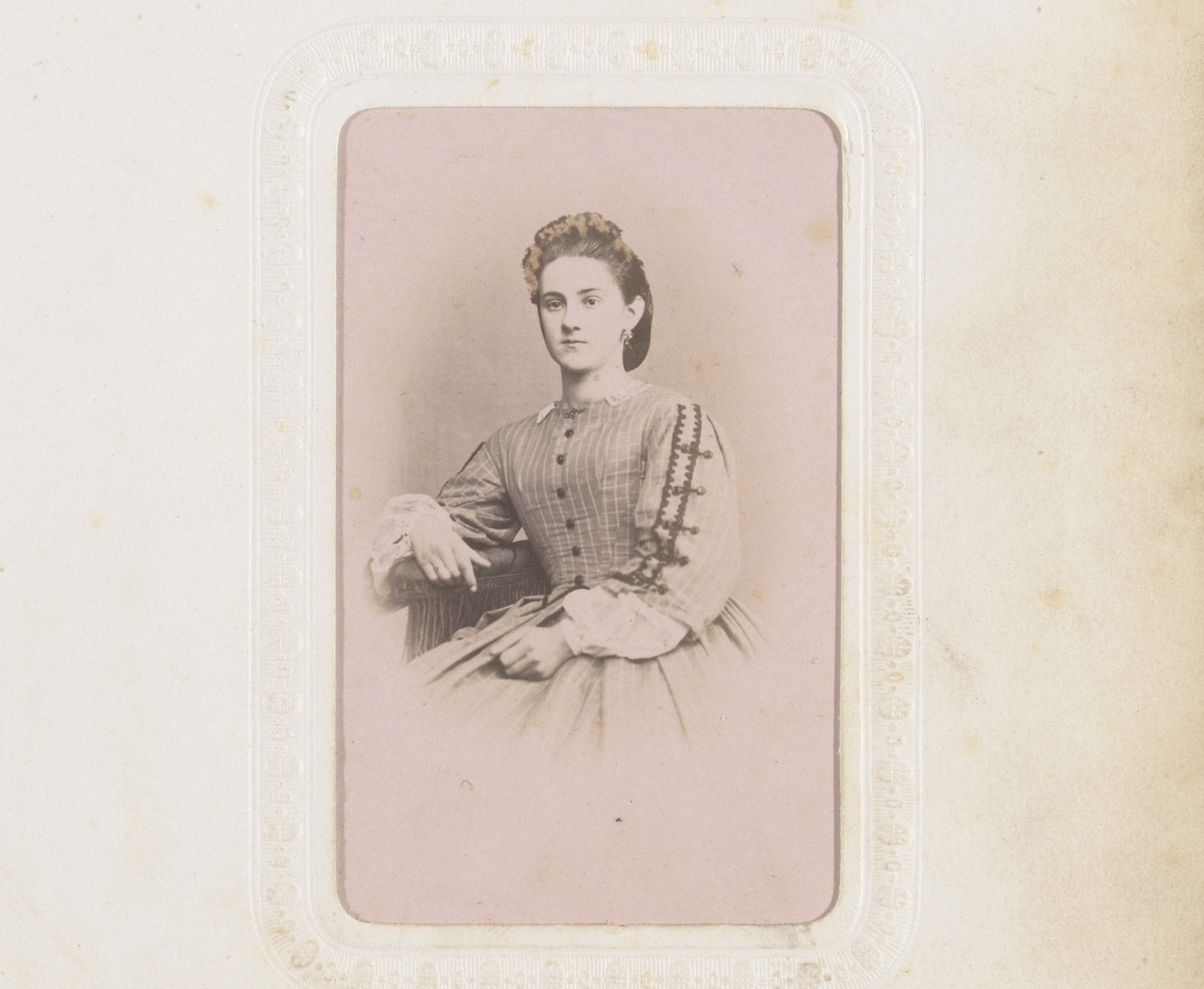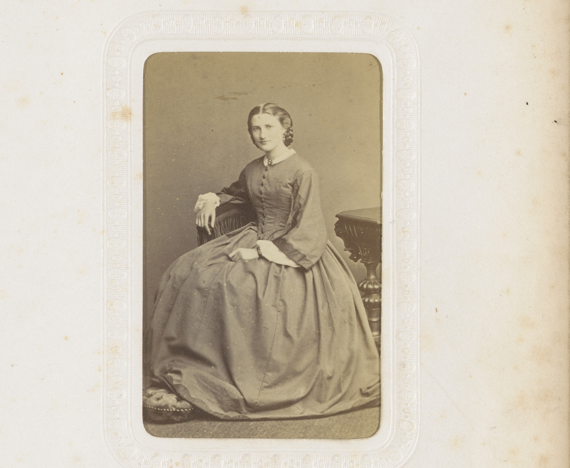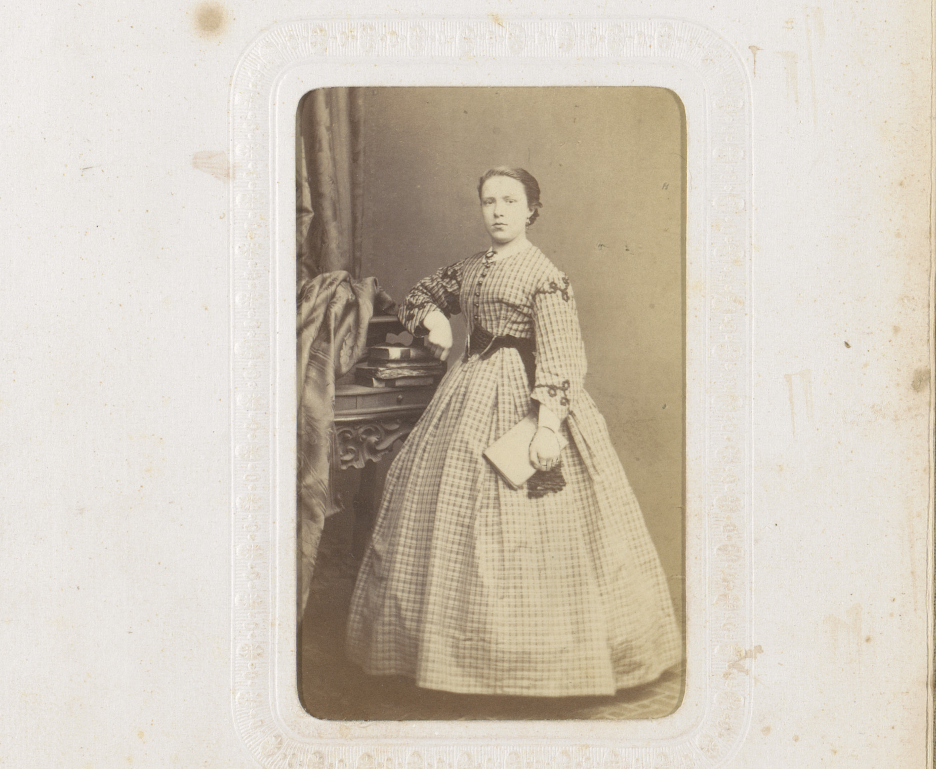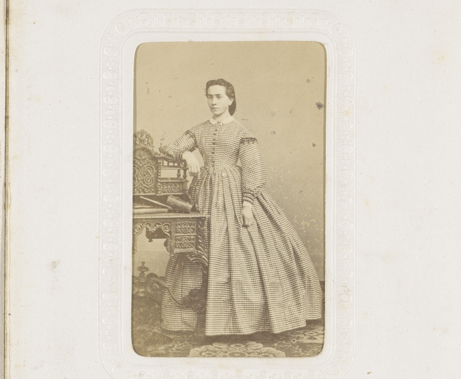 Portret van een zittende jonge vrouw in geblokte jur...