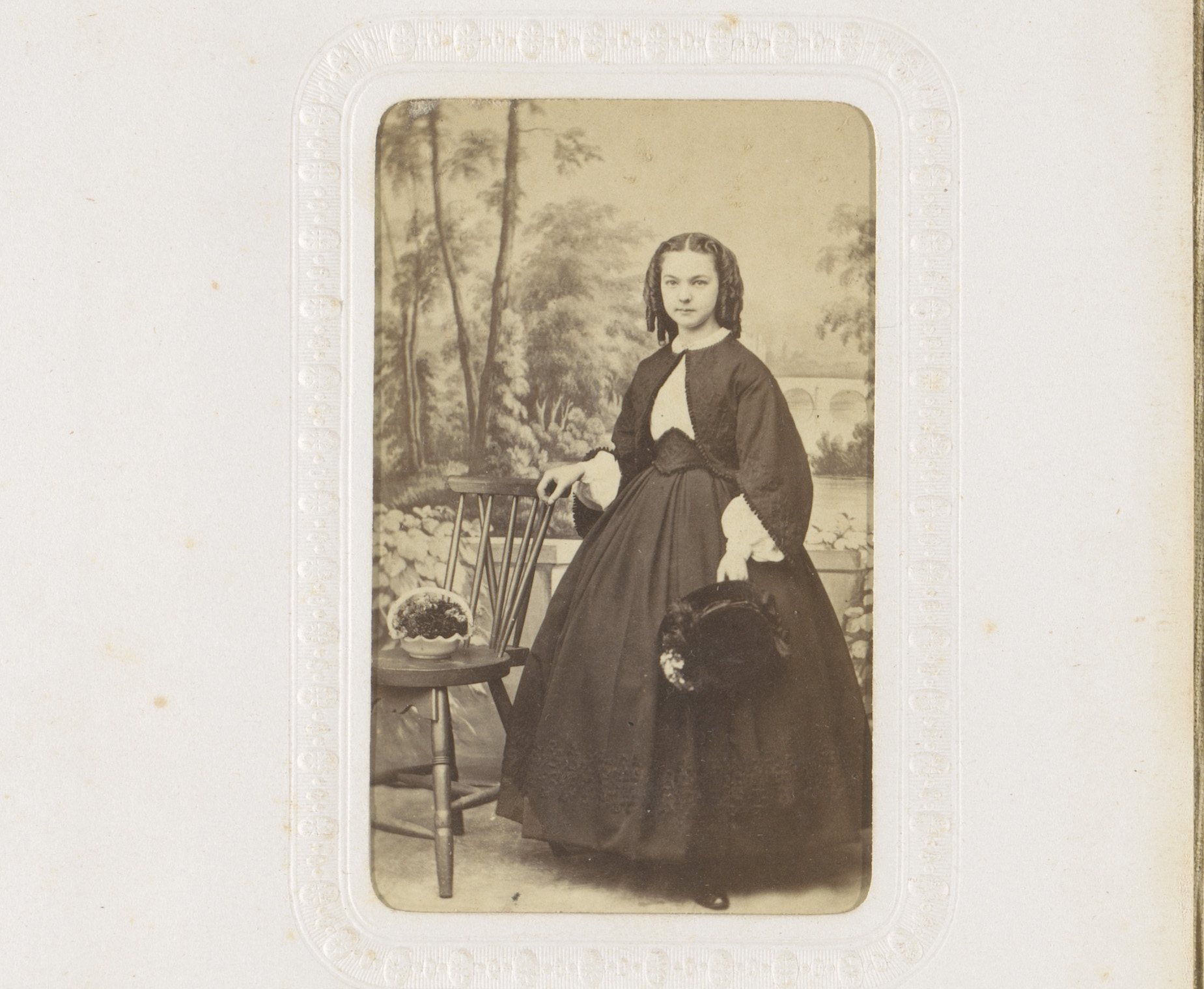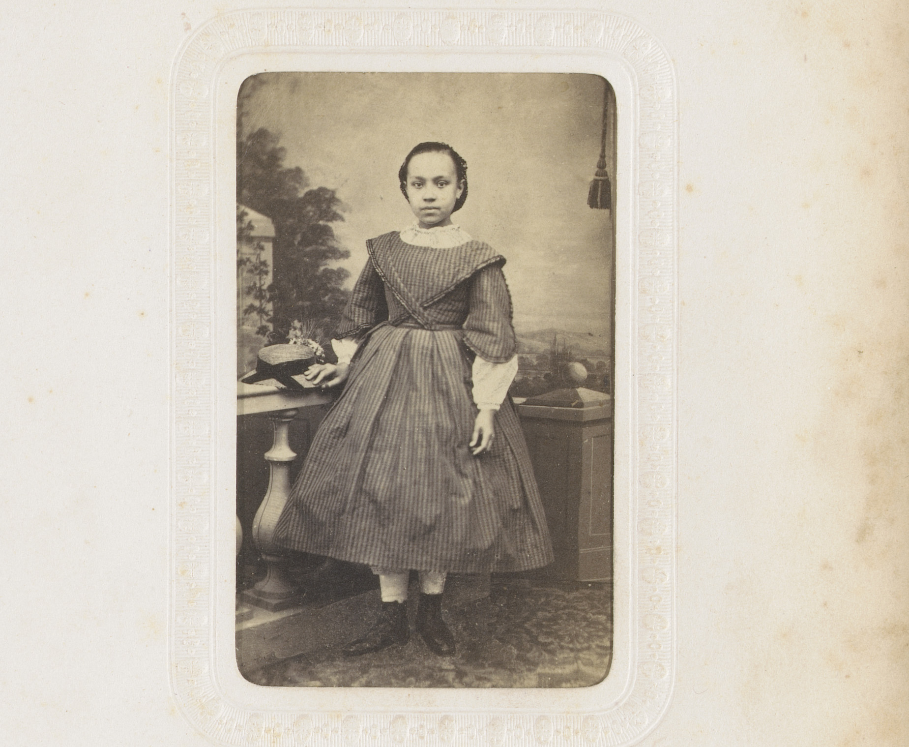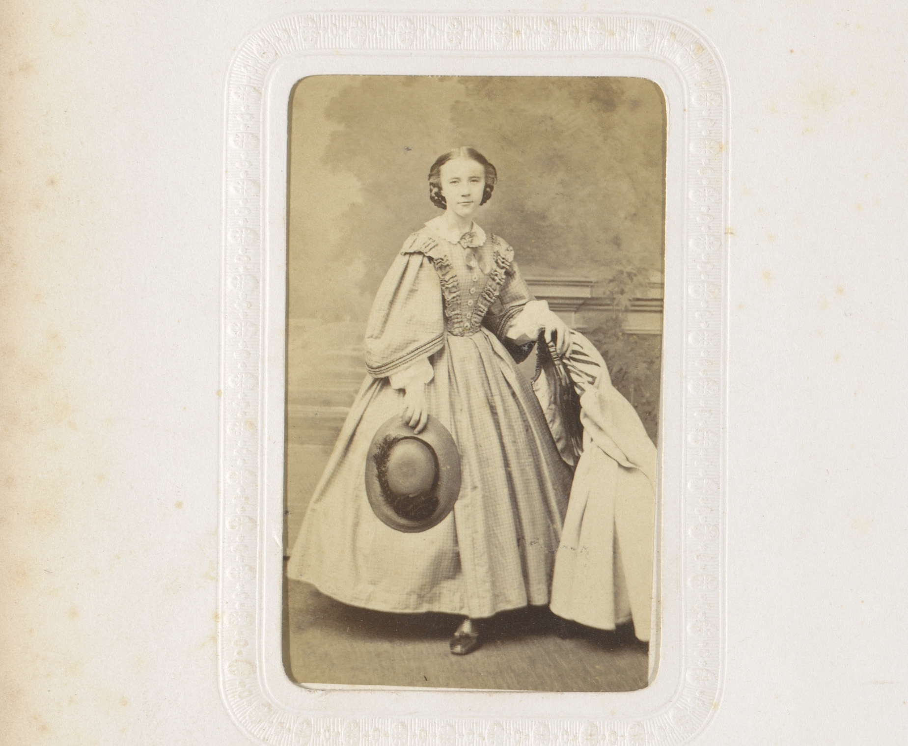 Portret van een meisje met hoed in de hand, staand b...