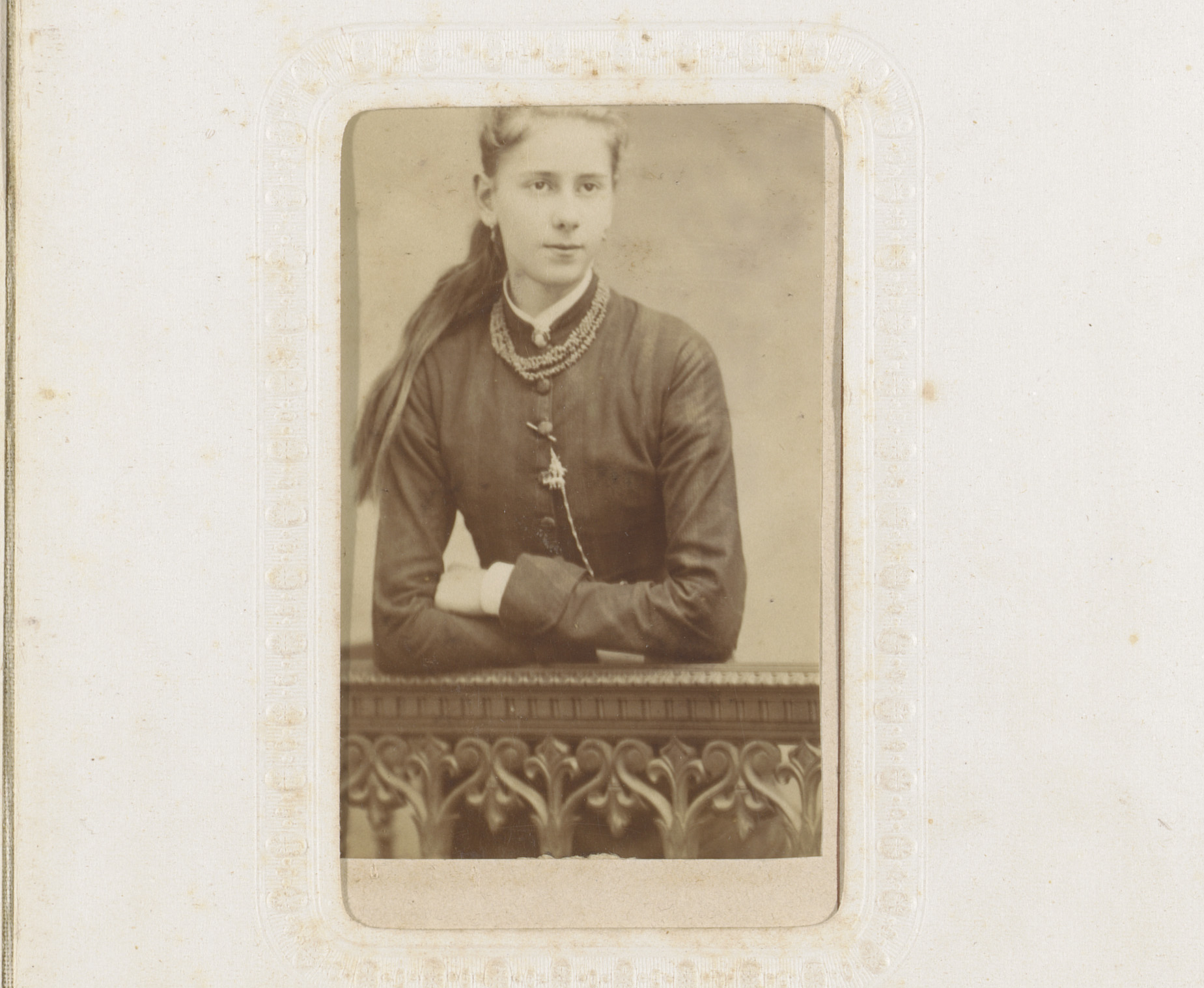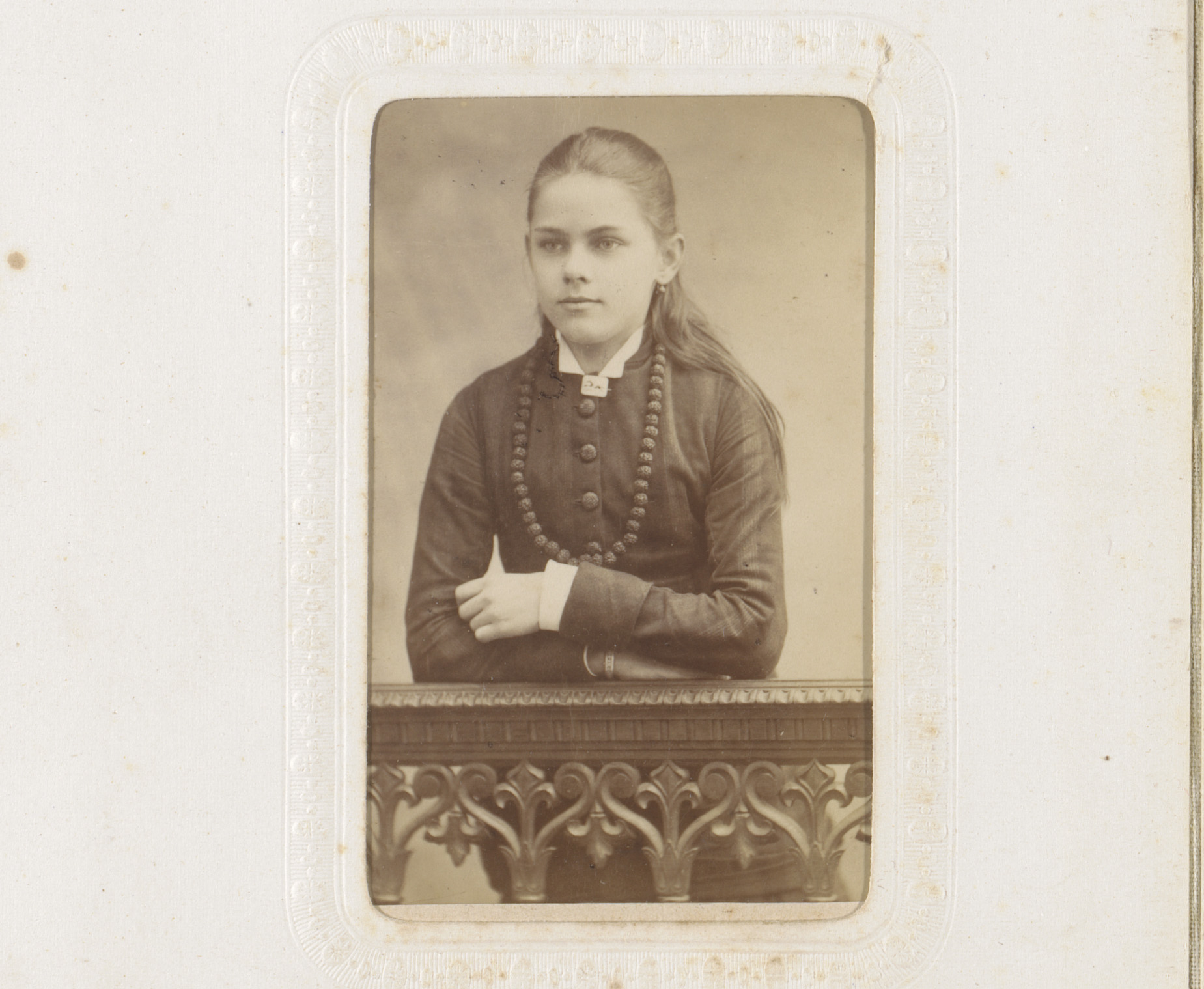 Portret van een meisje, leunend op een balustrade