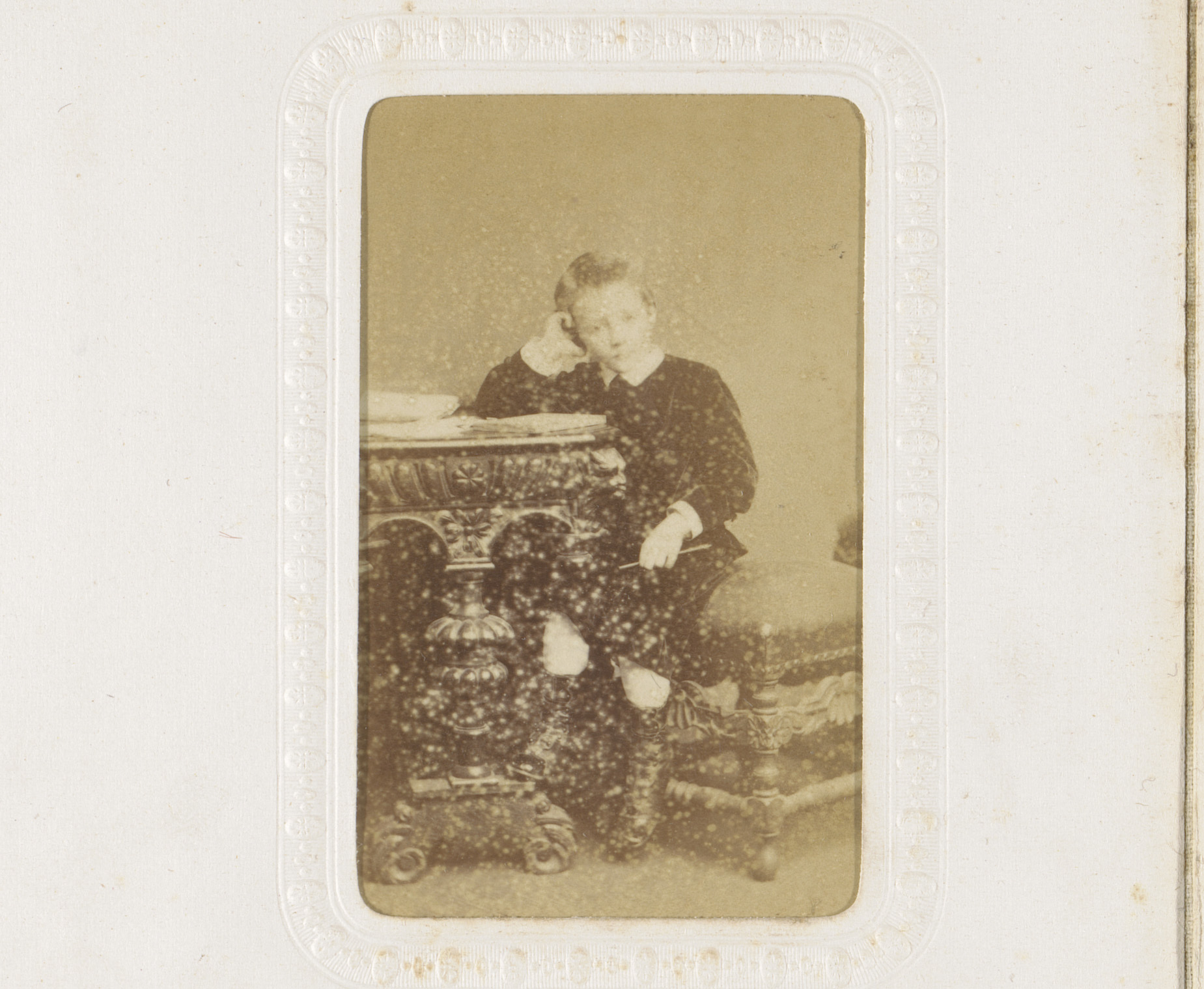 Portret van een zittende jongen, leunend op een tafel