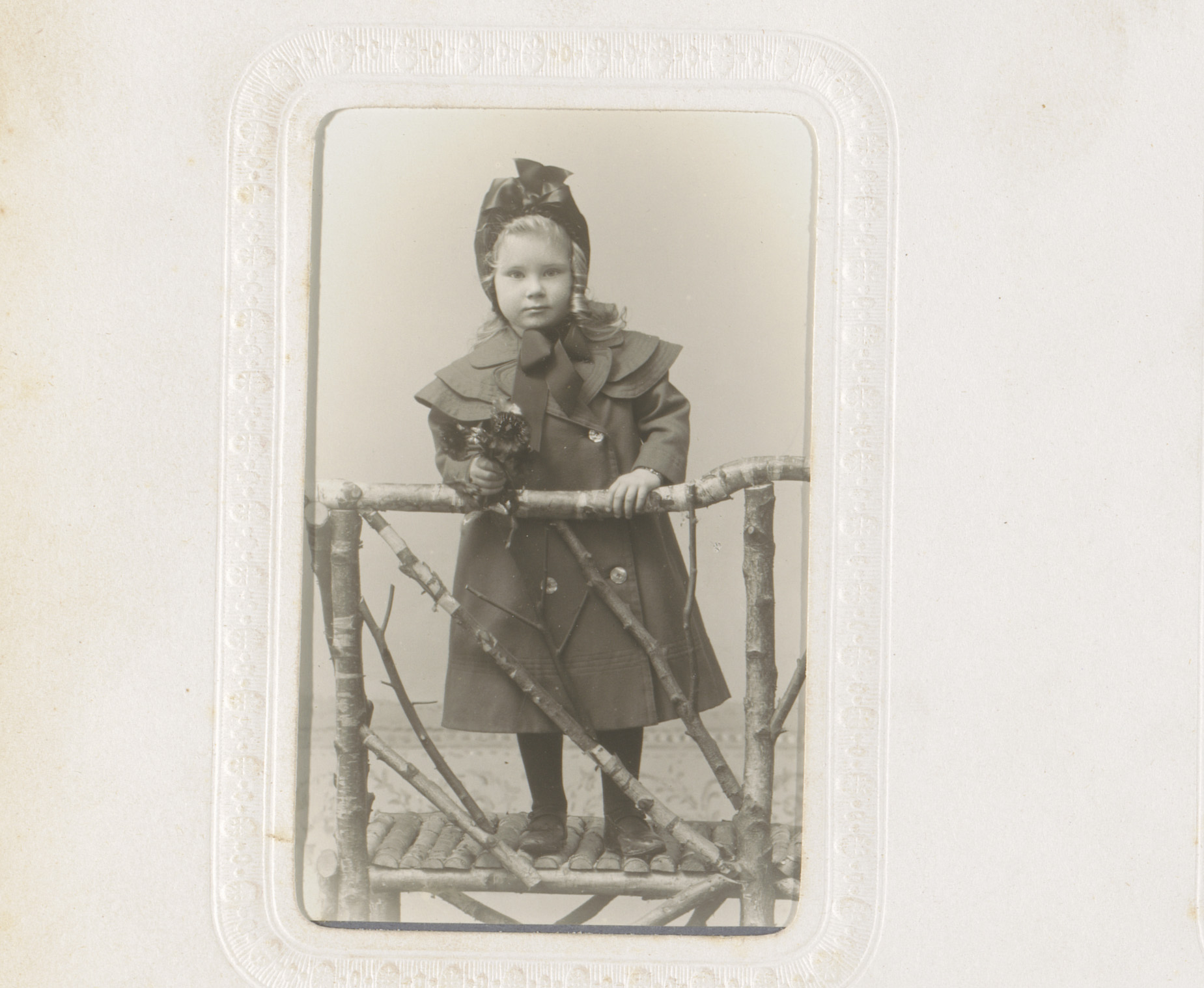 Portret van een meisje, staand bij een balustrade me...