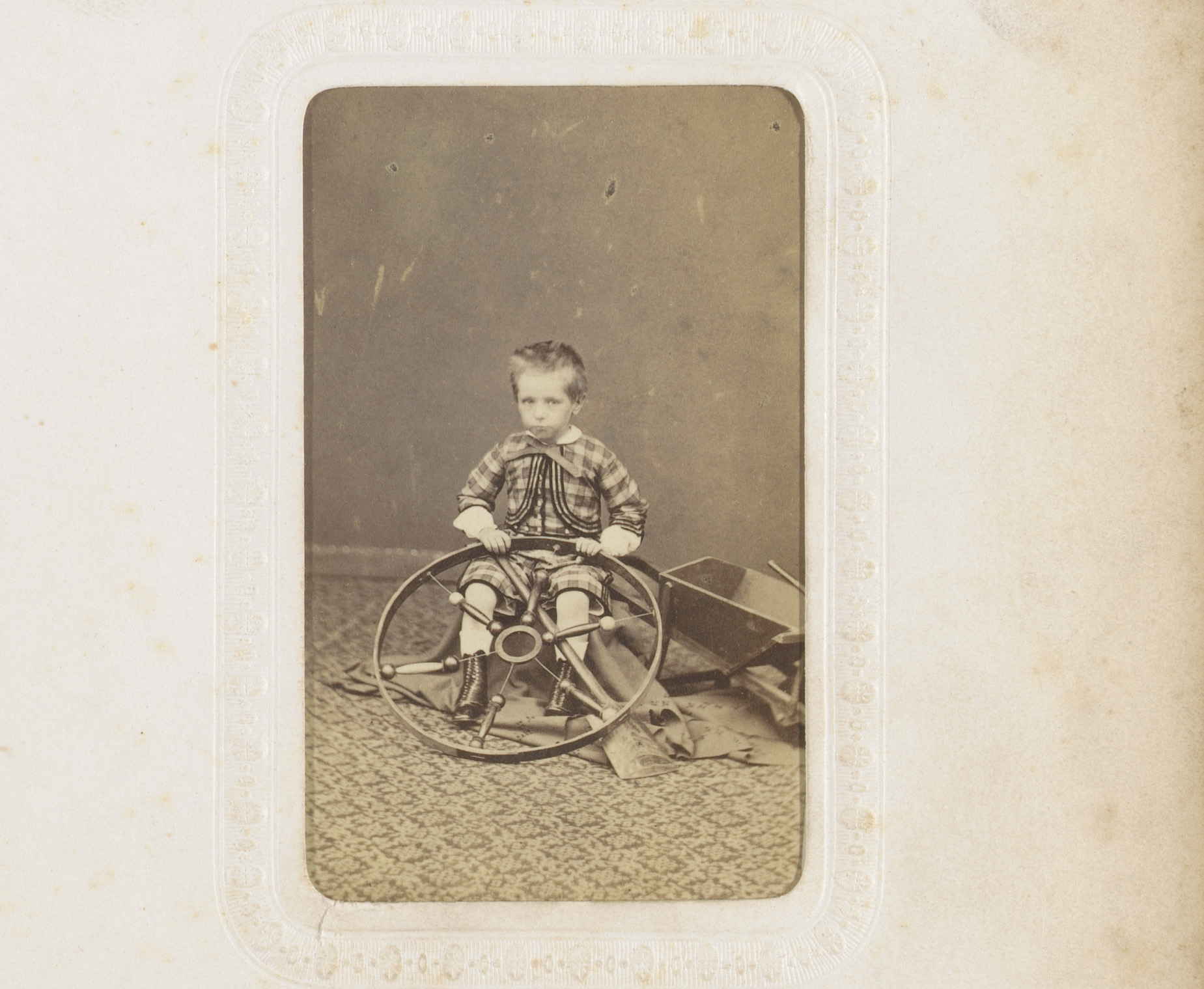 Portret van een zittende jongen met hoepel in de hand
