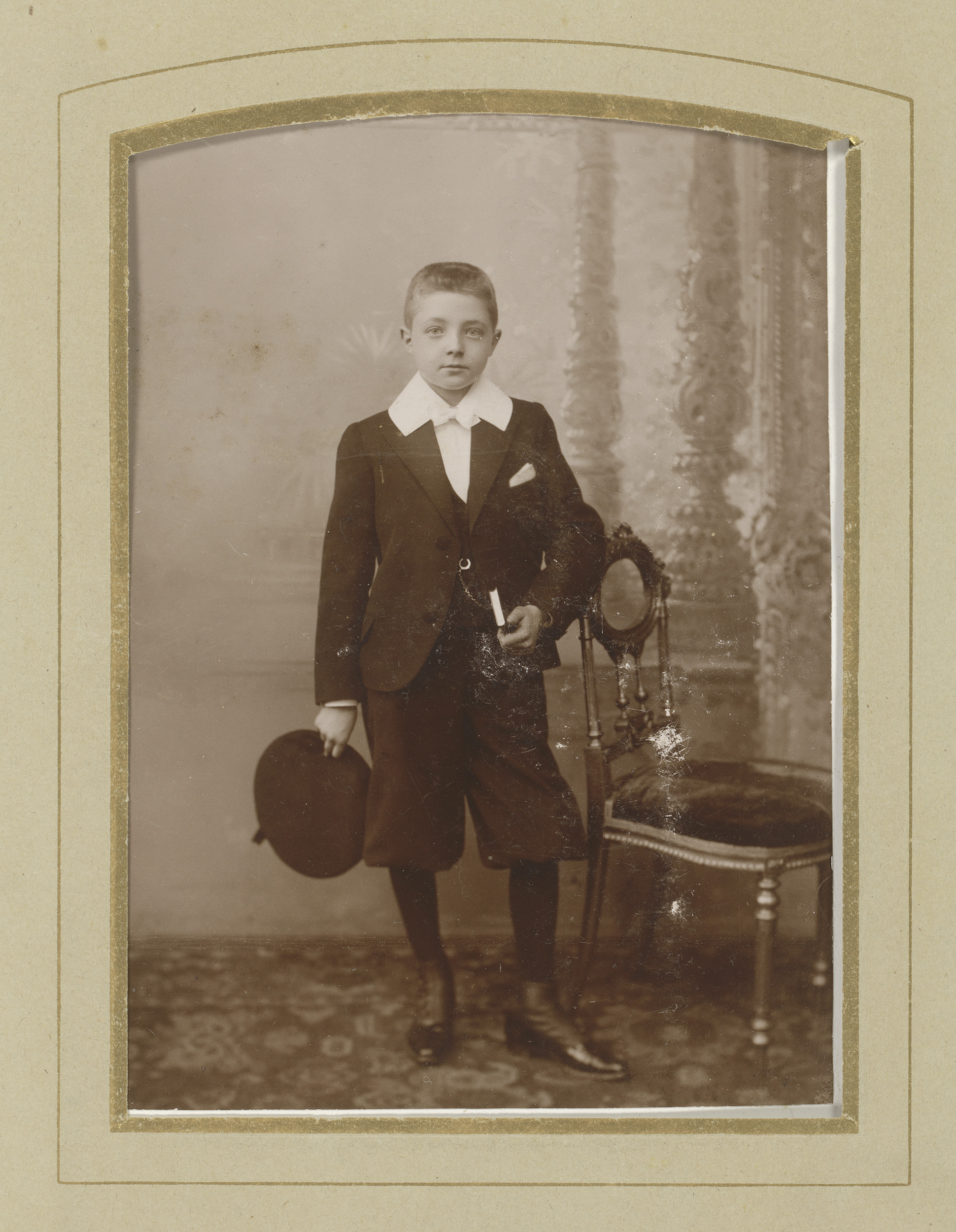 Portret van een staande jonge met hoed en boek in de...