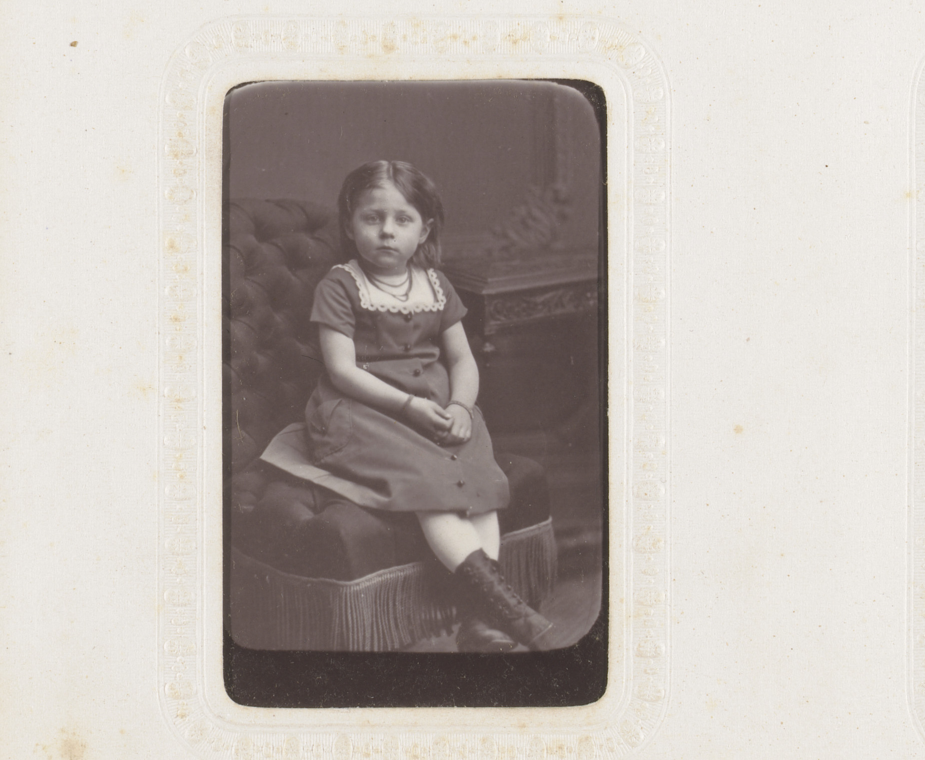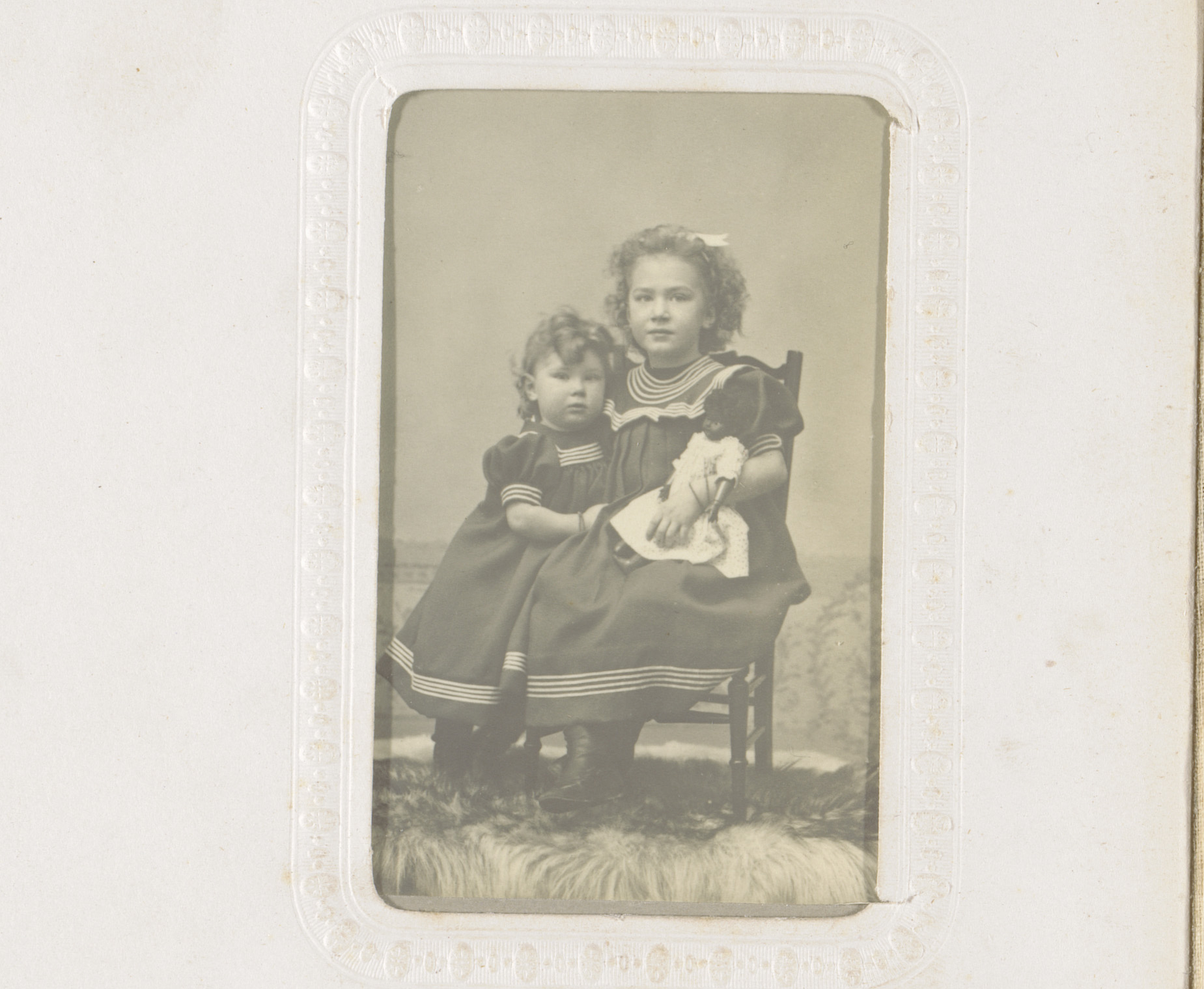 Portret van twee meisjes, waarvan één zittend op een...