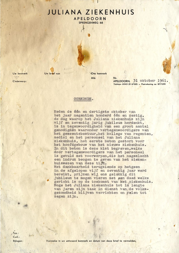 oorkonde Julianaziekenhuis 31 oktober 1961