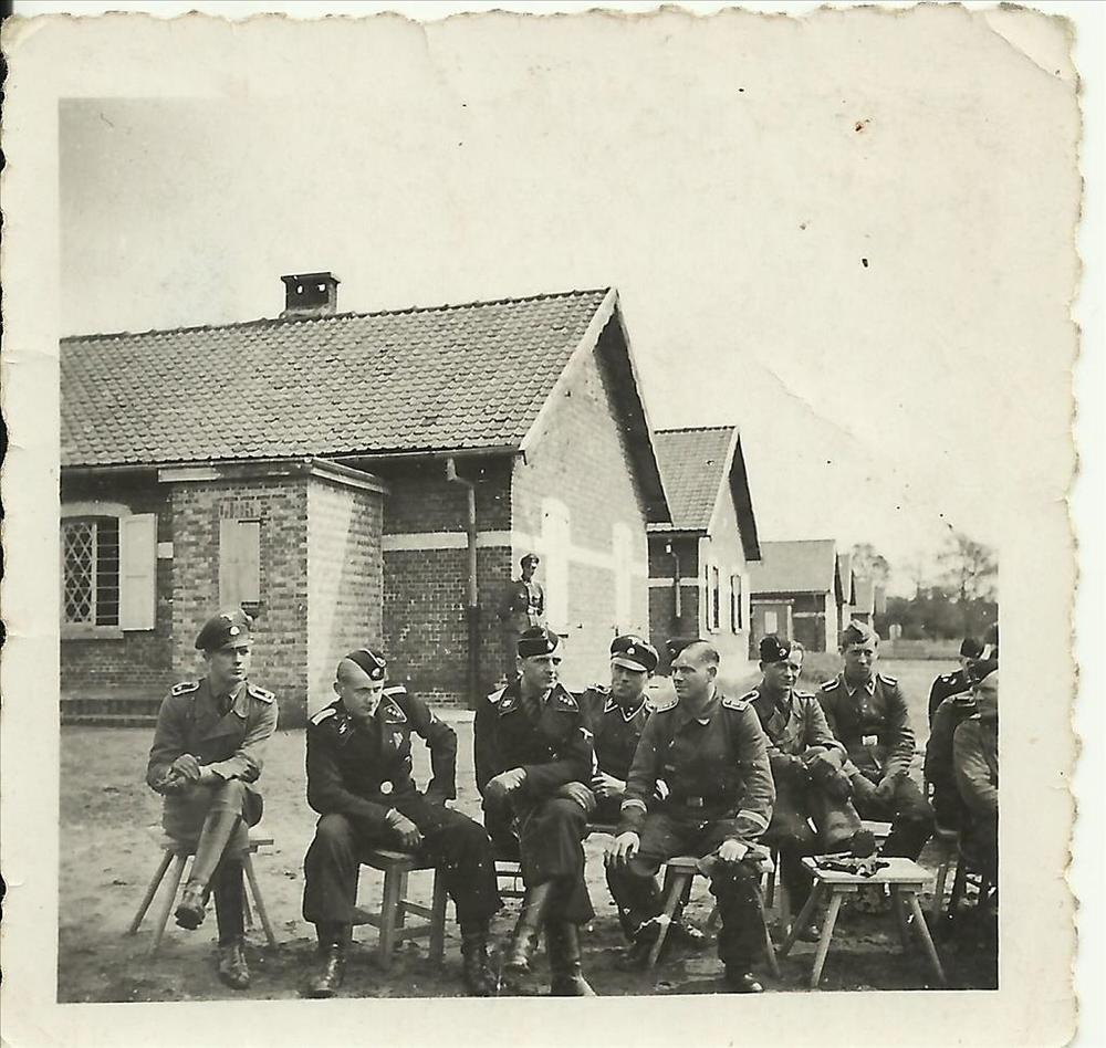 Groep Duitse soldaten voor barakken, Duitsland