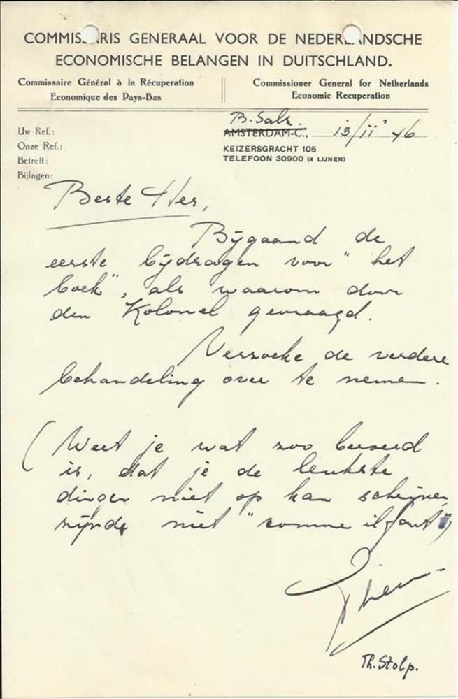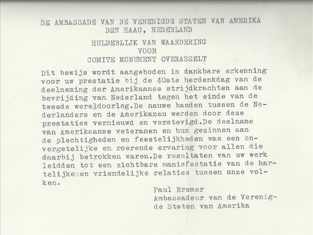 Brief van Paul Bremer, Ambassadeur van de Verenigde ...