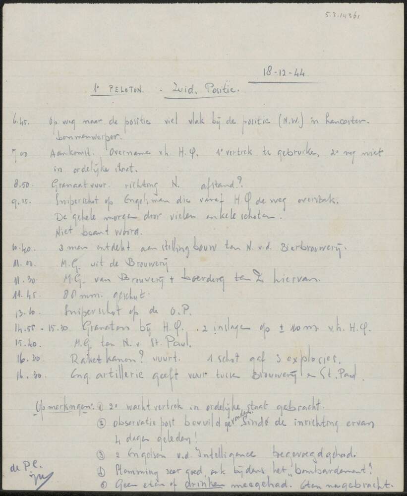 Rapport 1e Peloton Zuid positie, 18-12-44