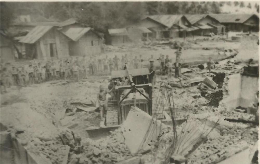 Ned. Indië na WO 2; bulldozer, puinhoop, toeschouwers