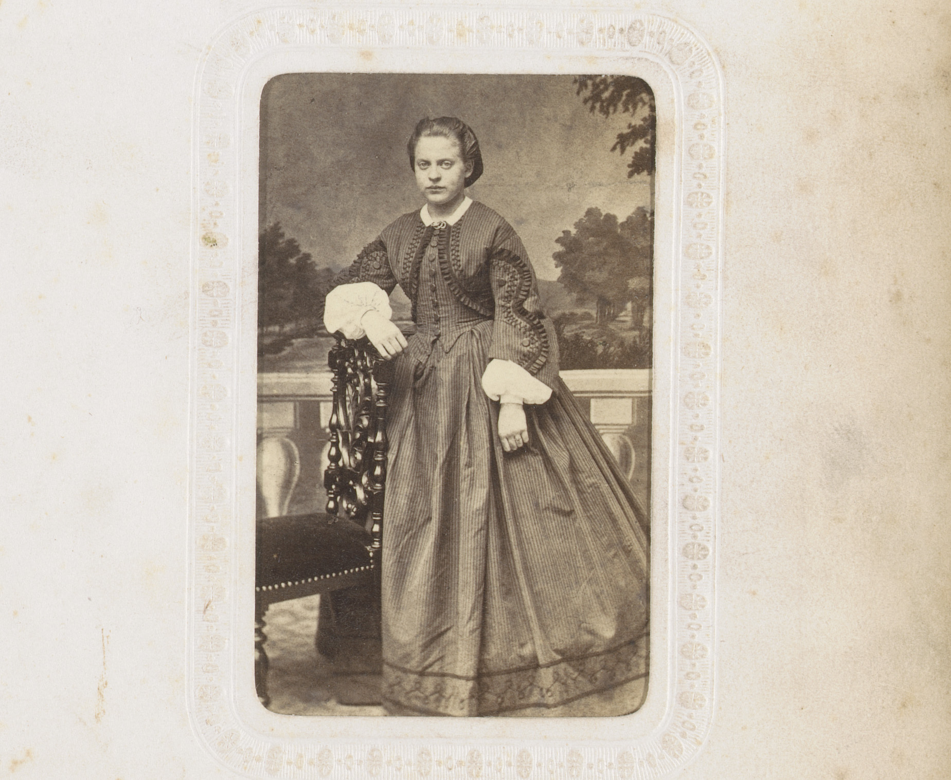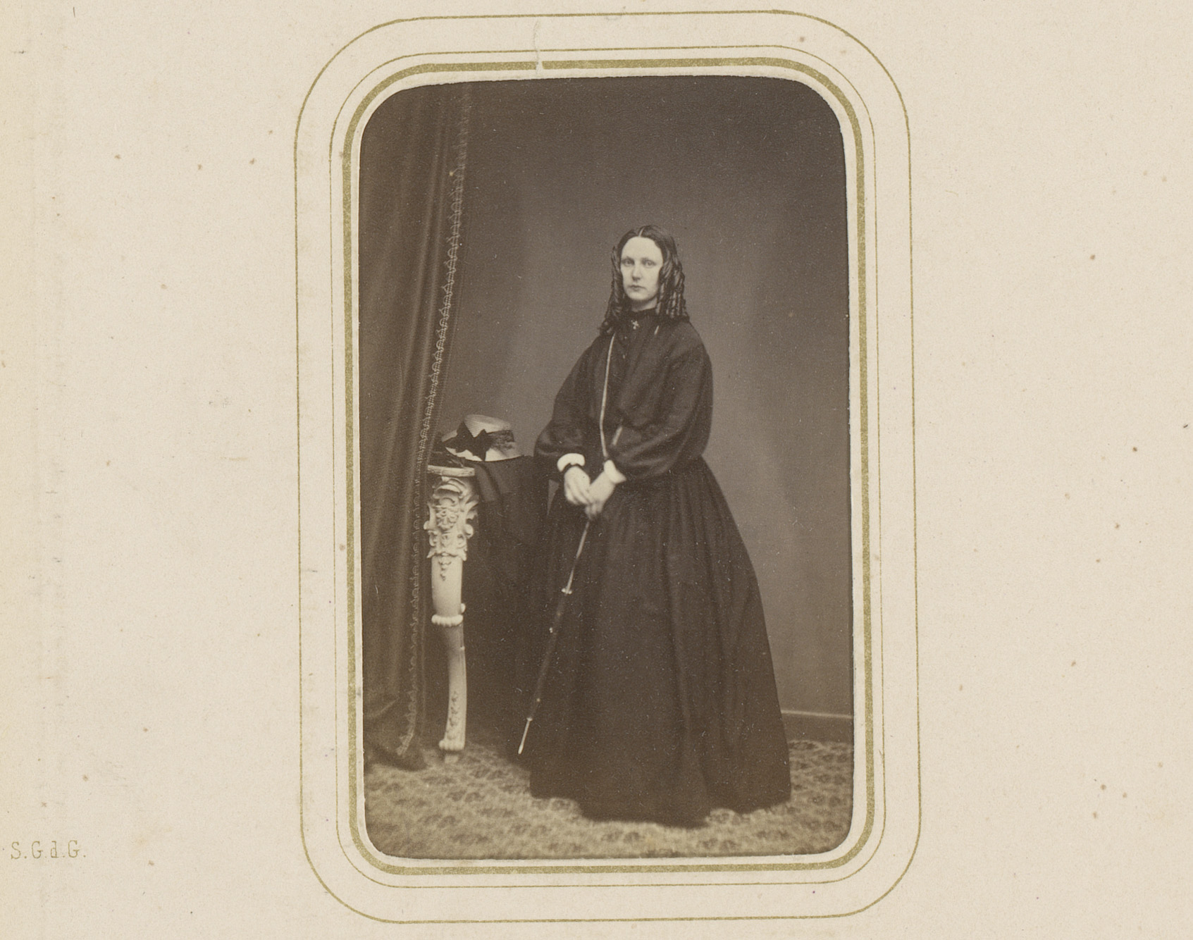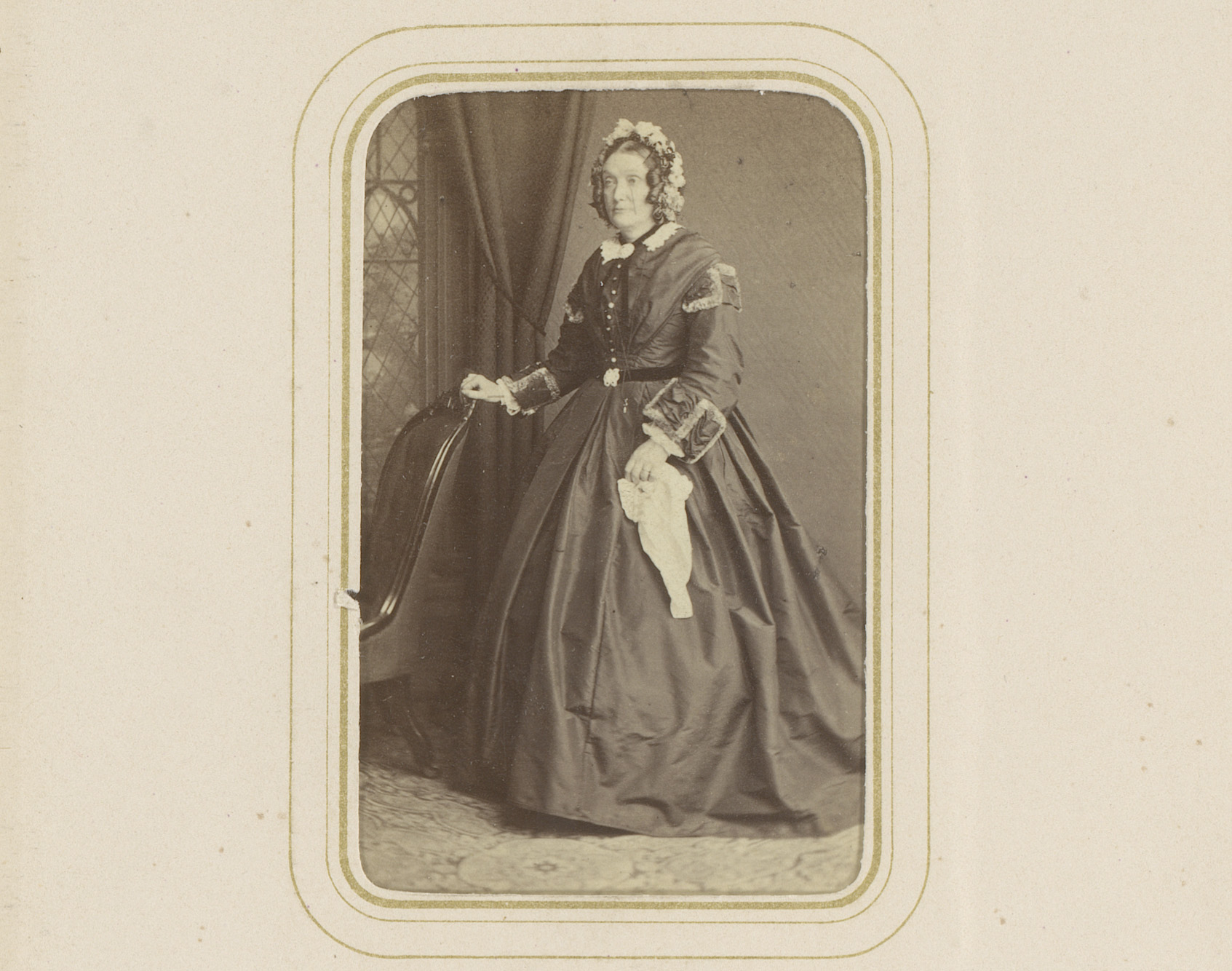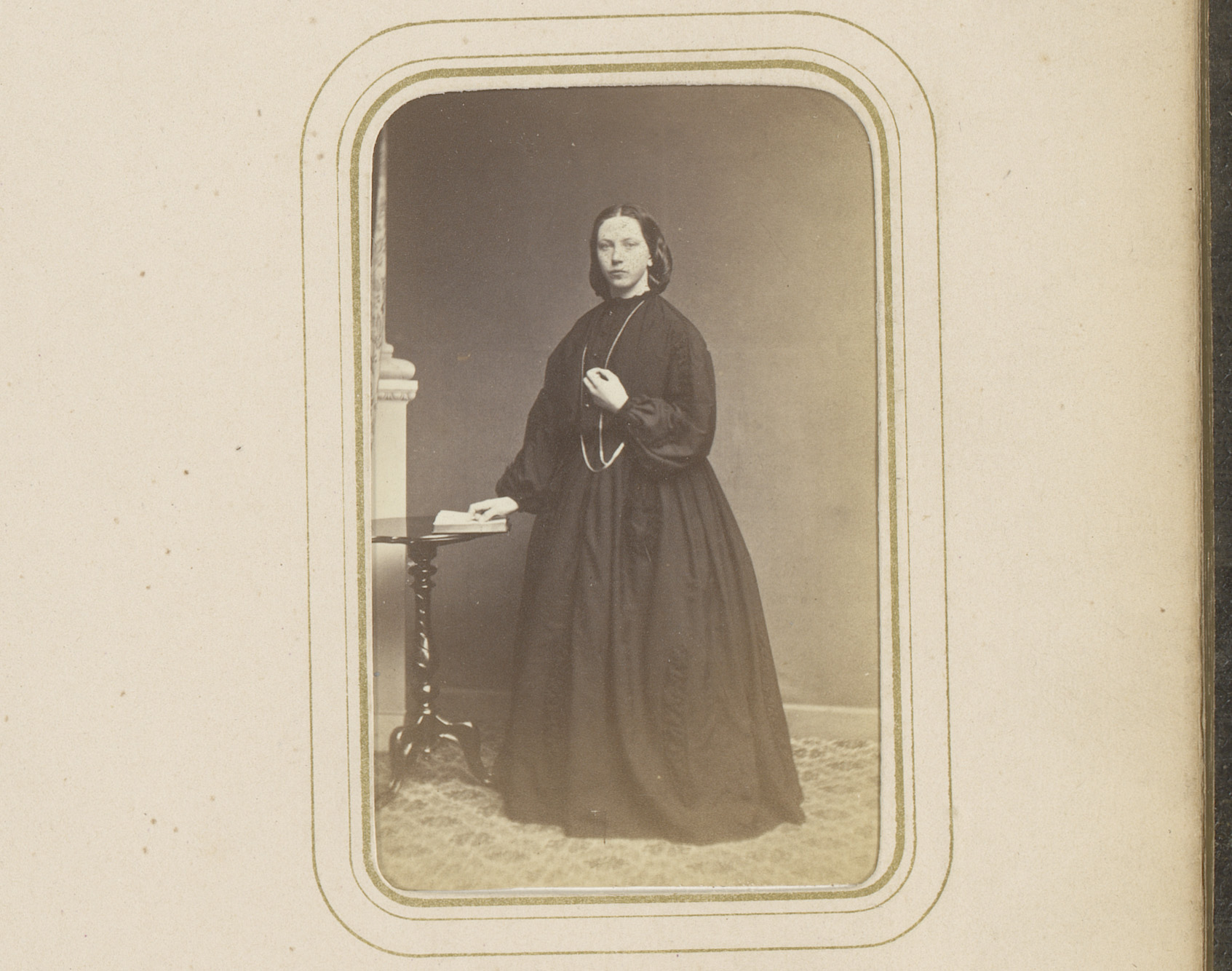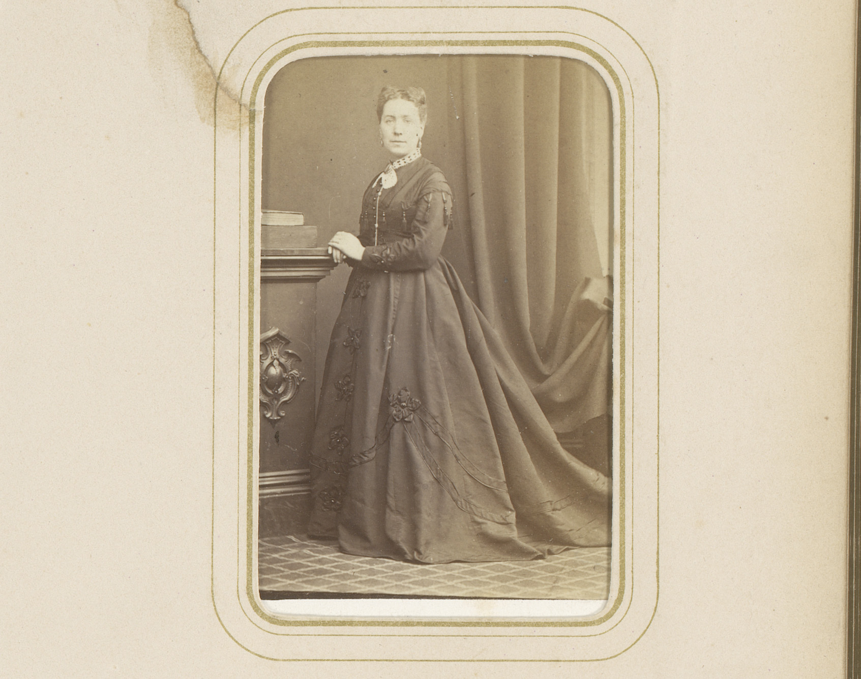 Portret van een vrouw in zwarte jurk met hoed, staan...