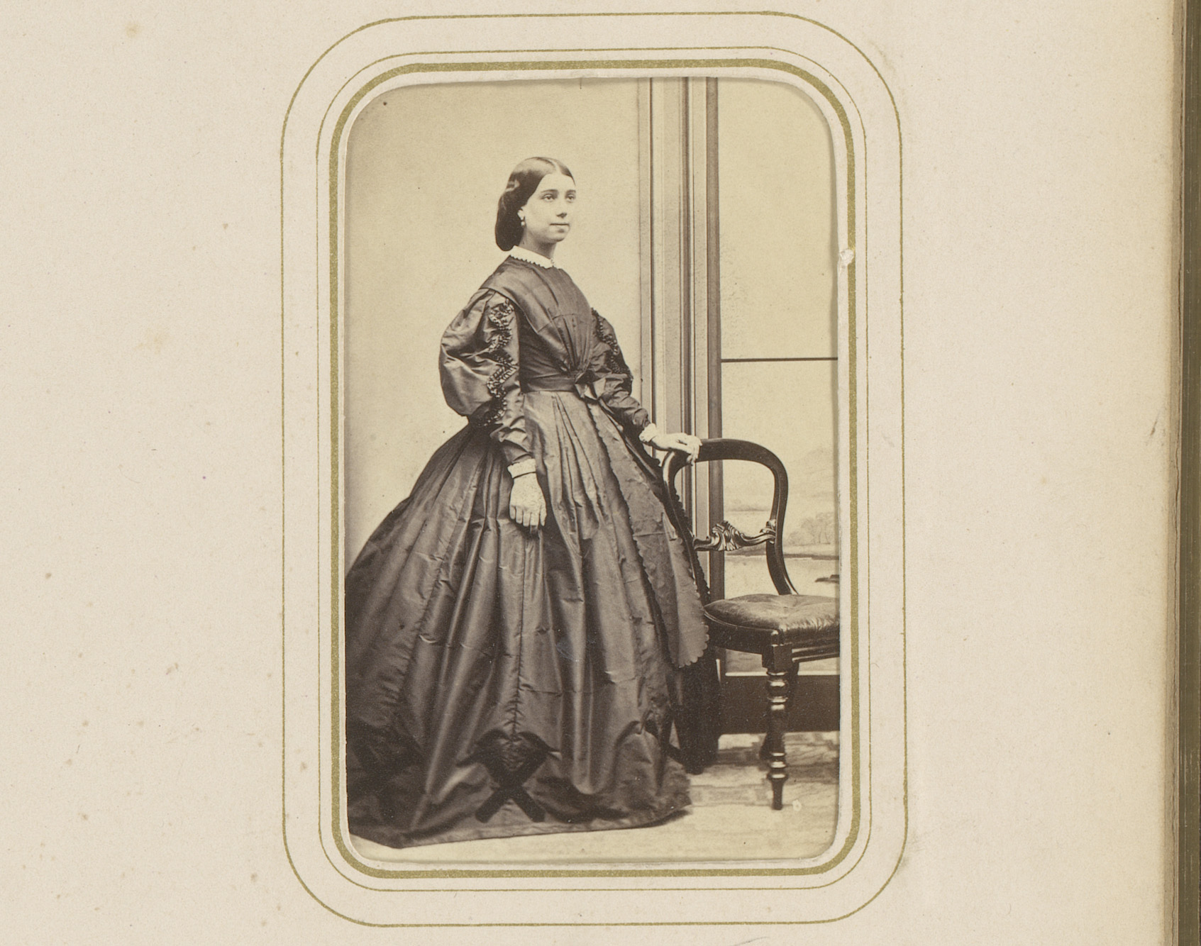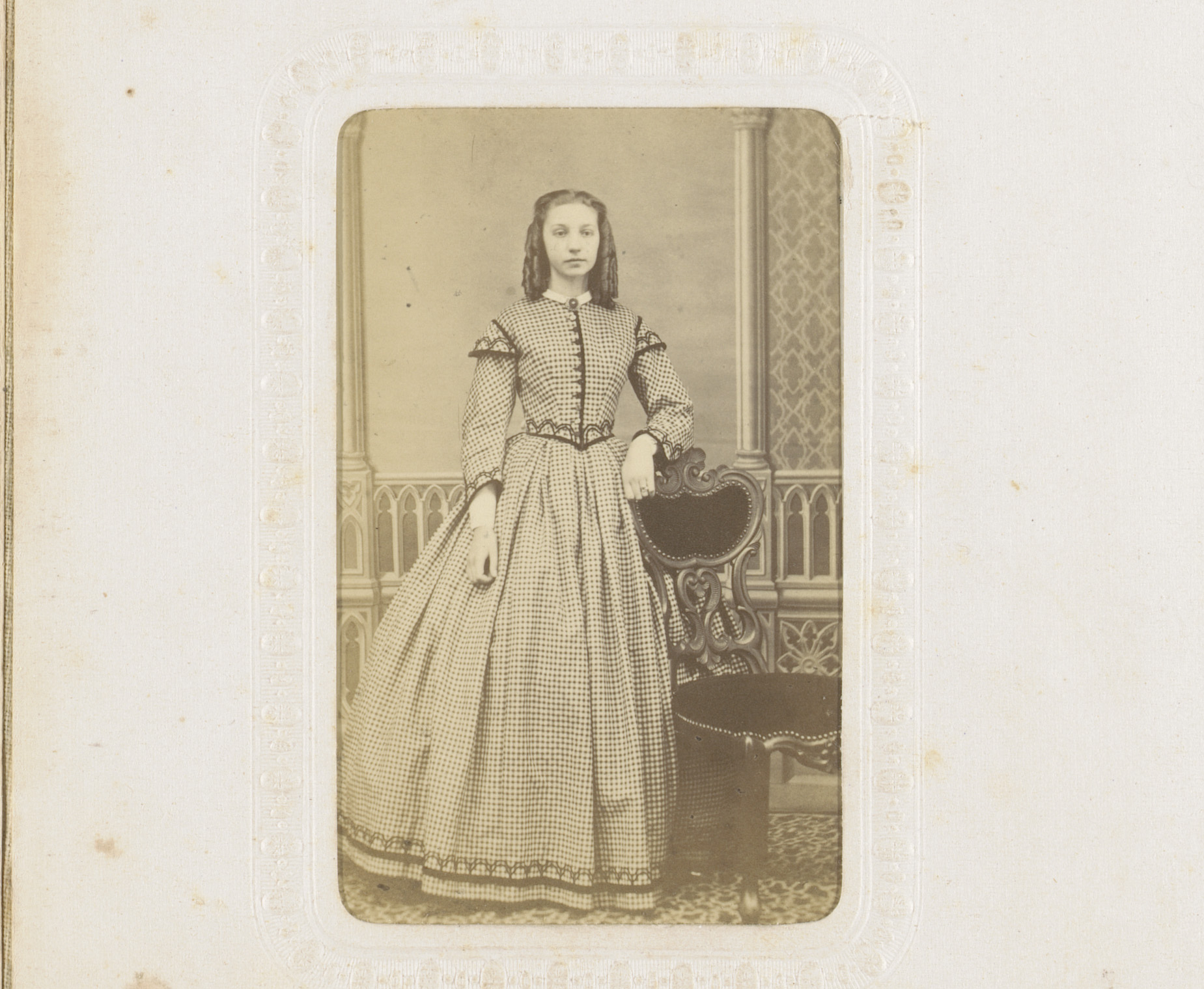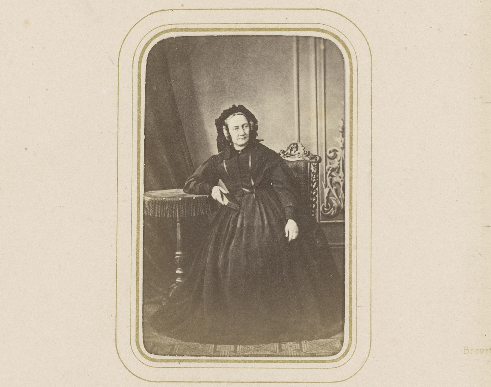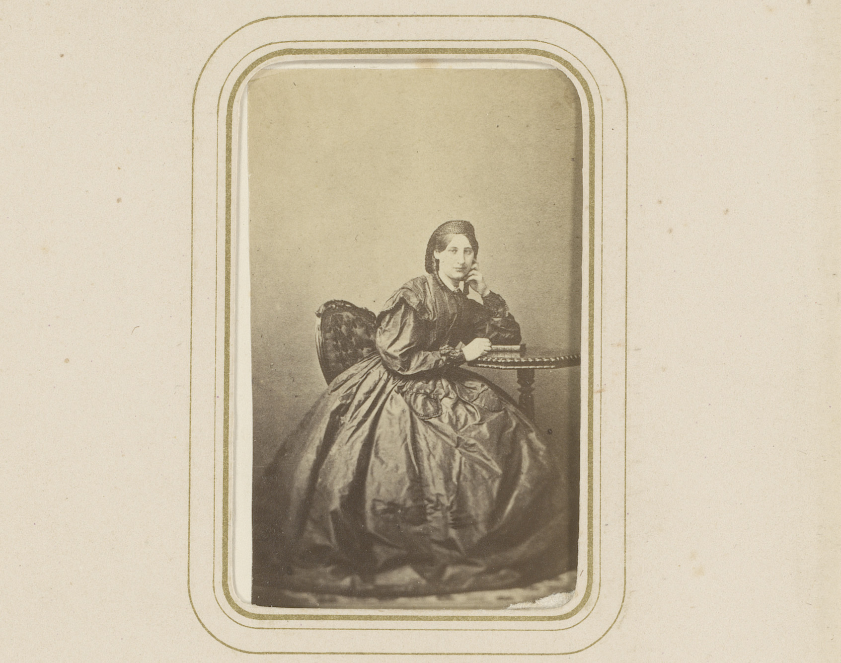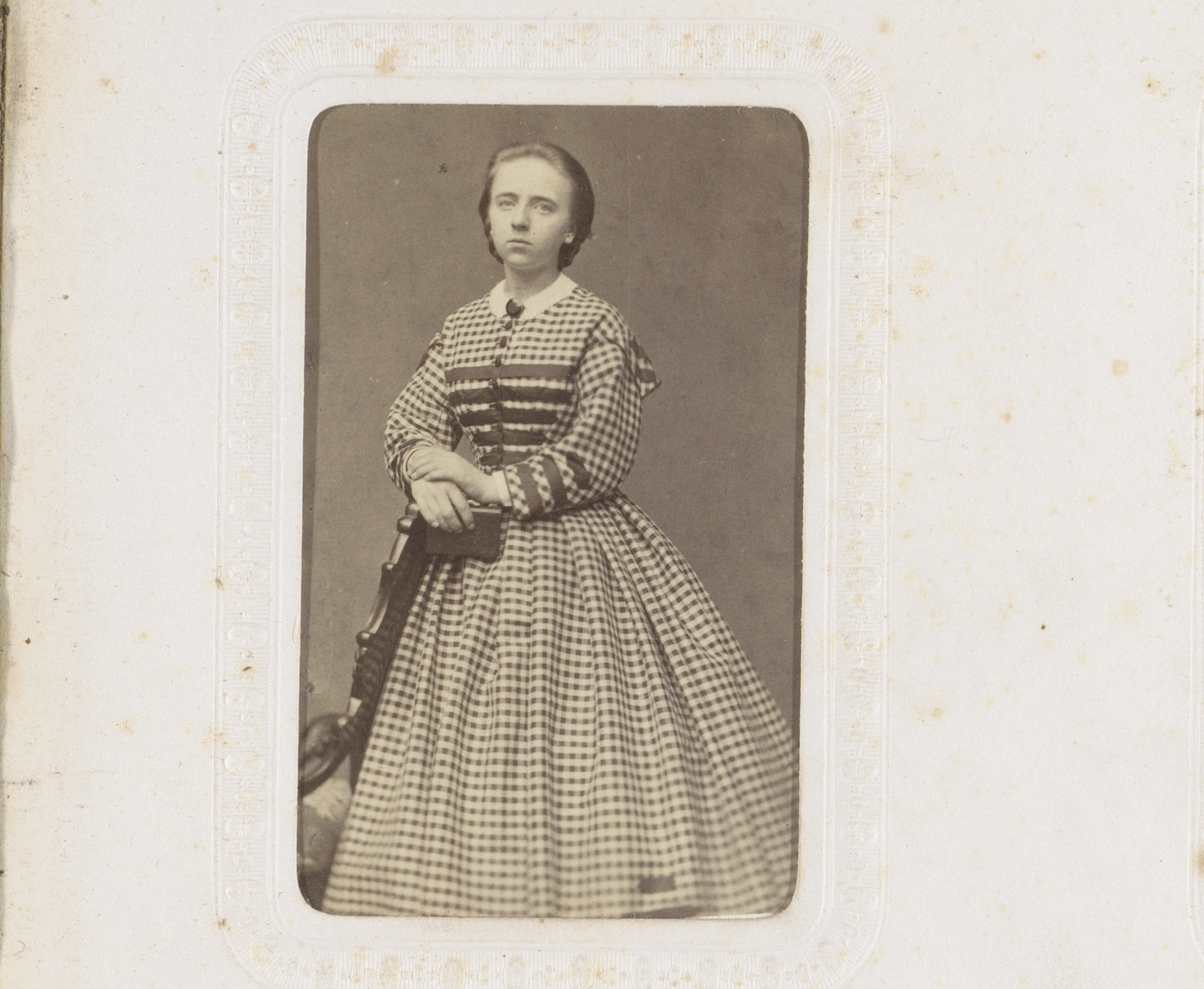 Portret van een vrouw in zwarte jurk met hoed, staan...