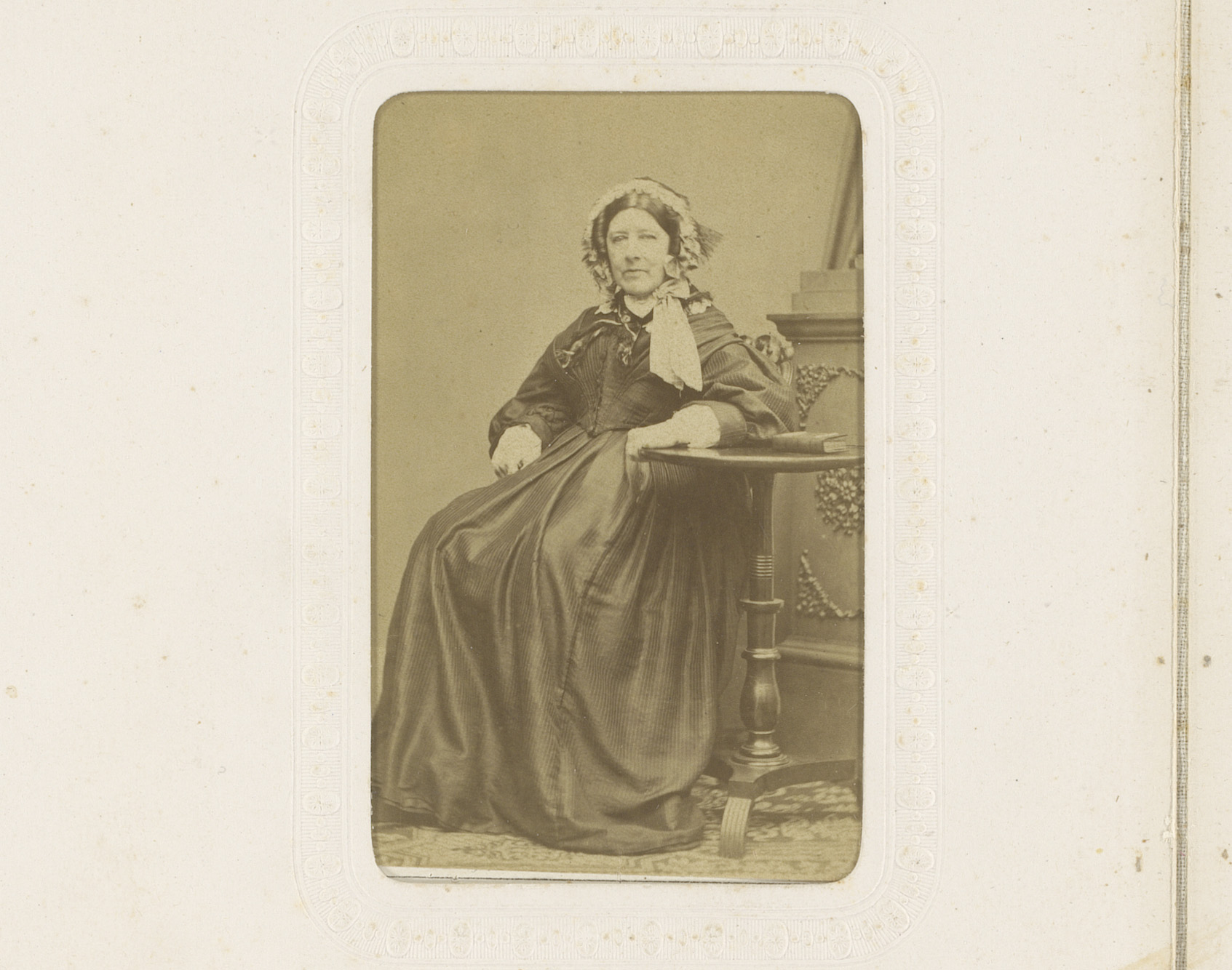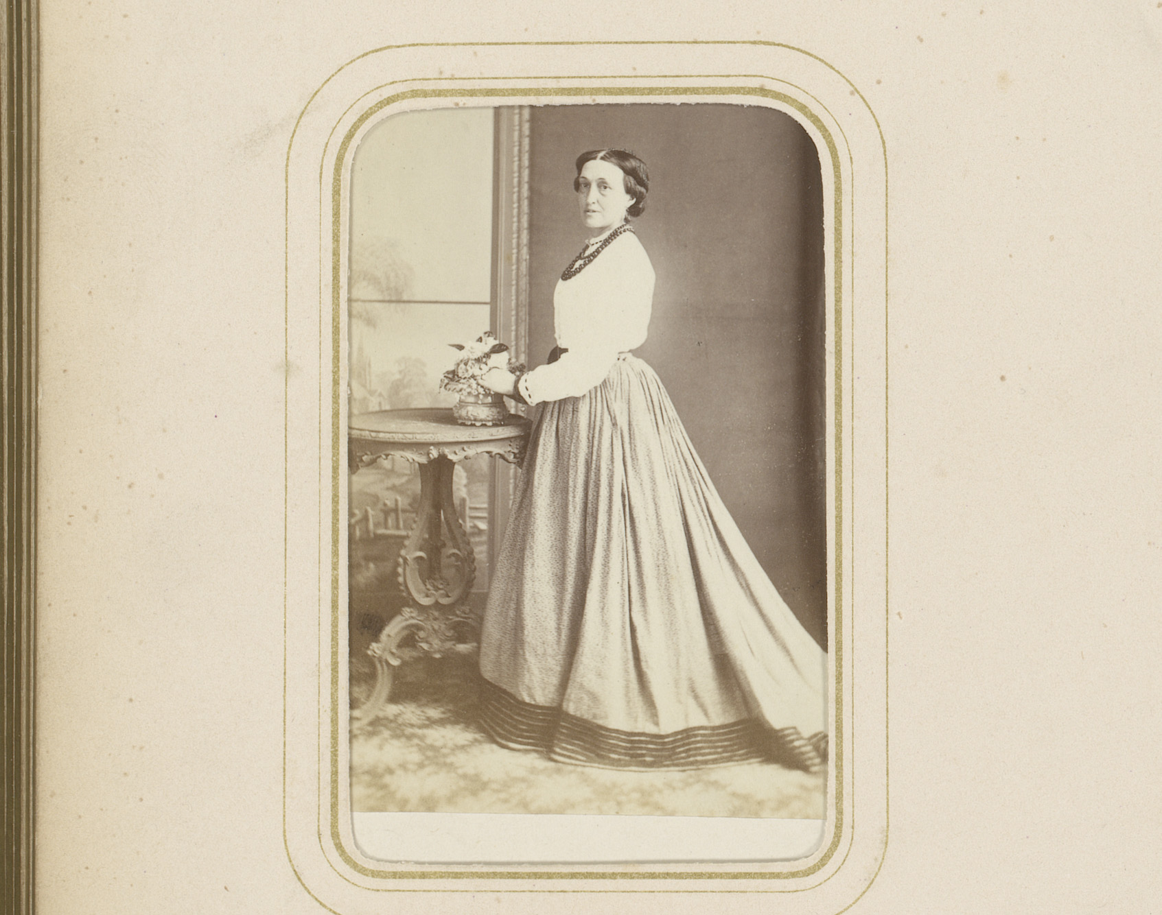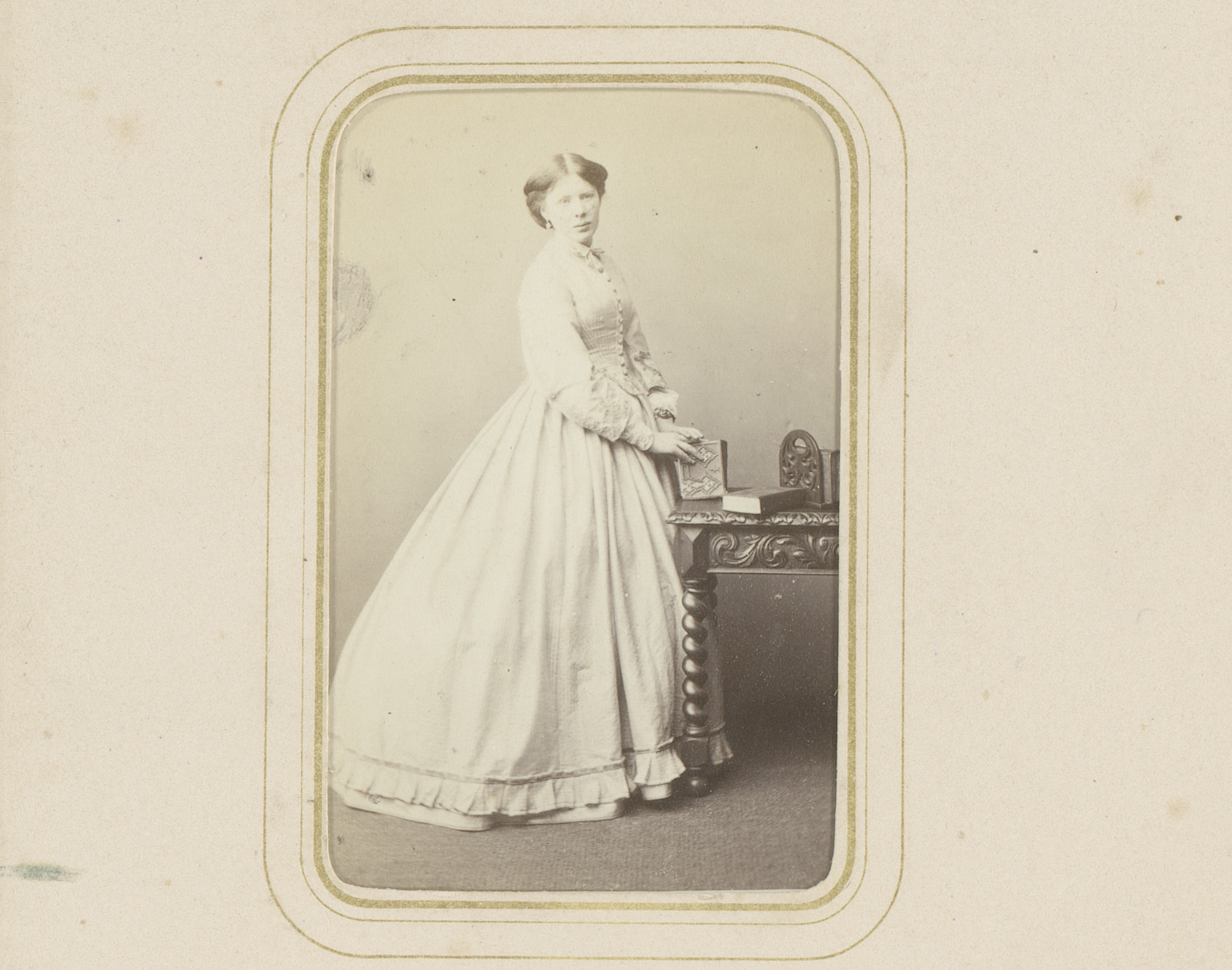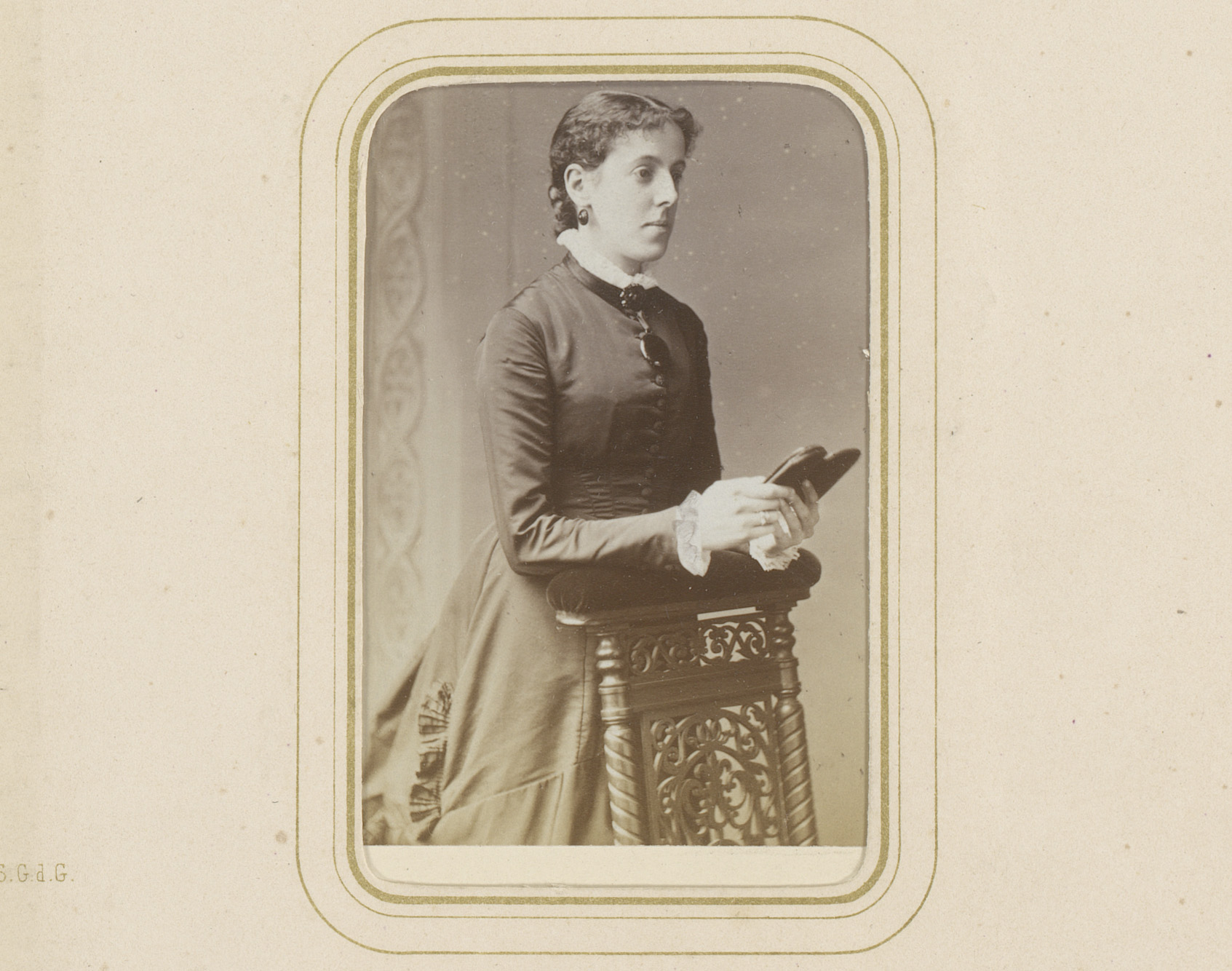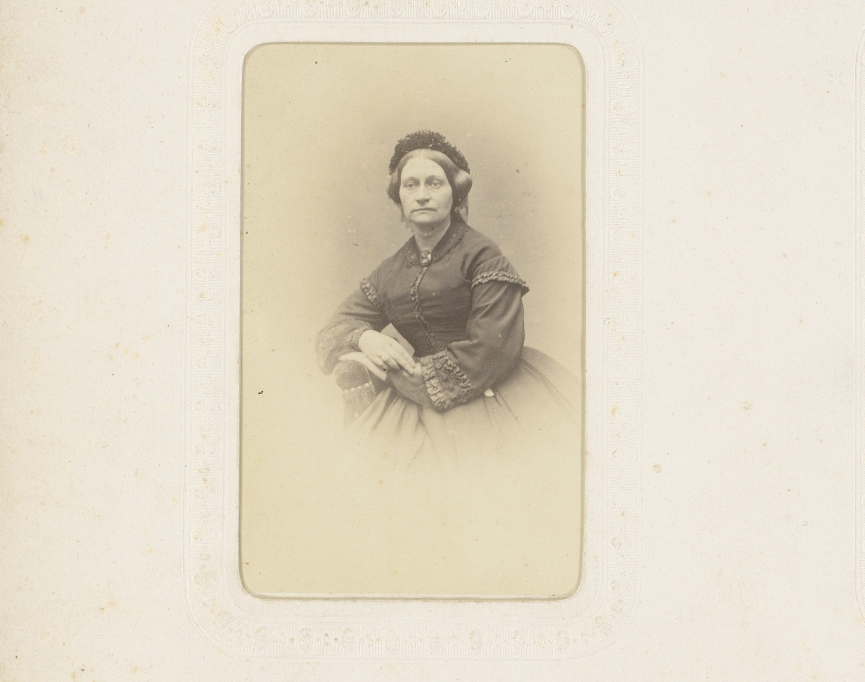 Portret van een vrouw in zwarte jurk met hoed, staan...