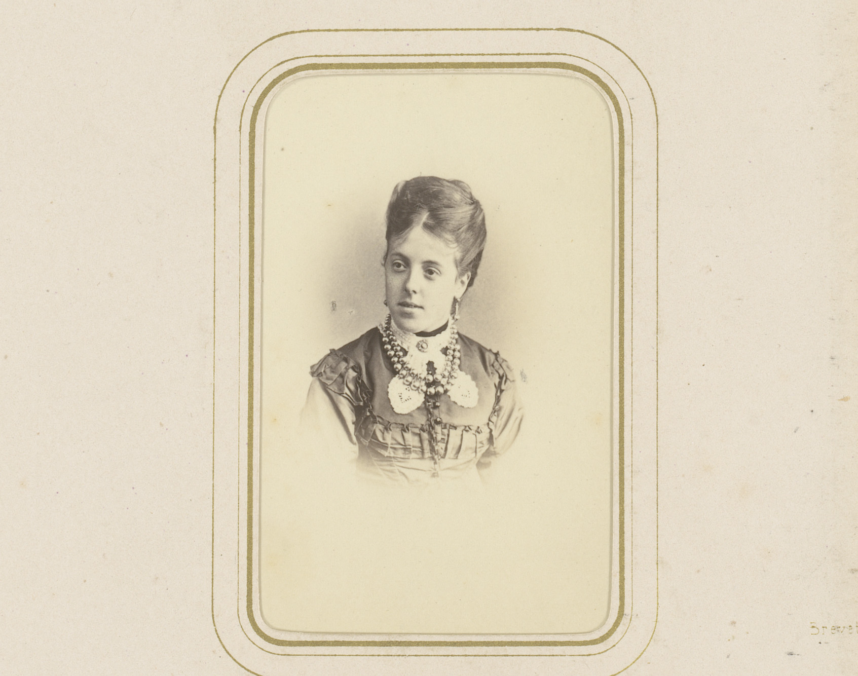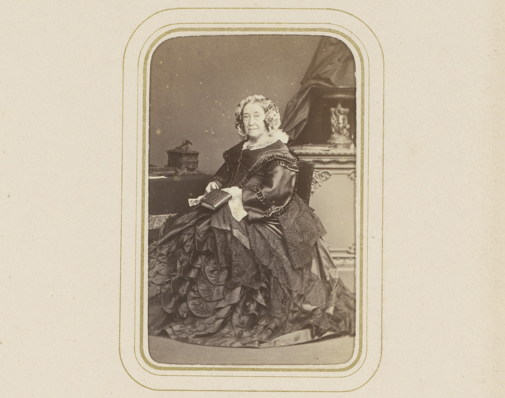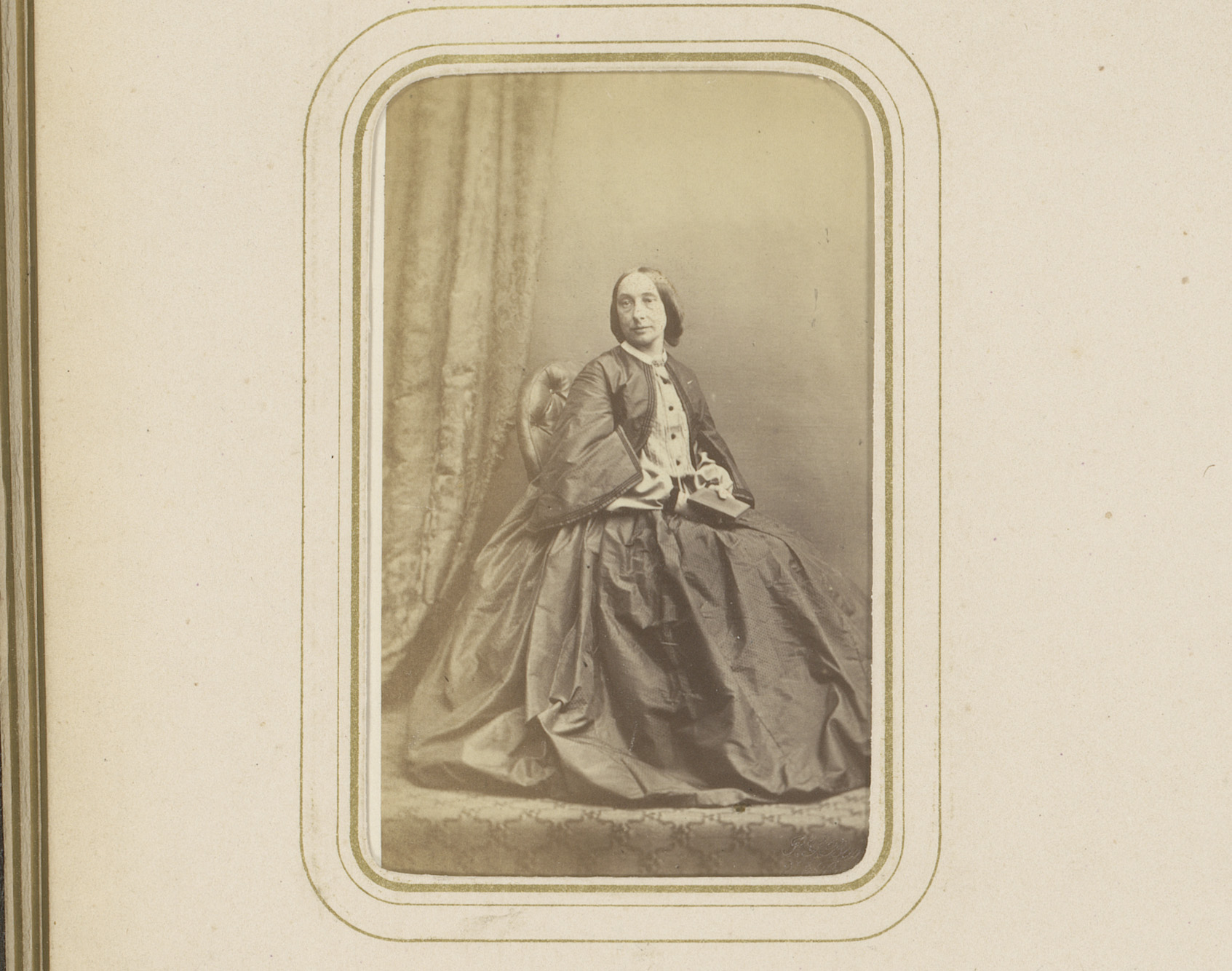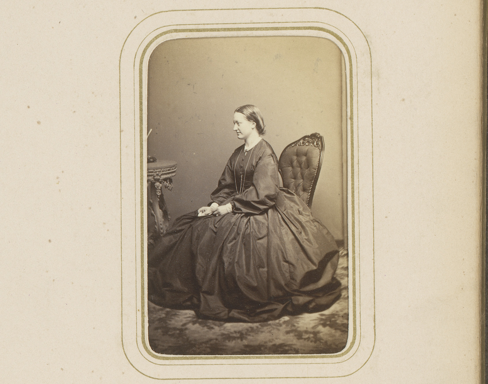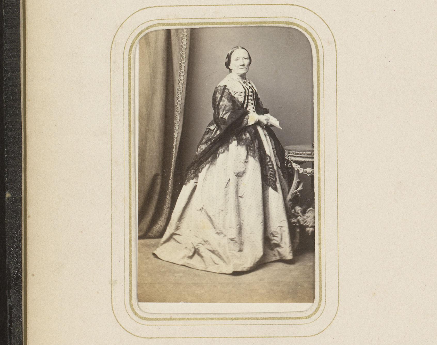 Portret van een vrouw in zwarte jurk met hoed, staan...