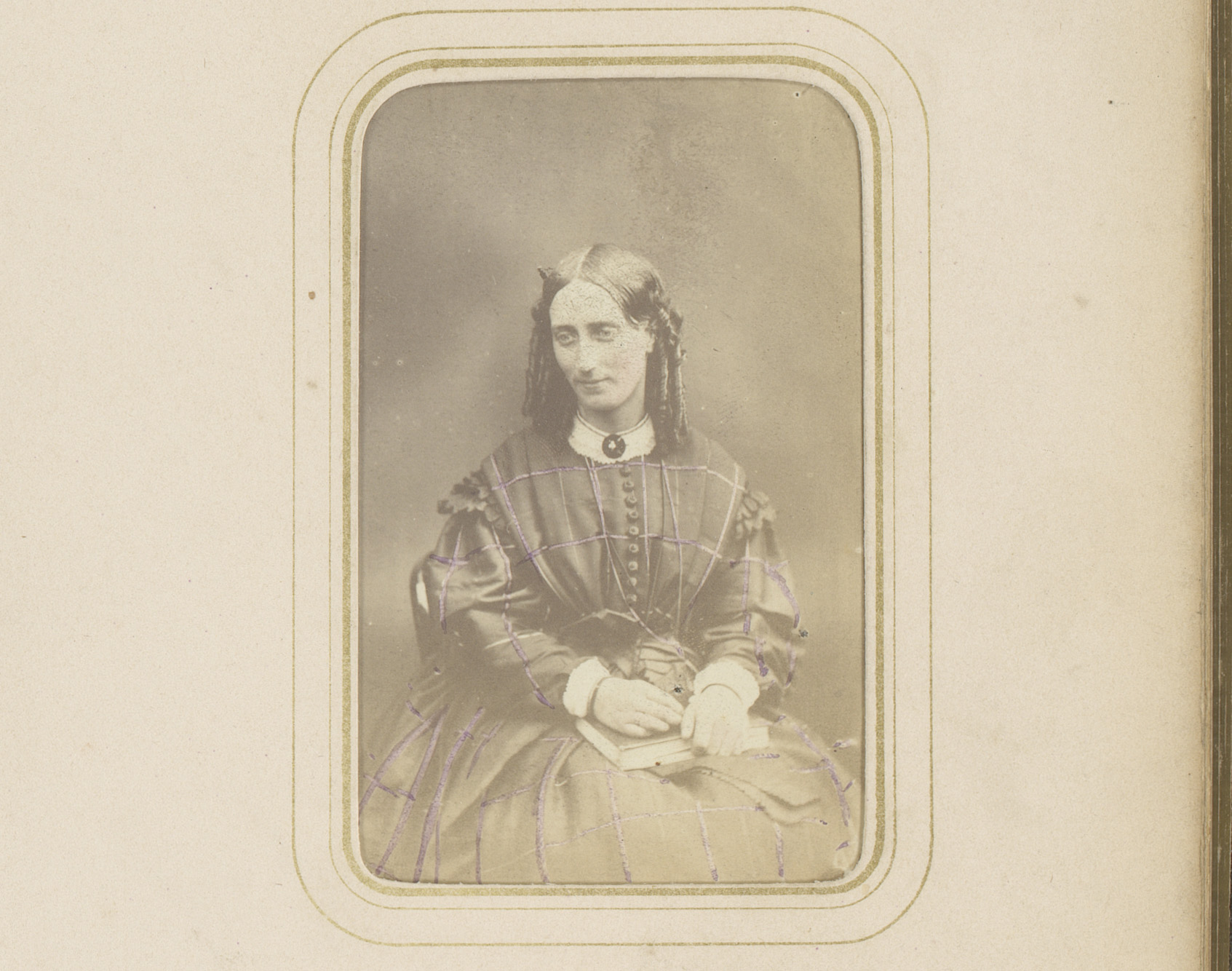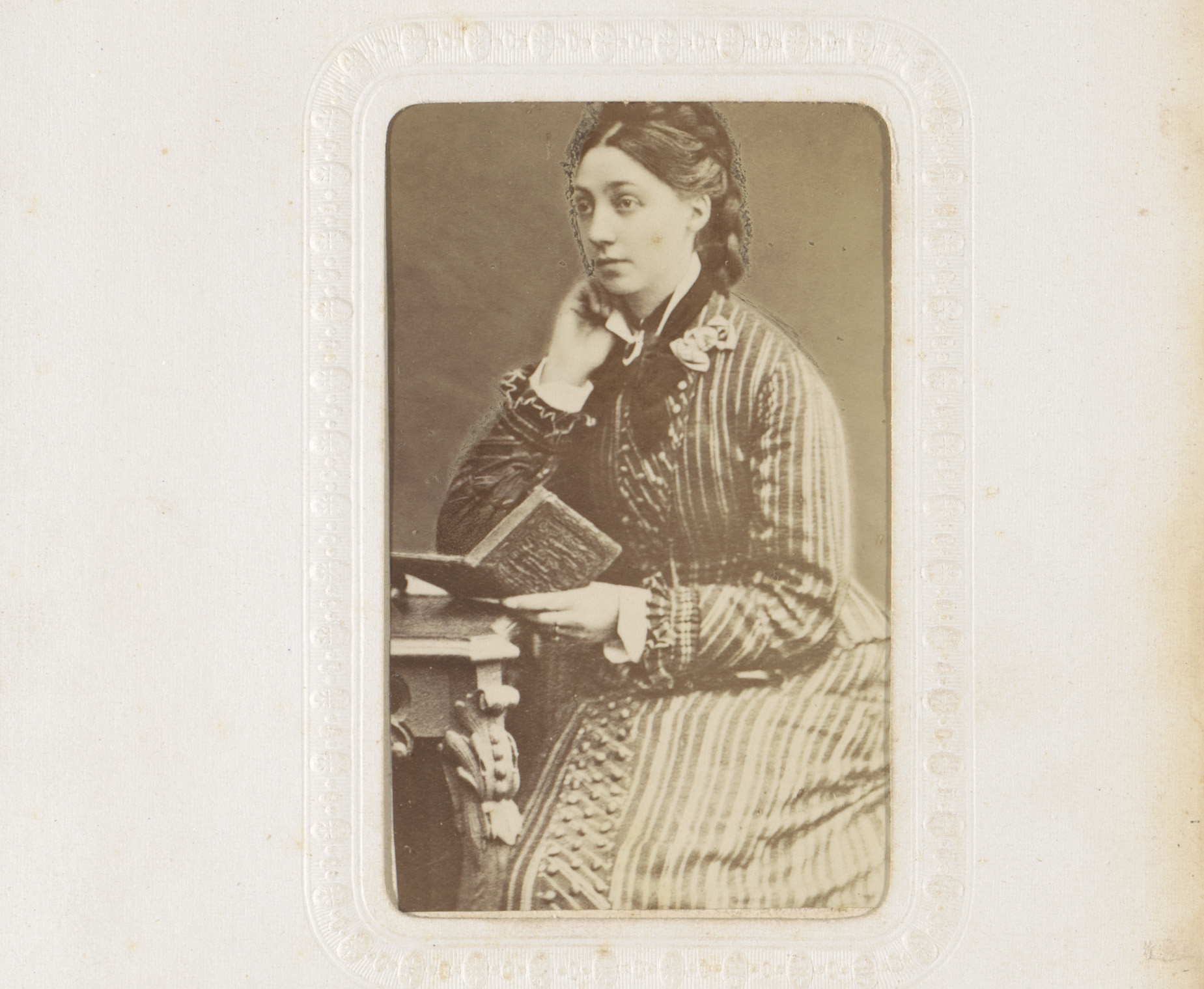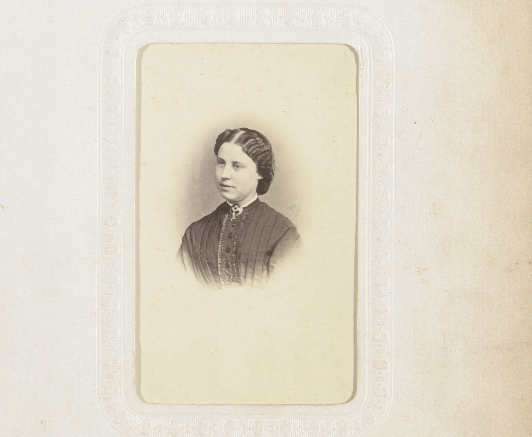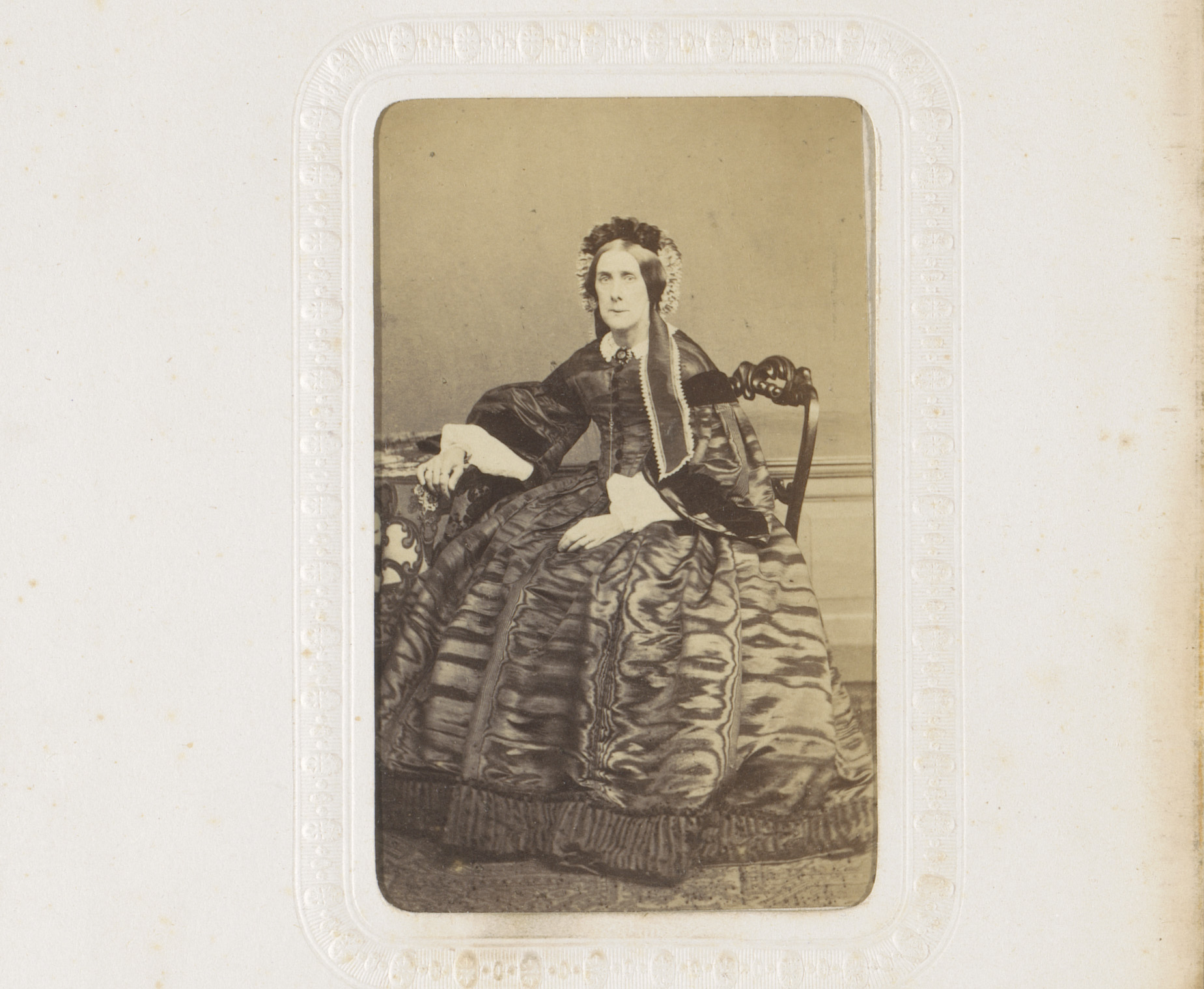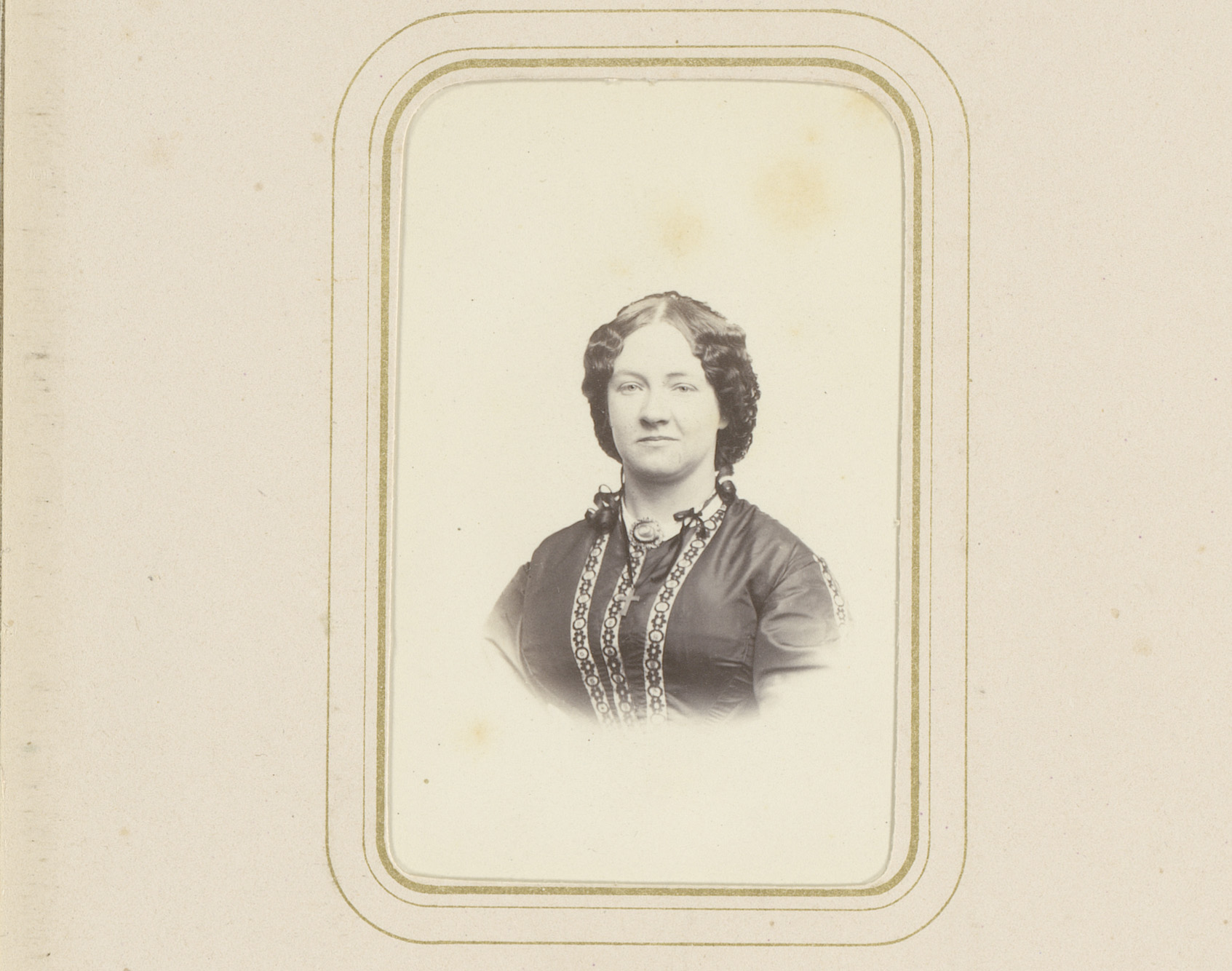 Portret van een vrouw in zwarte jurk met hoed, staan...