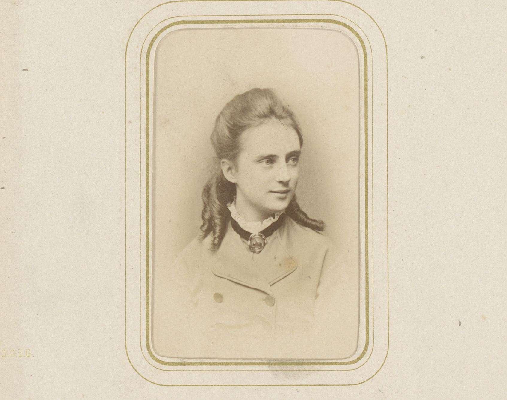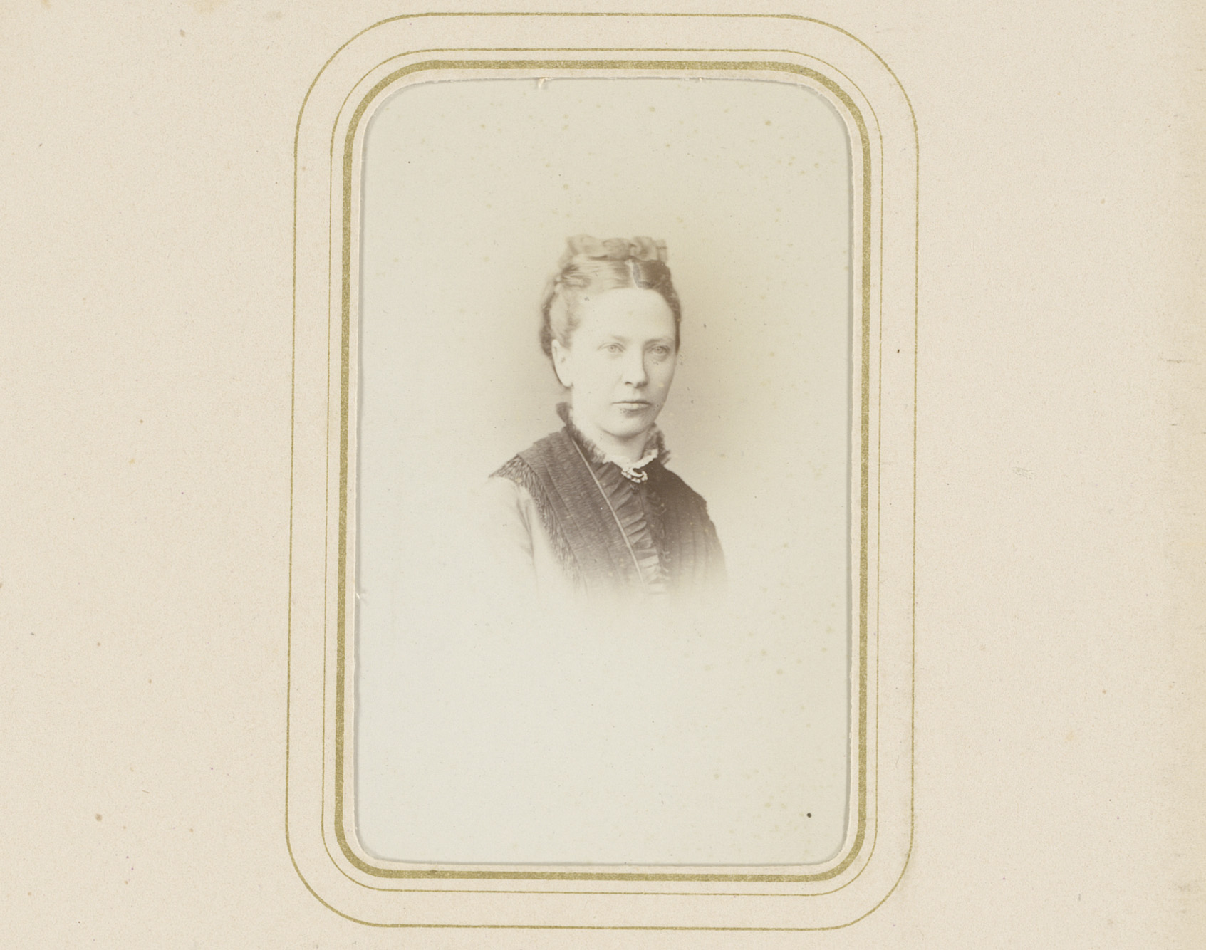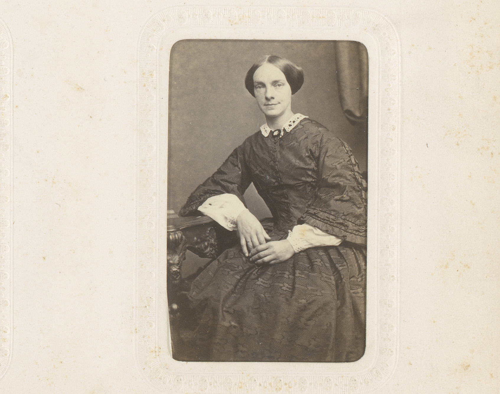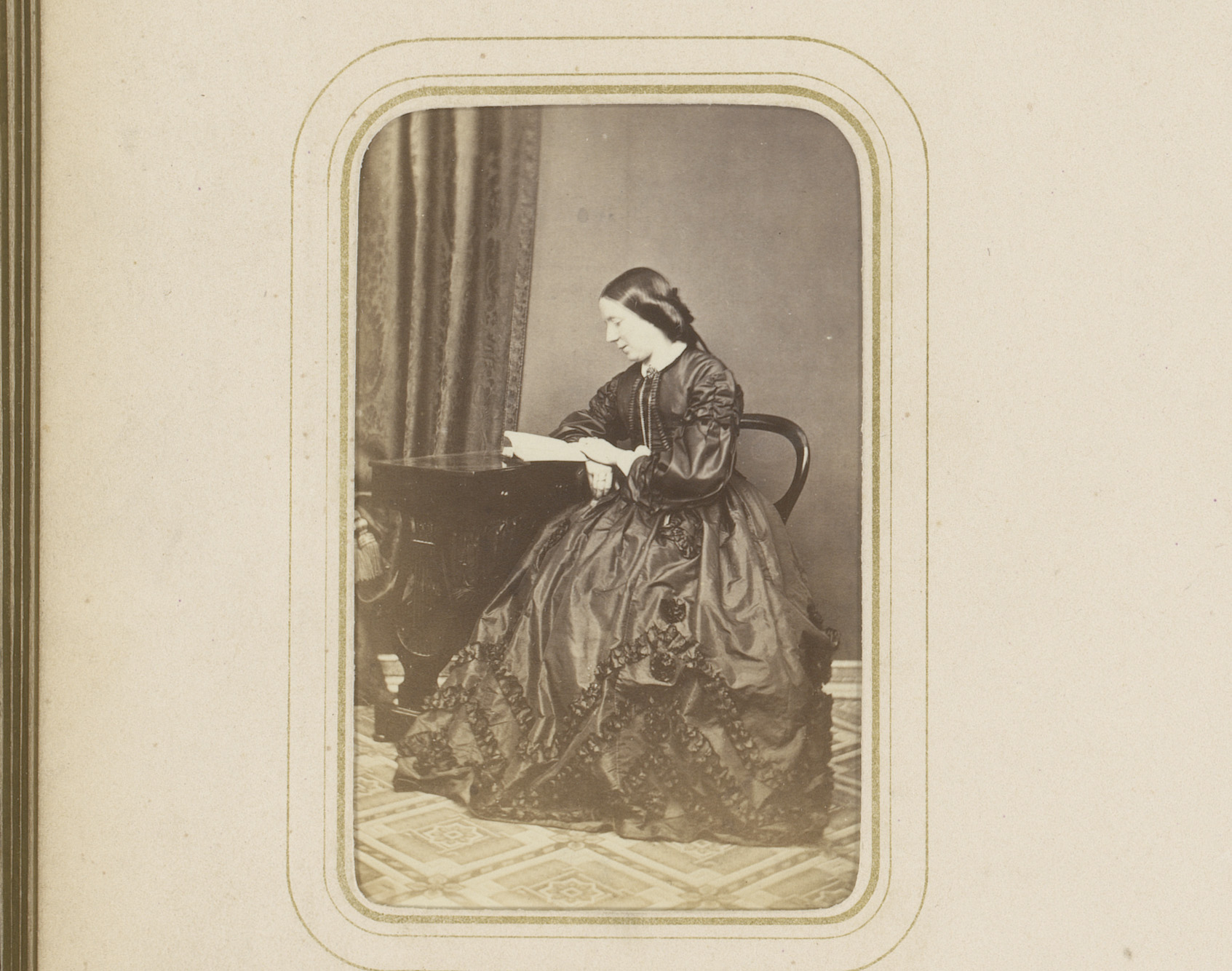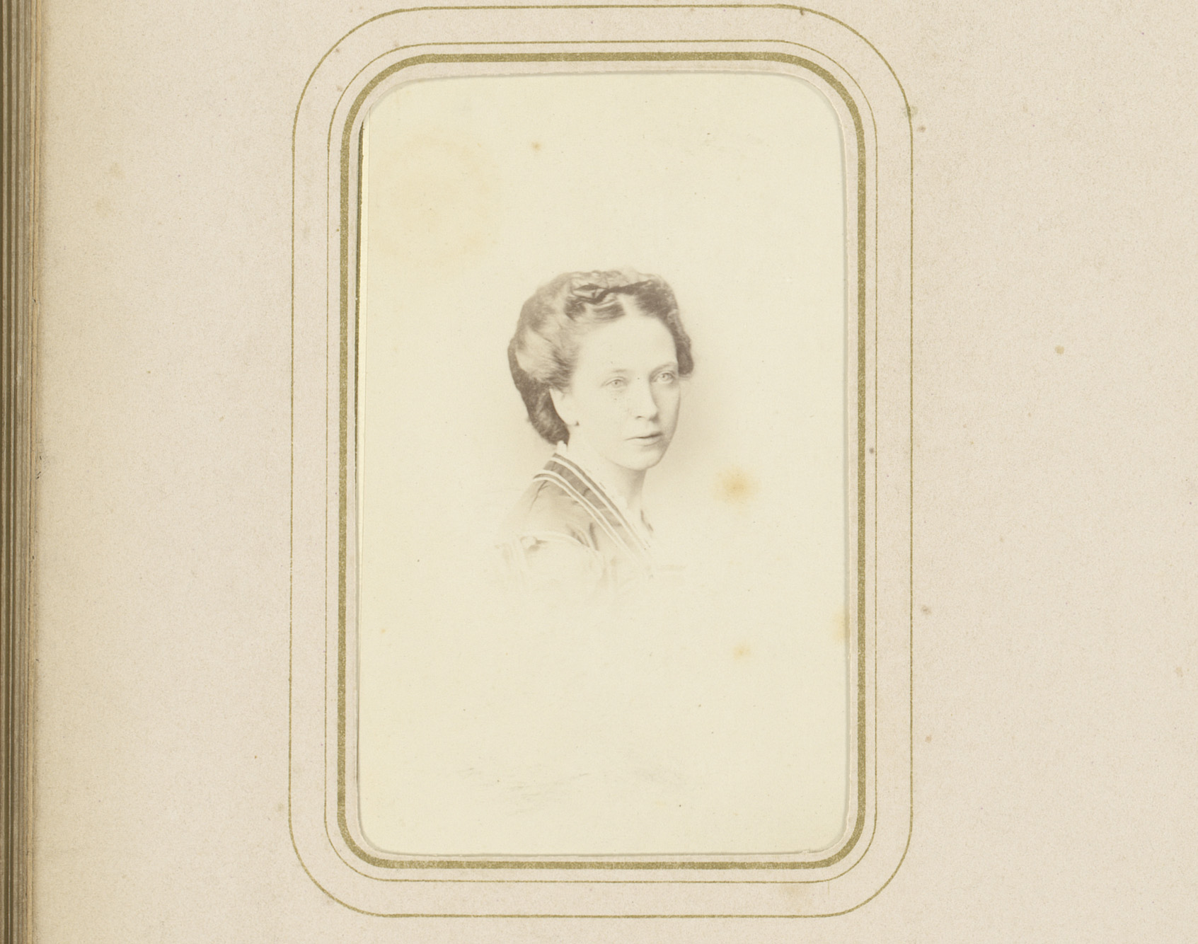 Portret van een vrouw in zwarte jurk met hoed, staan...