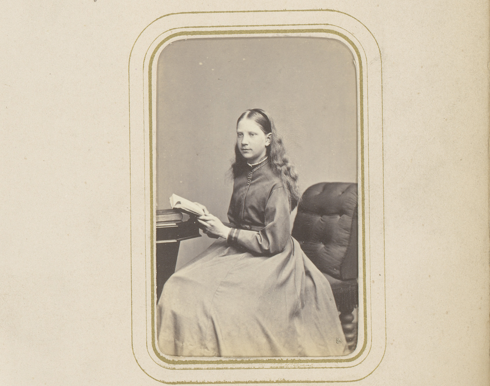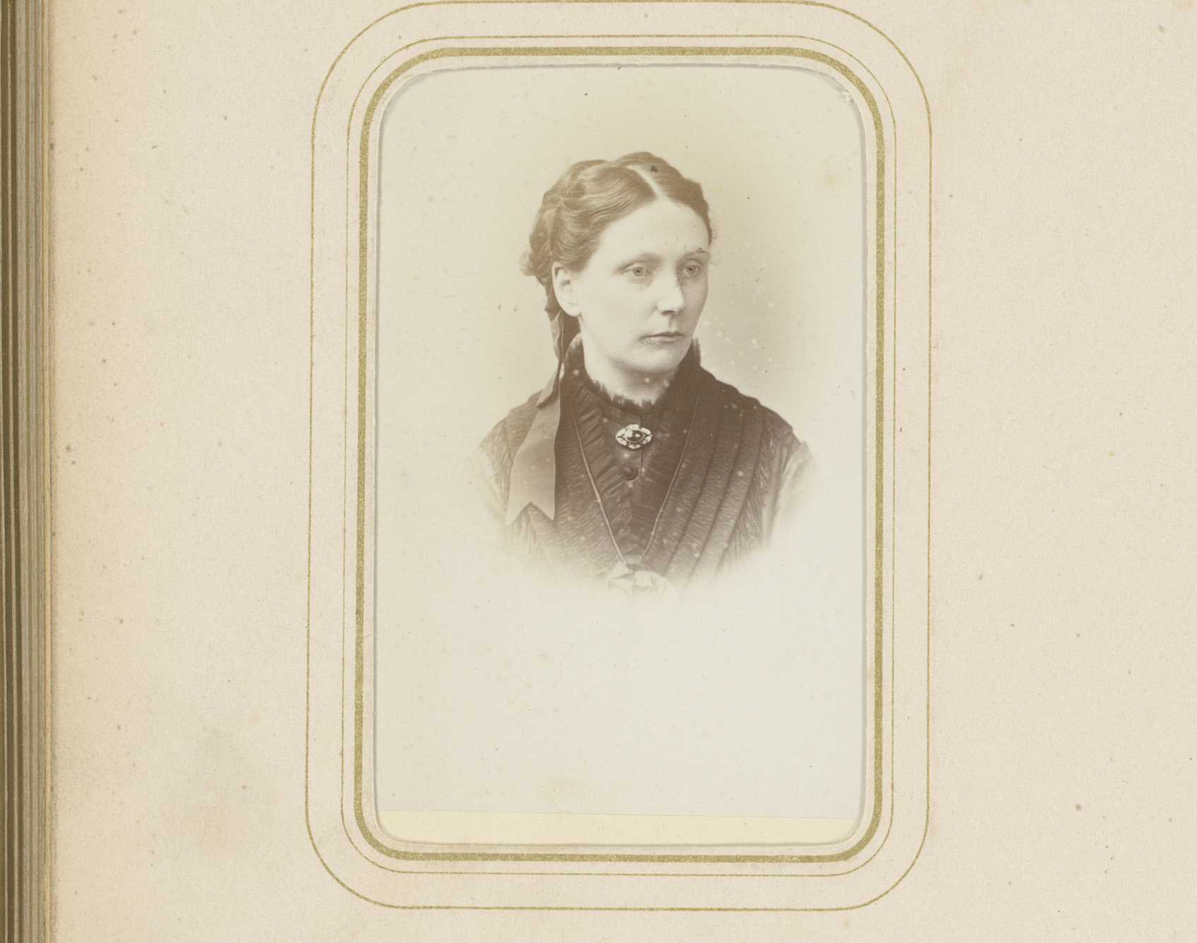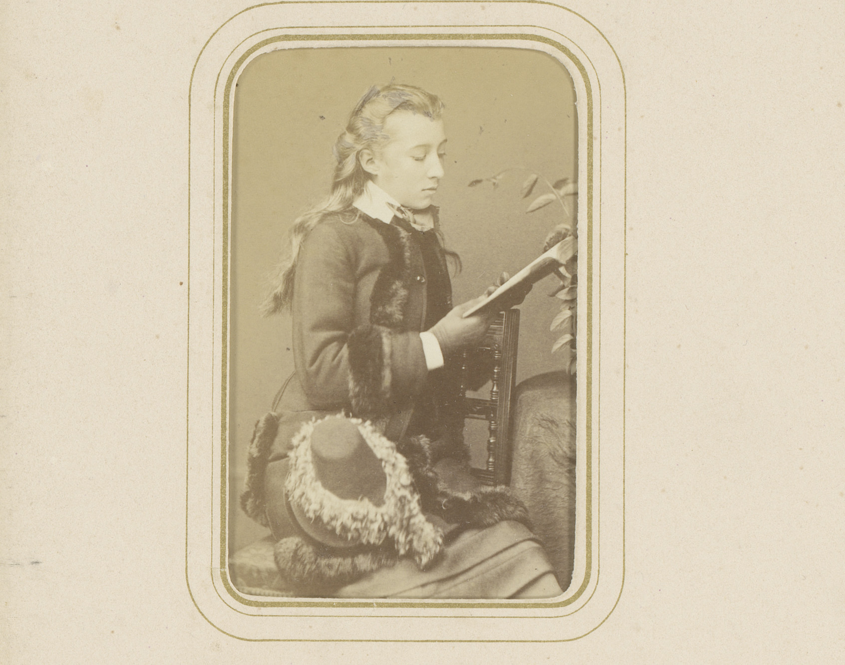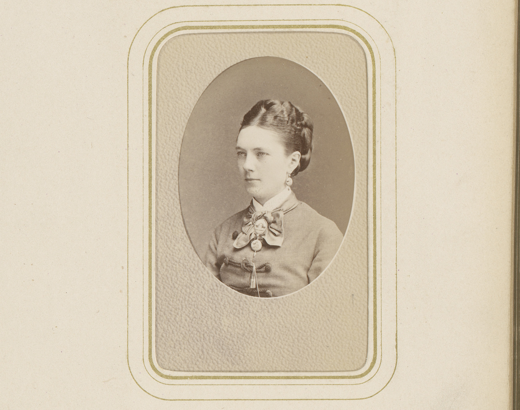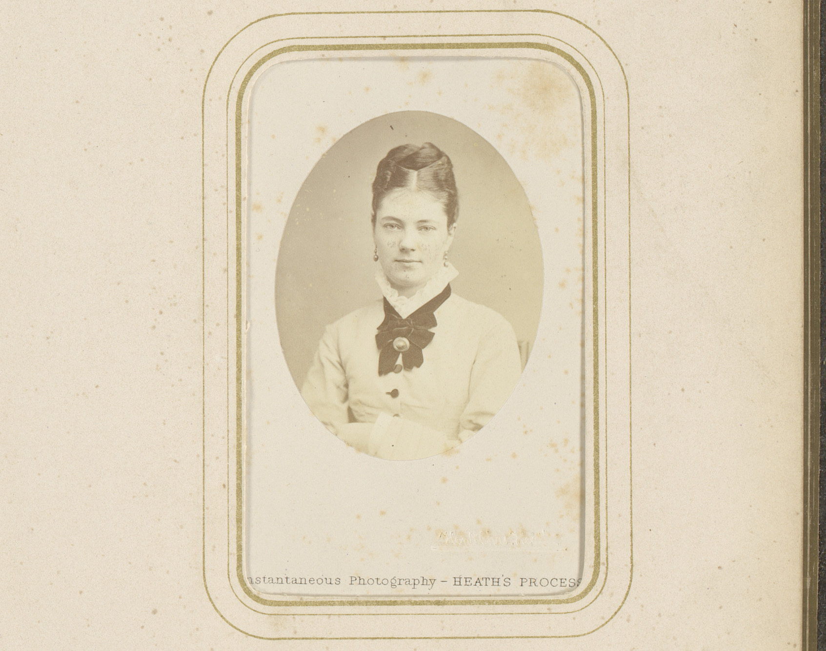 Portret van een vrouw in zwarte jurk met hoed, staan...