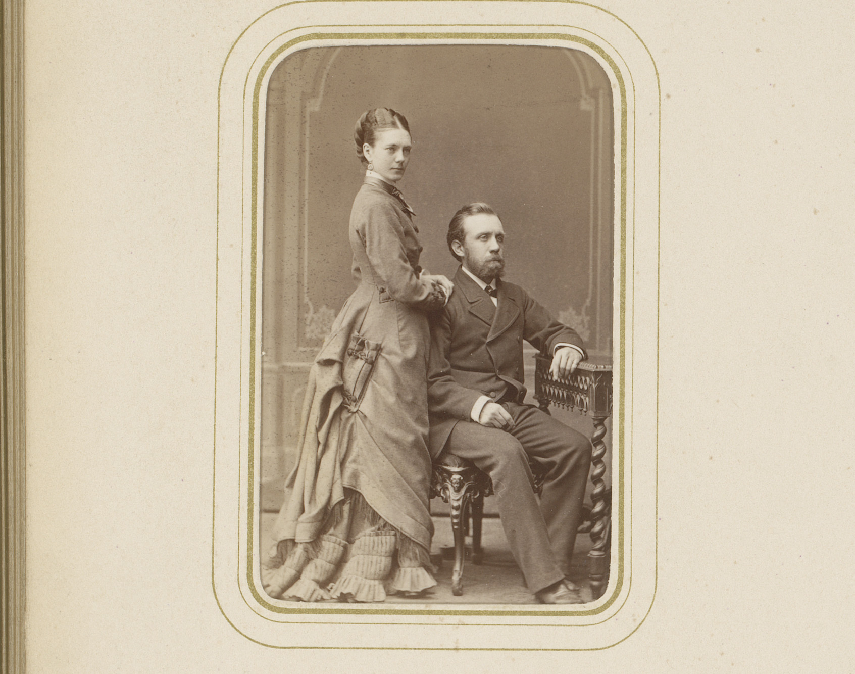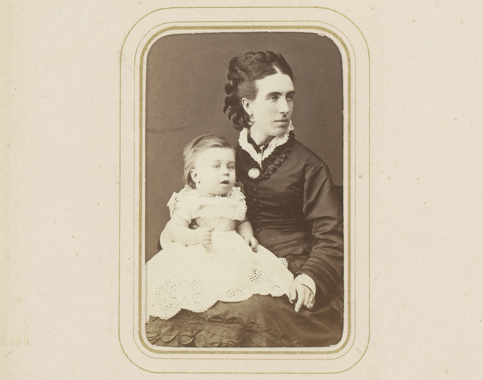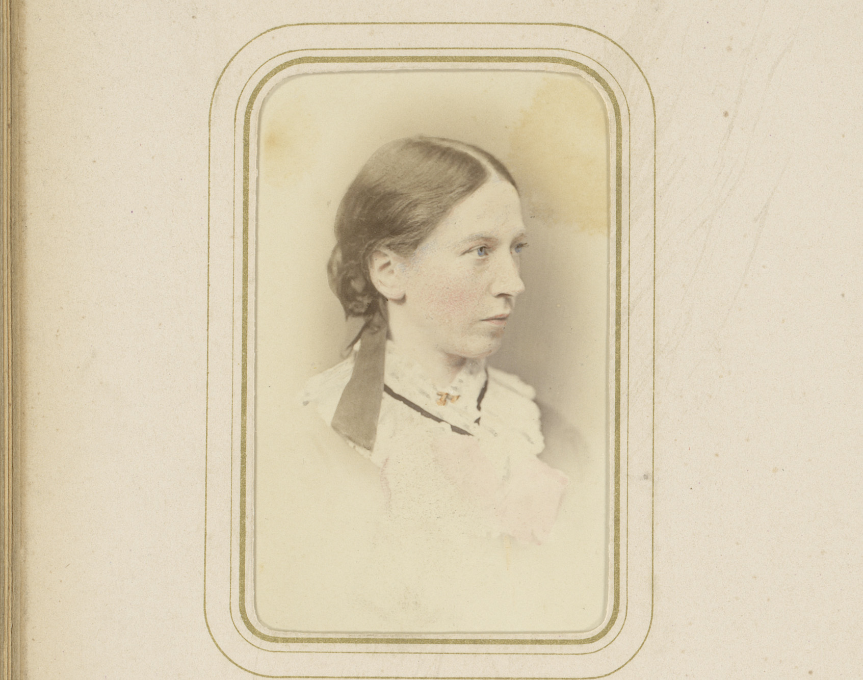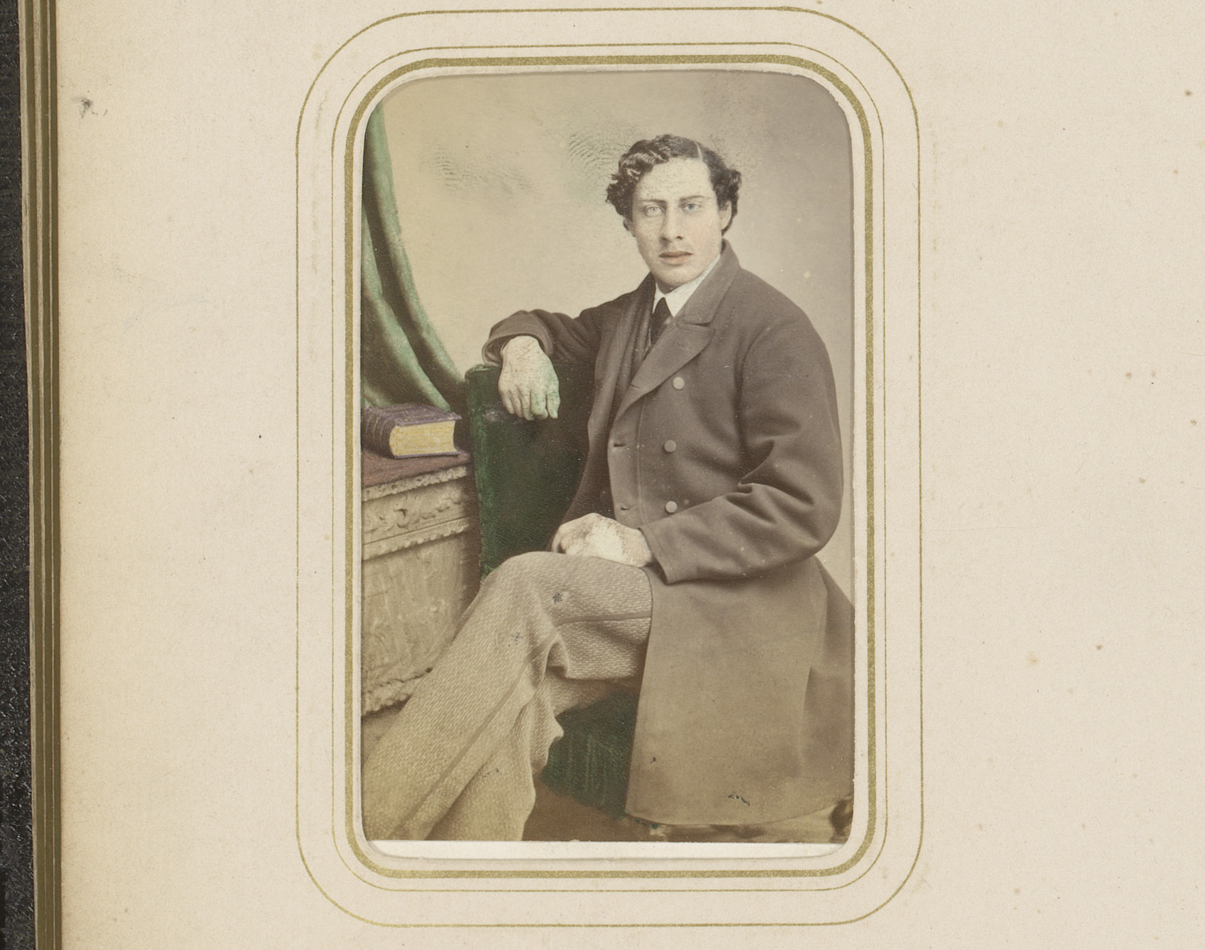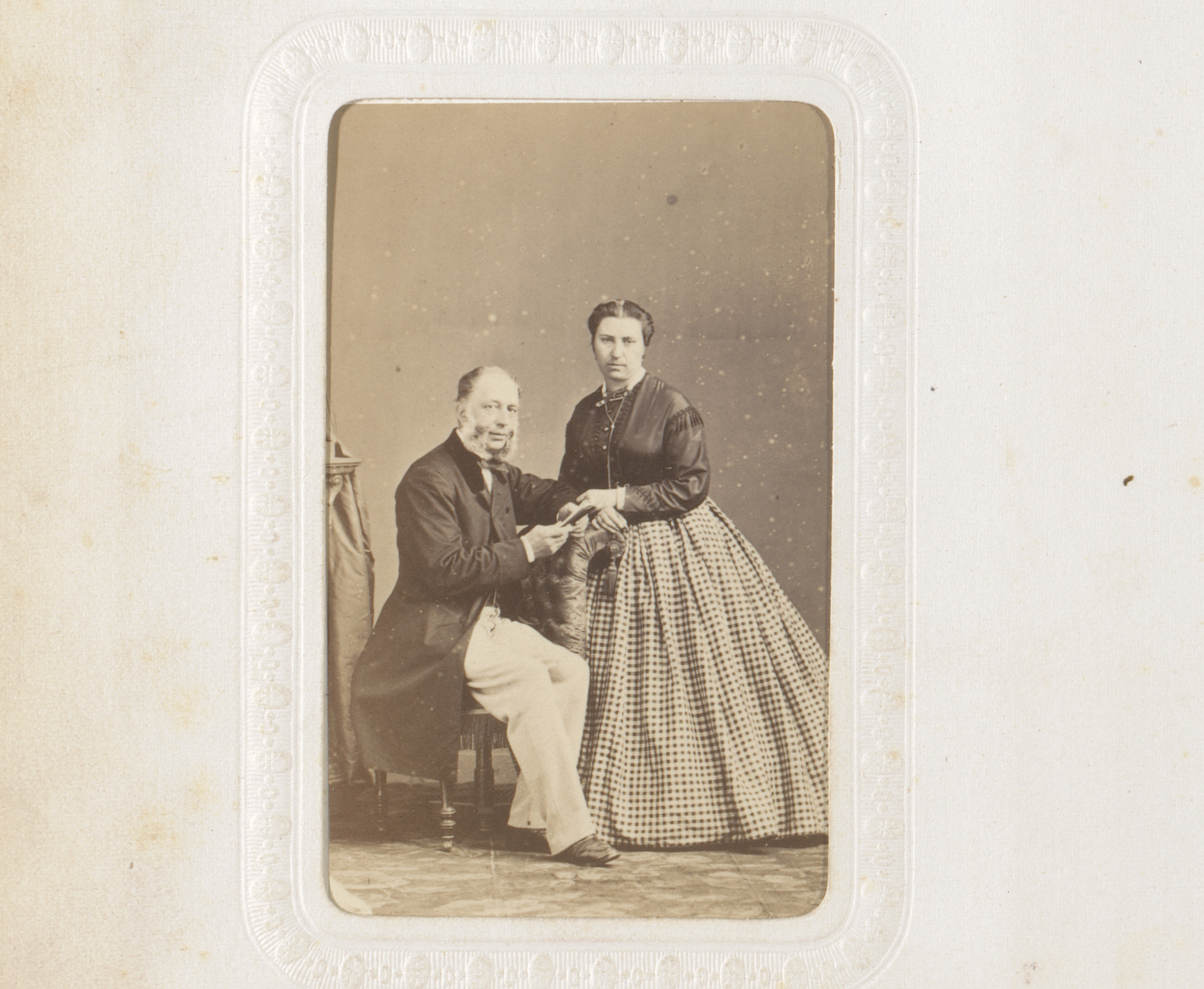 Portret van een vrouw in zwarte jurk met hoed, staan...