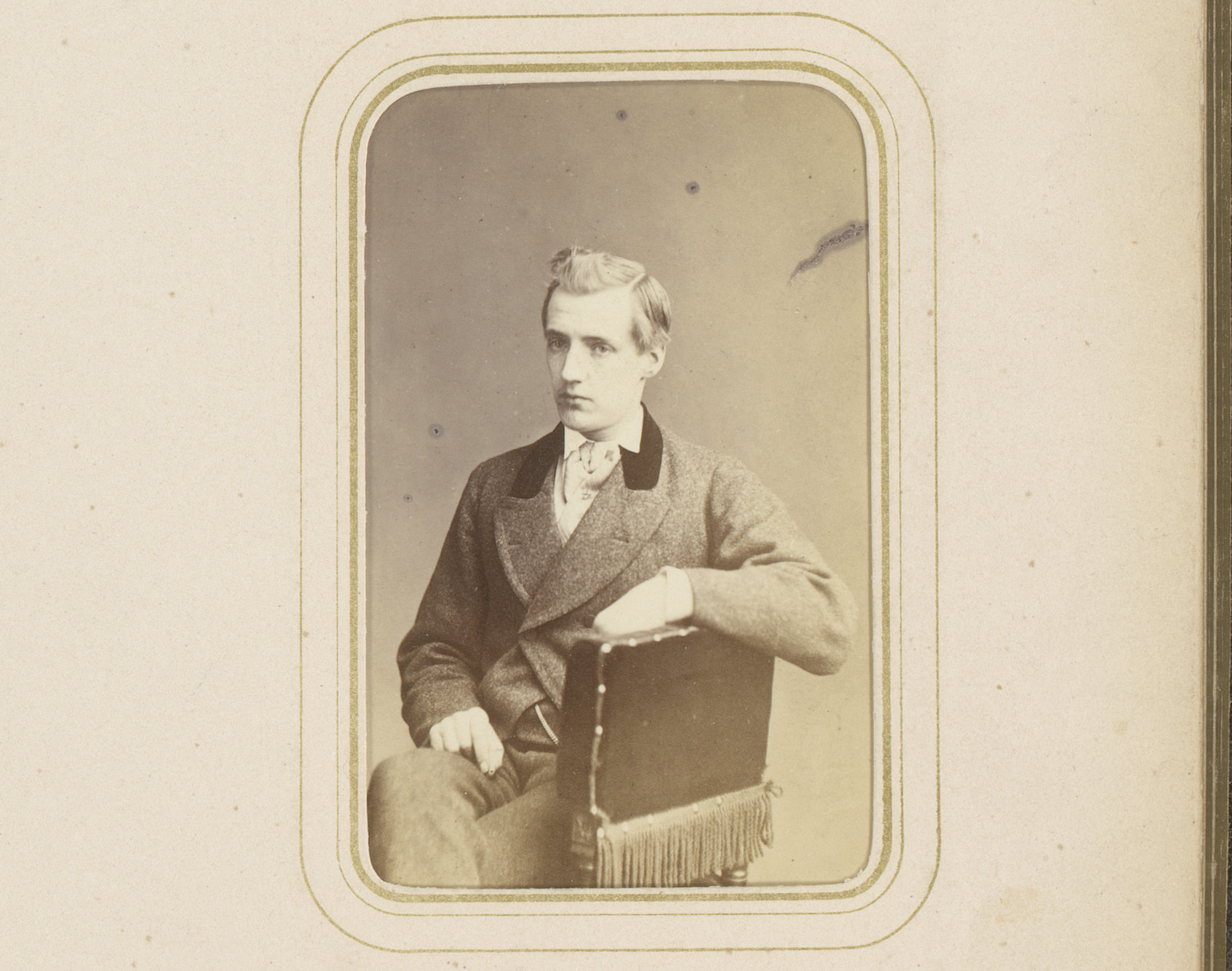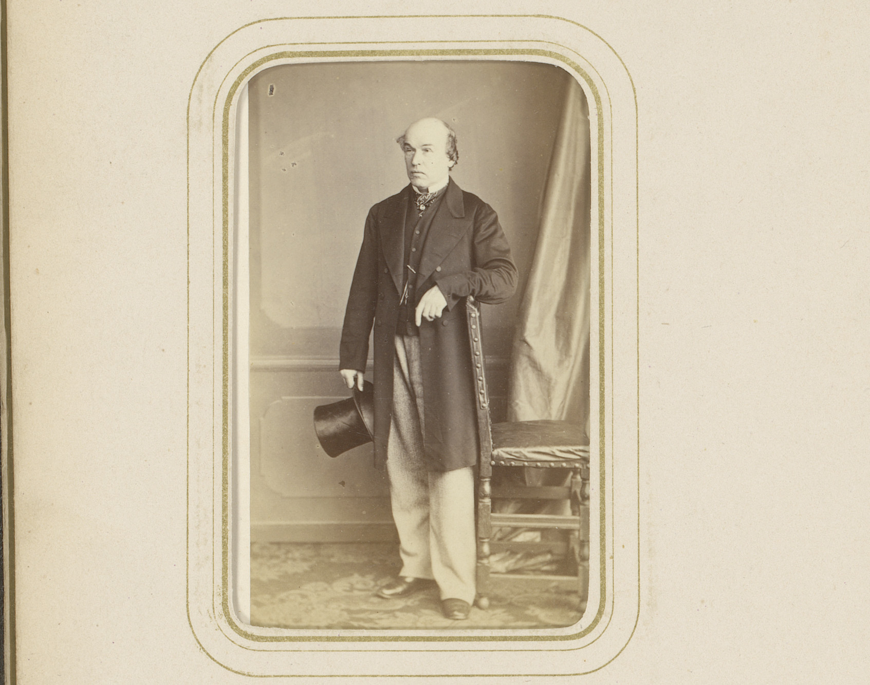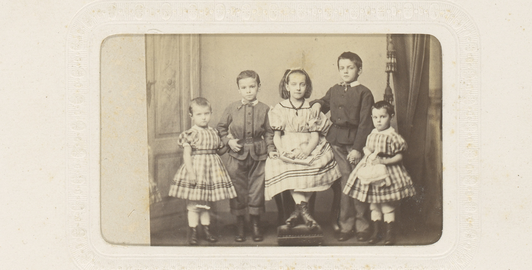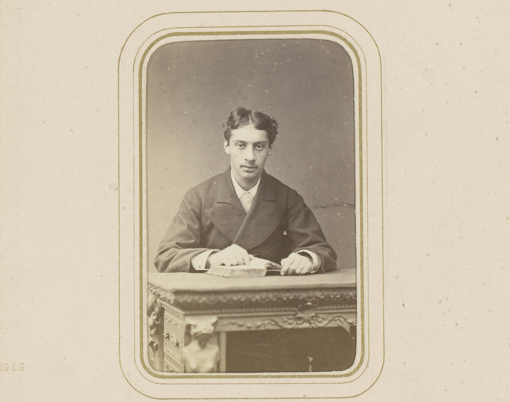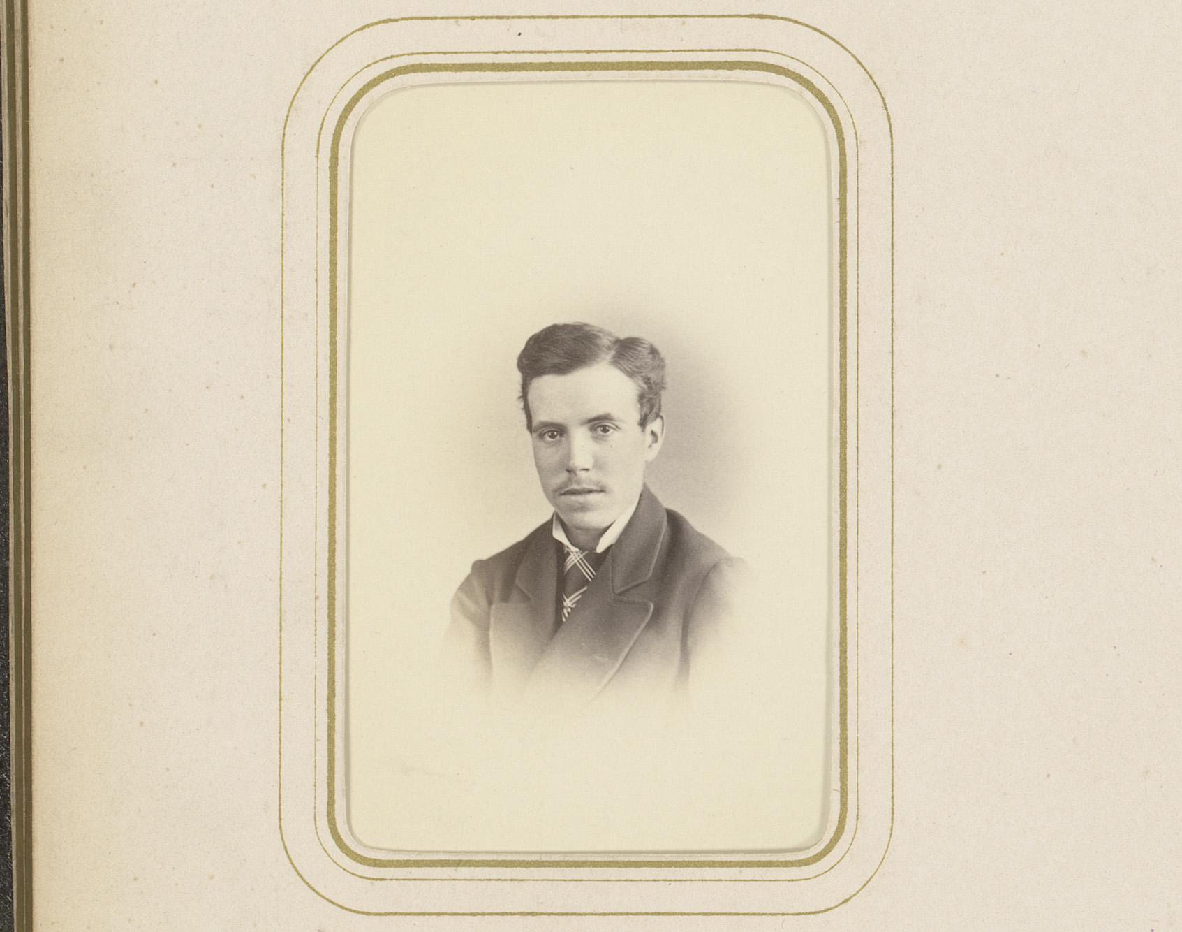 Portret van een vrouw in zwarte jurk met hoed, staan...