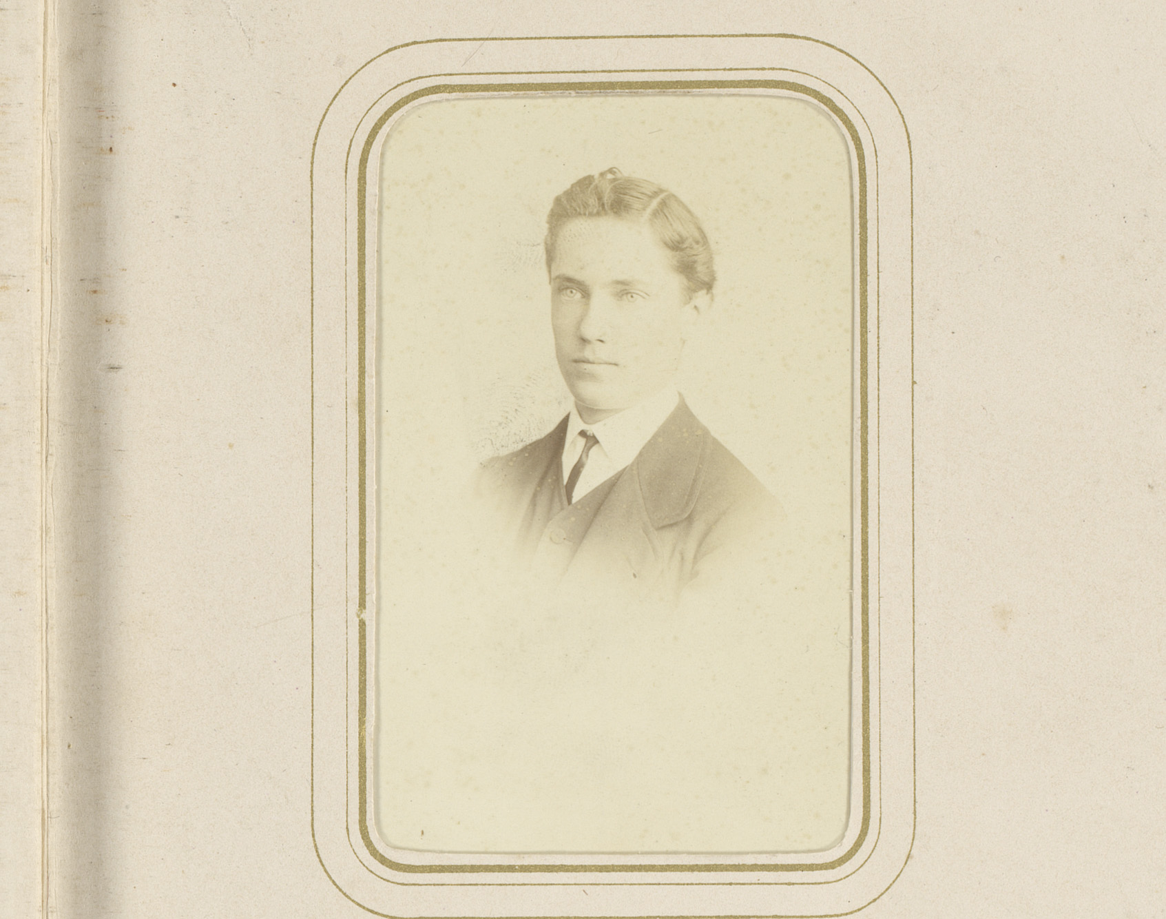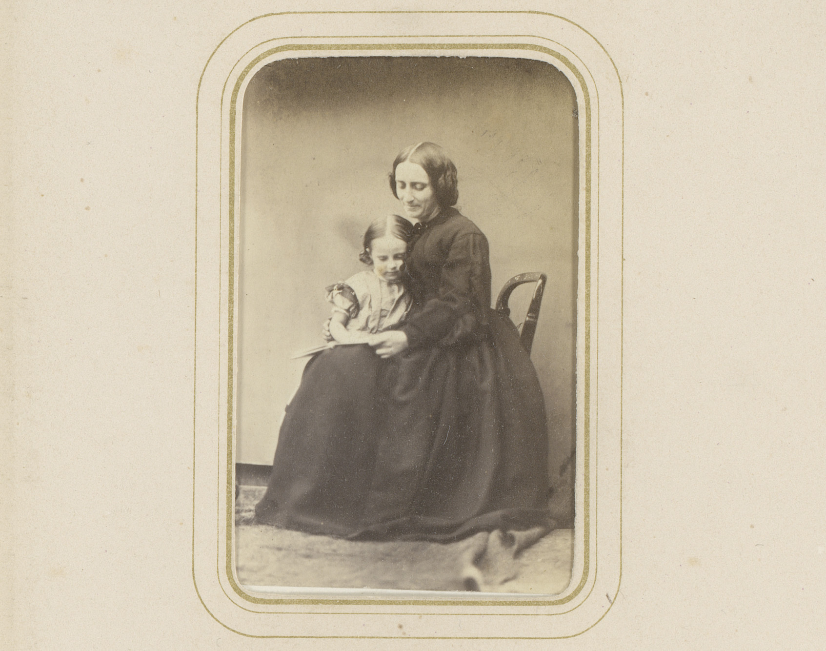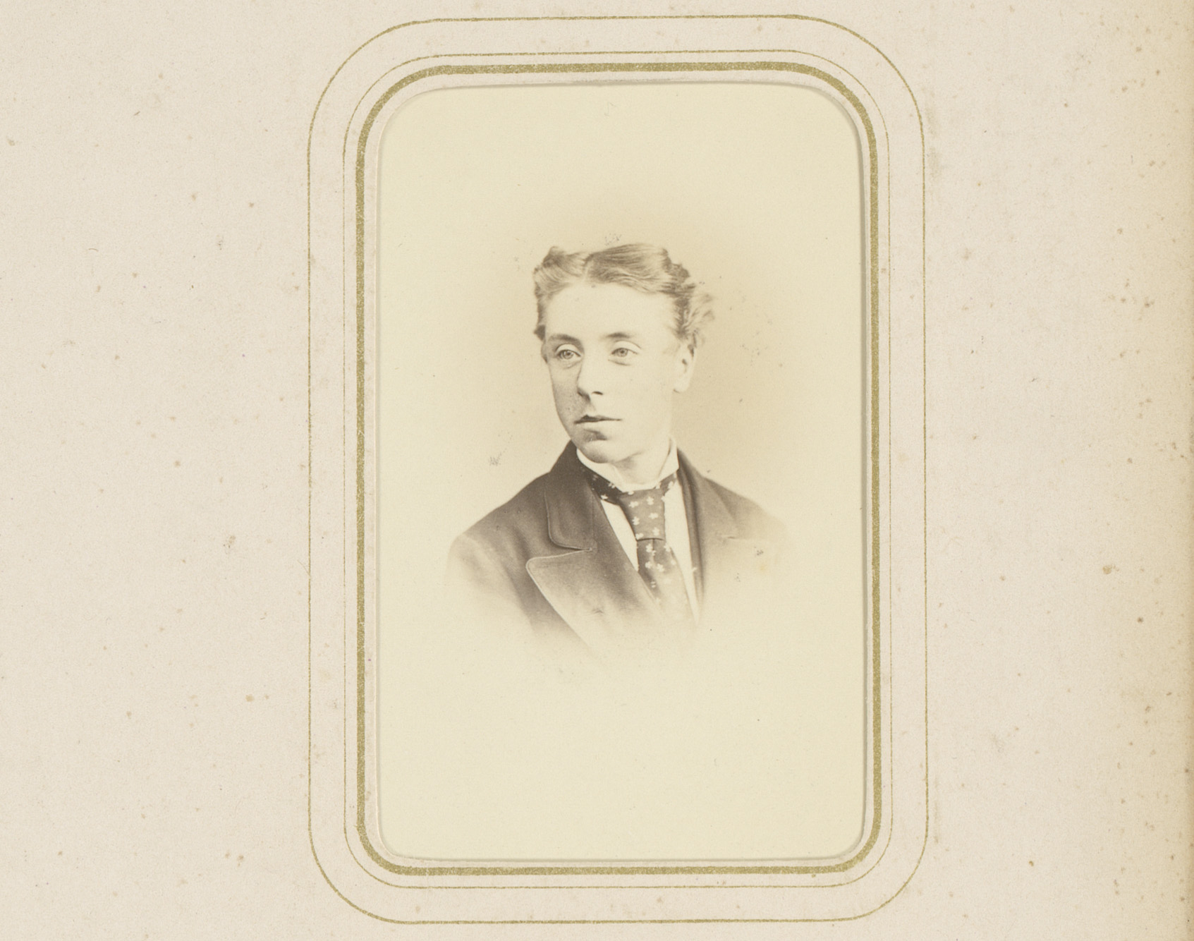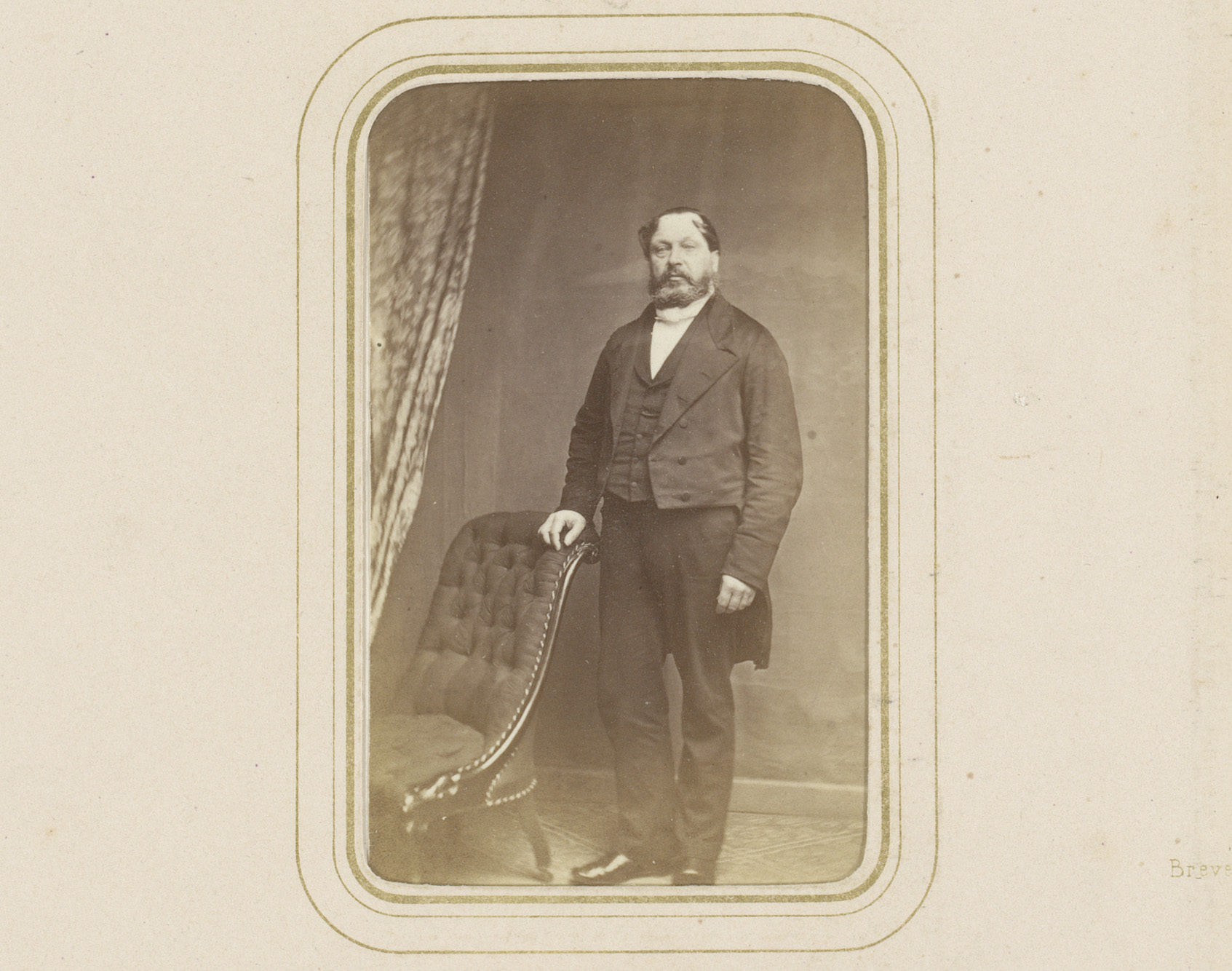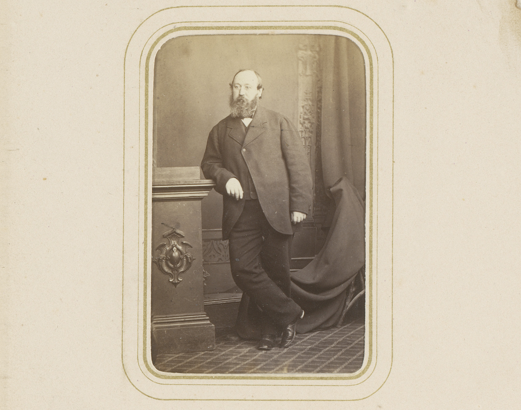 Portret van een vrouw in zwarte jurk met hoed, staan...