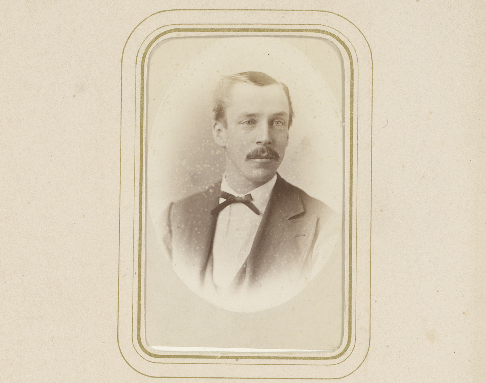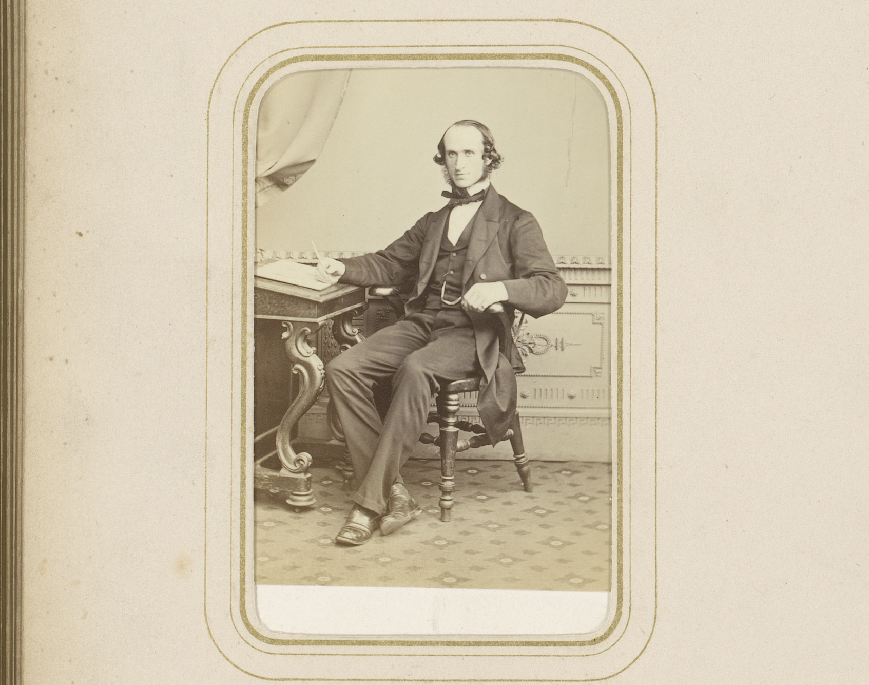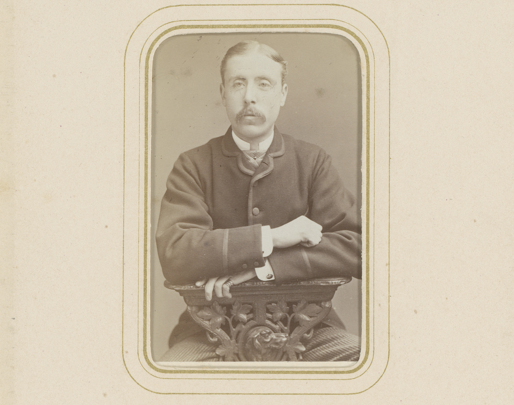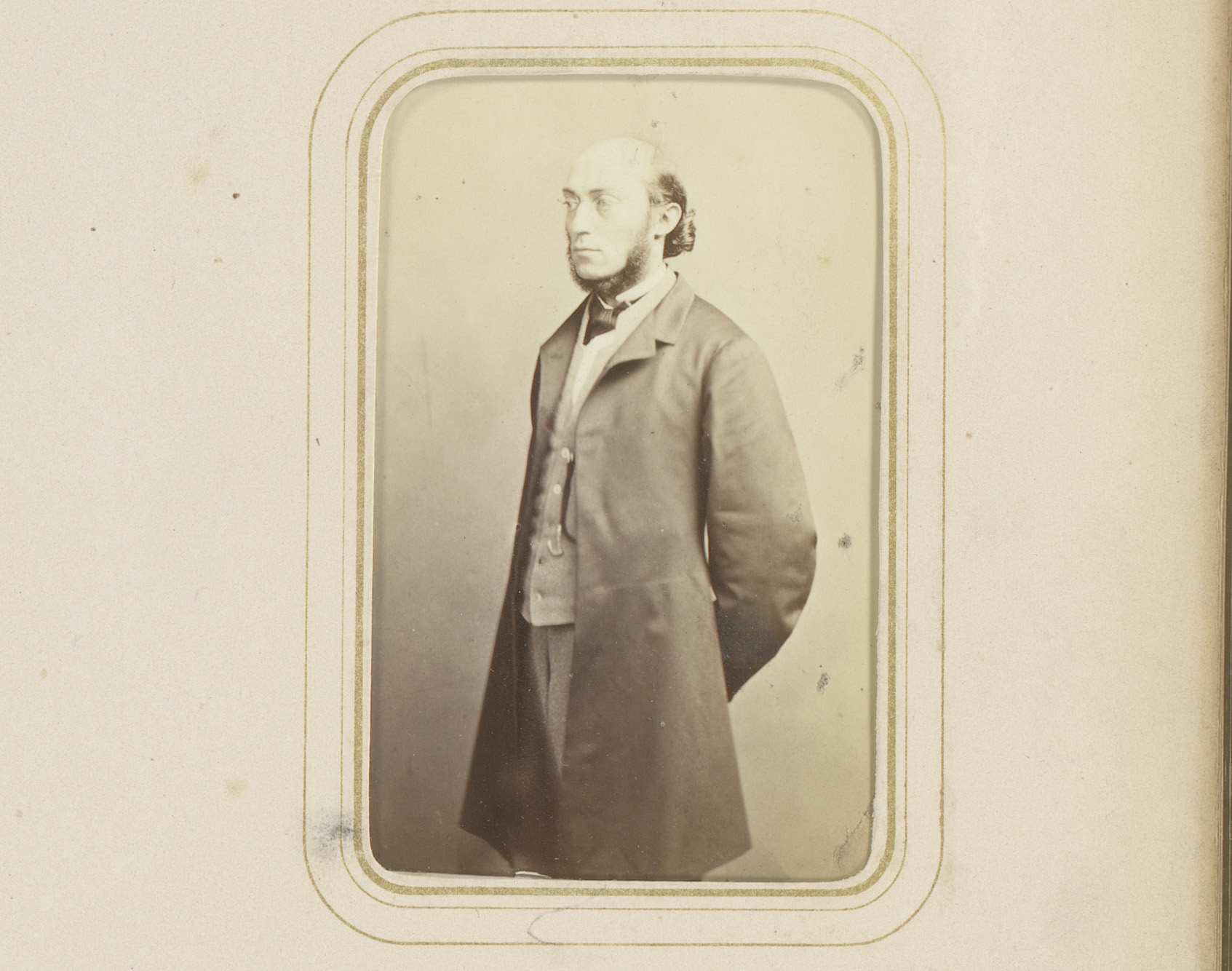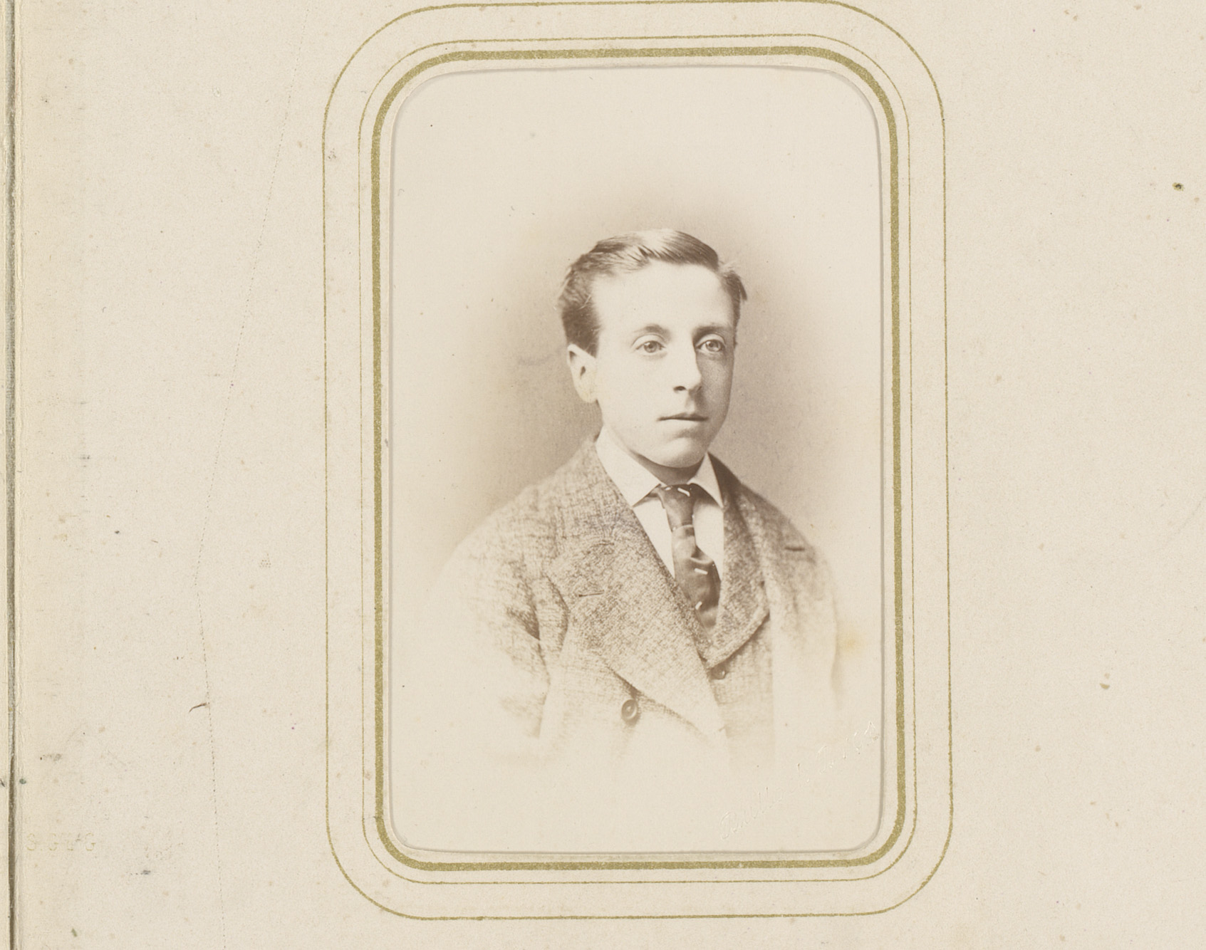 Portret van een vrouw in zwarte jurk met hoed, staan...