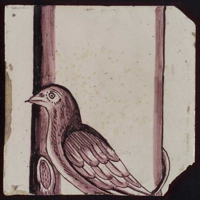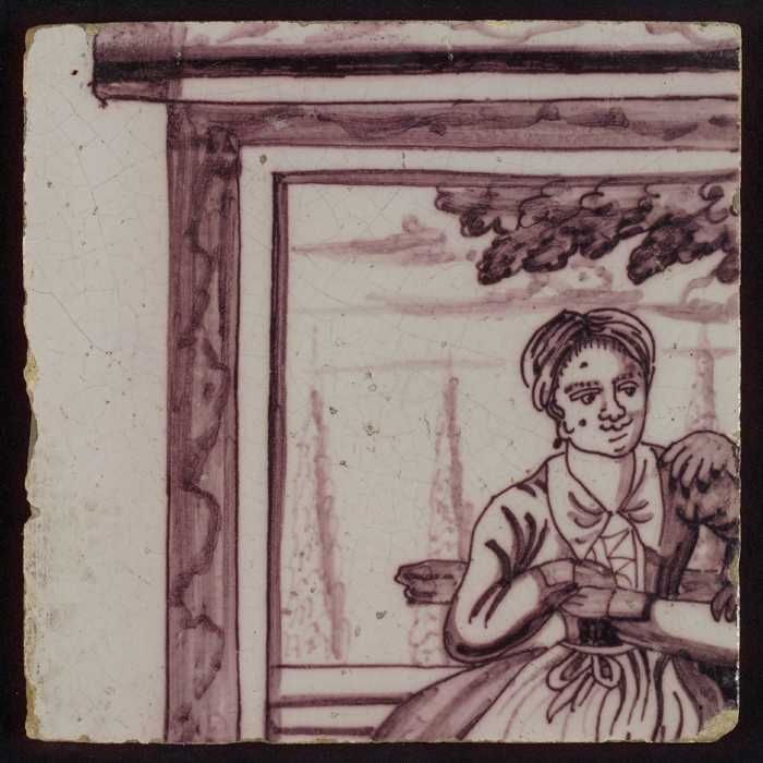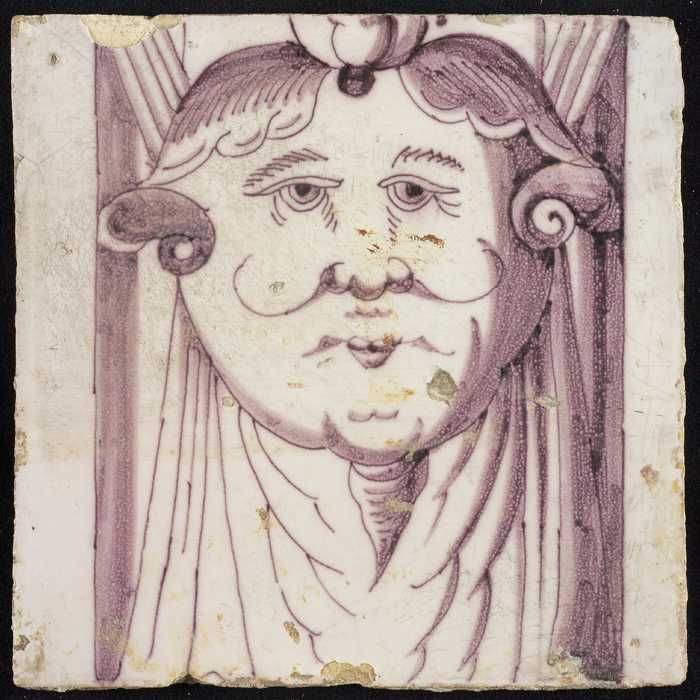Losse tegel uit pilaster met decor in paars, gelaat ...