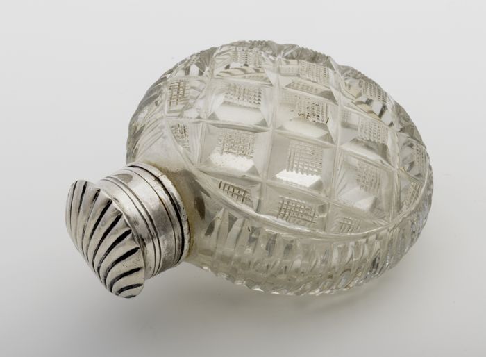 Rond glazen parfumflesje met zilveren dop