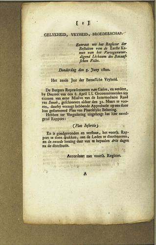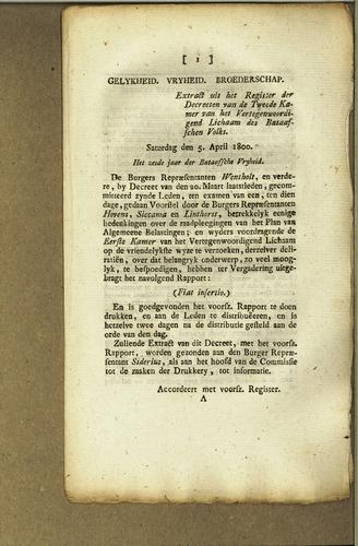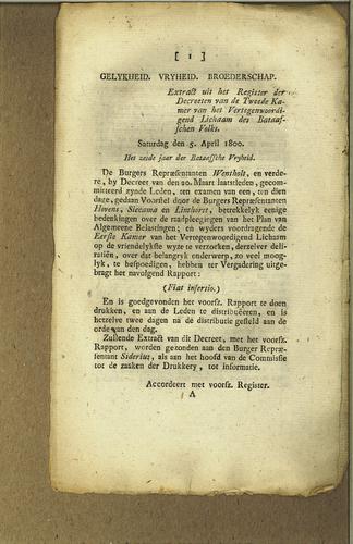 Plakkaat, invoering nieuwe belastingstelsel, 1800