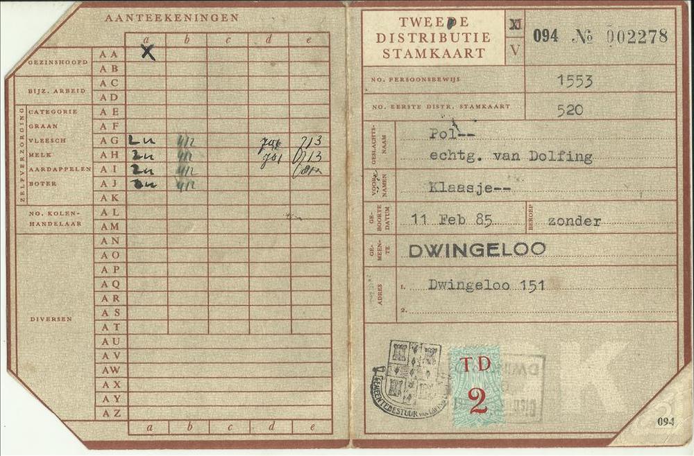 Tweede Distributiestamkaart op naam van Dolfing Klaasje